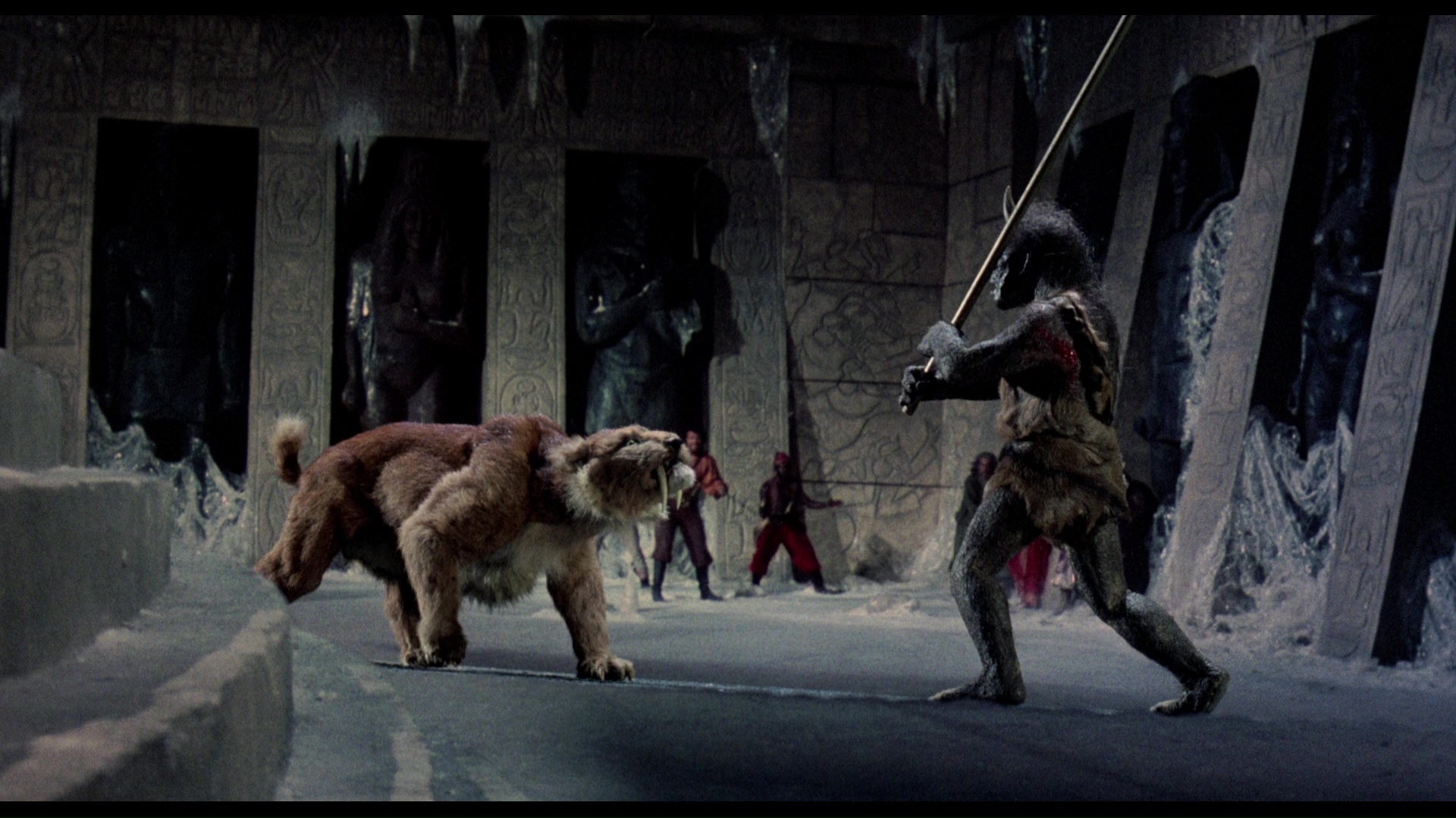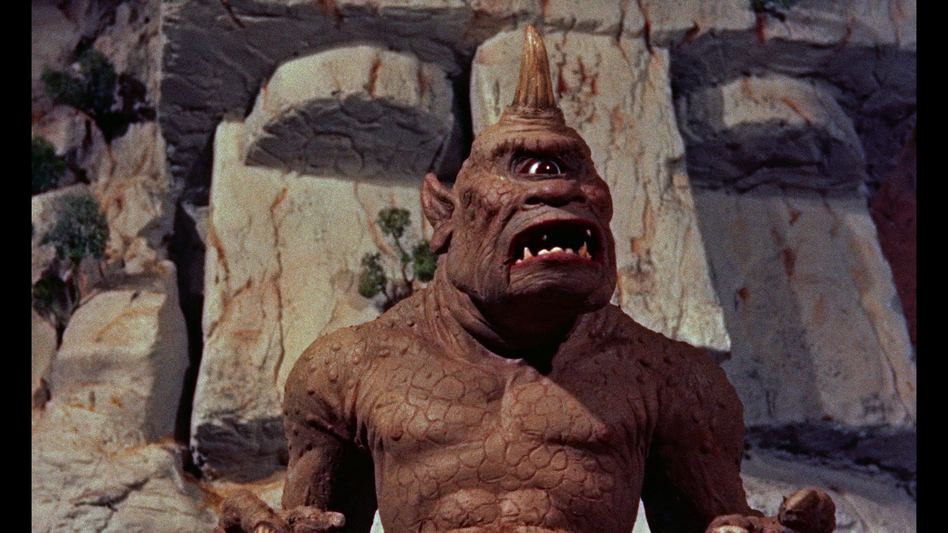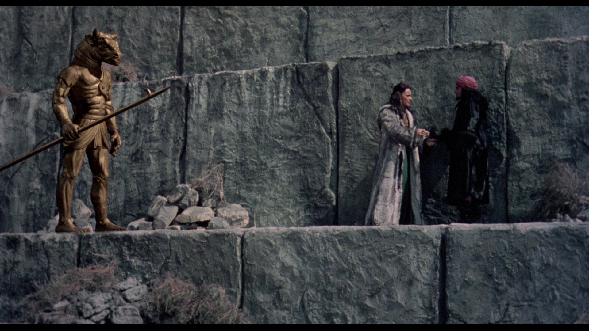 the"This Is Dynamation" featurette, and the theatrical trailer. Again the Indicator expands considerably in the extras department and features a sterling 2K-sourced transfer from Sony, which presents the film in the most immaculate quality possible as long as you take into account that there's more dirt and grit baked into the rear projection stop-motion footage than either of the previous two films. (Note: the first pressing featured a darker, more muted transfer compared to the Twilight Time, reportedly due to a different master delivered, but the more vibrant version is currently available as a repressed disc. Grabs in this review are from the second pressing. Anyone wishing to replace their current Blu-ray disc of SINBAD AND THE EYE OF THE TIGER should contact Powerhouse Films at info@powerhousefilms.co.uk providing proof of purchase and confirming the unique number of their limited set (as given on the rear of the bellband, 'xxxx/6,000').