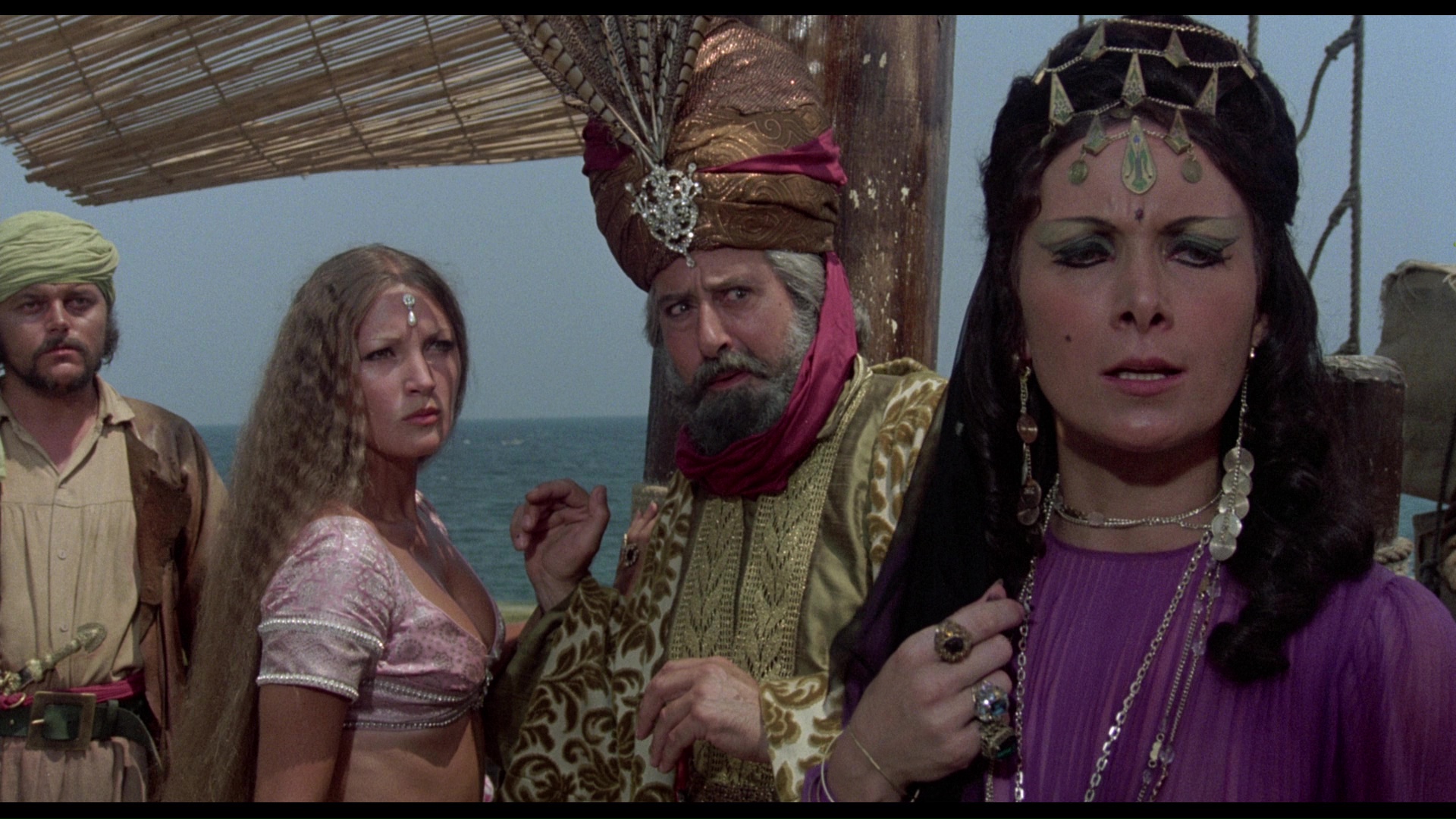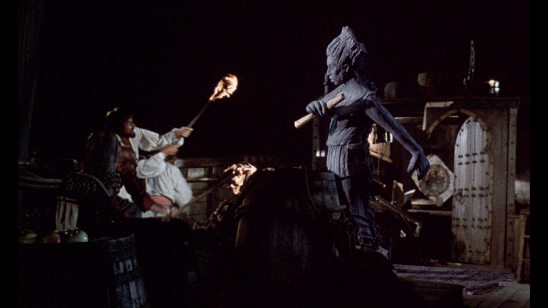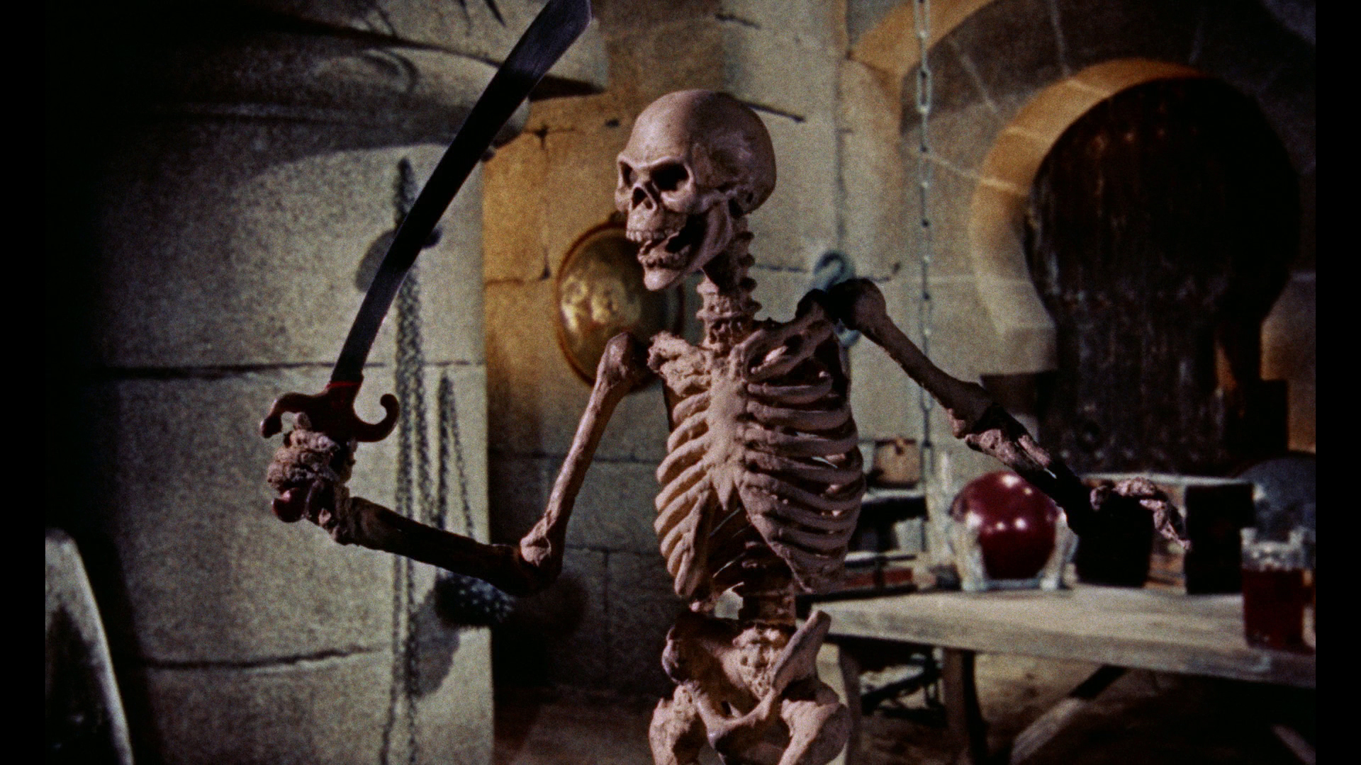 knockout with gorgeous colors, very vivid detail, and a rich sense of depth throughout. The Indicator release is from the same excellent source and looks very similar, albeit with an even higher bit rate that gives it a bit of an edge in motion. Audio options include the original mono track (LPCM), a DTS-HD MA 5.1 remix, an isolated score track (DTS-HD MA 2.0 stereo), with optional English SDH subtitles. Also included as an alternate track is a 90-minute 1970 audio interview with Harryhausen and producer Charles H. Schneer from the National Film Theatre in London. It's a very in-depth chat covering topics like the gradual decline of the star system, the level of violence acceptable in these films, the challenges of developing believable characters through Dynamation/Dynarama. The theatrical trailer is included along with an extensive sills and poster gallery, but there's a wealth of new video material here as well starting with a new Tom Baker interview, "Golden Years" (37m3s), which covers his career in fantastic cinema with a focus on this film including the other role he was originally intended to play, memories of the shoot in Spain, and the challenges of acting with swords, with thoughts on his theater work as well.