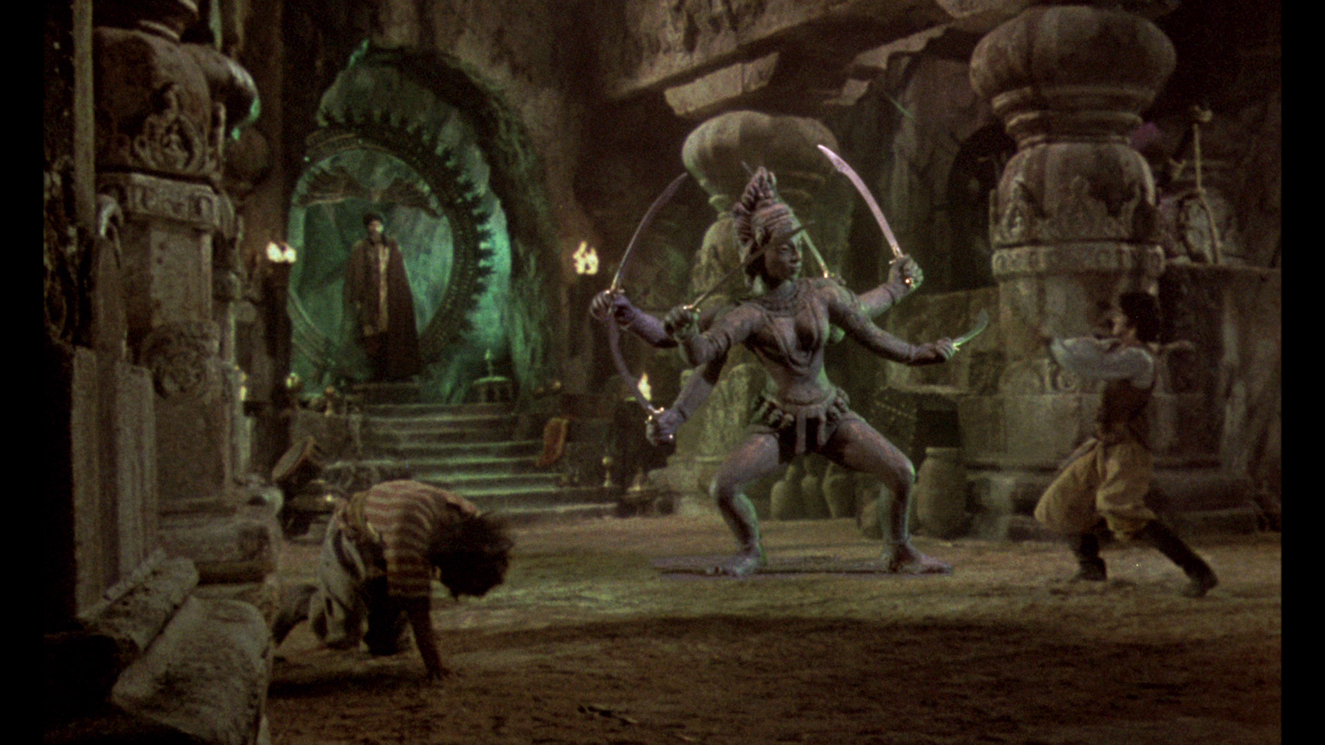 Sony brought the film to Blu-ray in 2003 as a standalone release and as part of a three-film Harryhausen set, thankfully opening the framing up to 1.66:1 and featuring a Dolby TrueHD 5.1 mix, Dolby Digital 2.0 stereo, and French and Thai tracks, with optional English (standard or SDH), French, Spanish, Indonesian, Mandarin, Thai, or Korean subtitles. The big extra here is an audio commentary with Harryhausen, visual effects artists Phil Tippet and Randall William Cook, author Steven Smith, and Arnold Kunert, covering the innovative effects in tremendous detail with notes about the trial and error process and the extreme amount of time