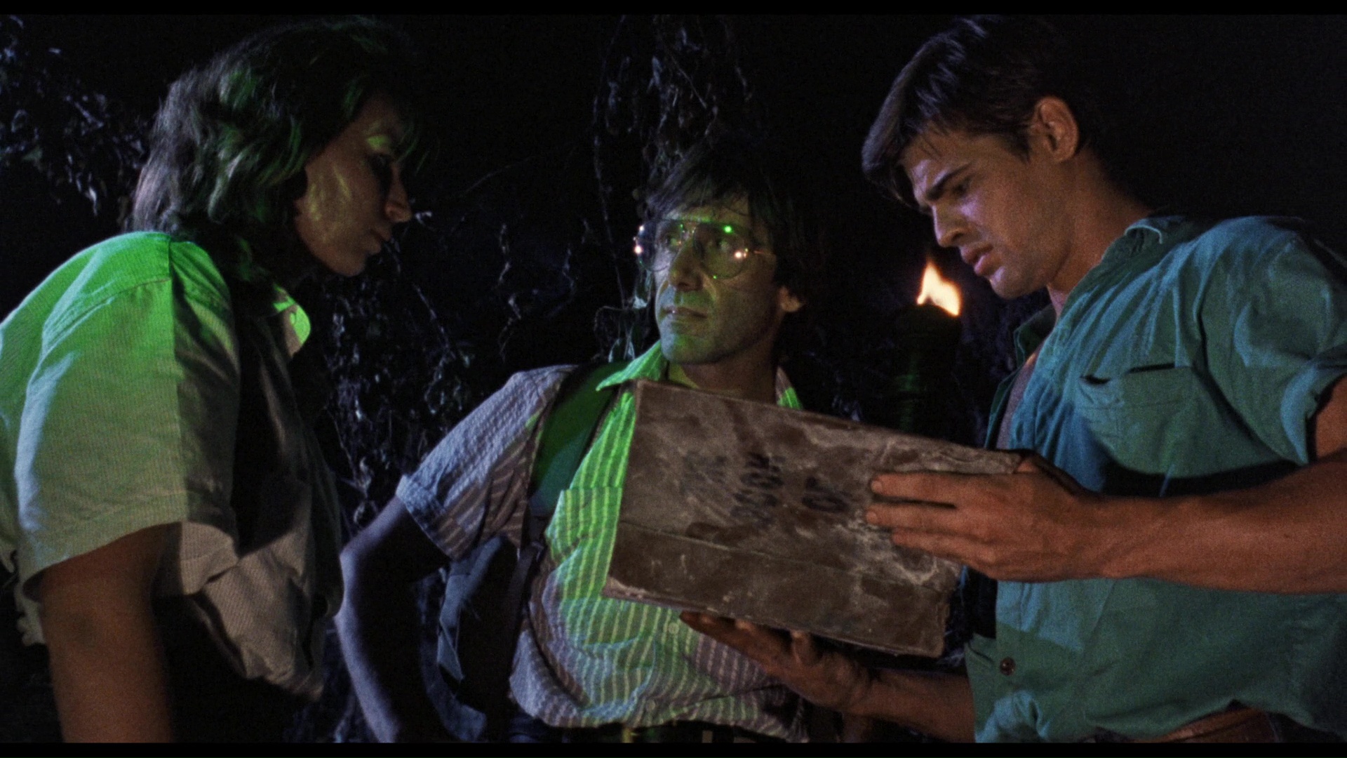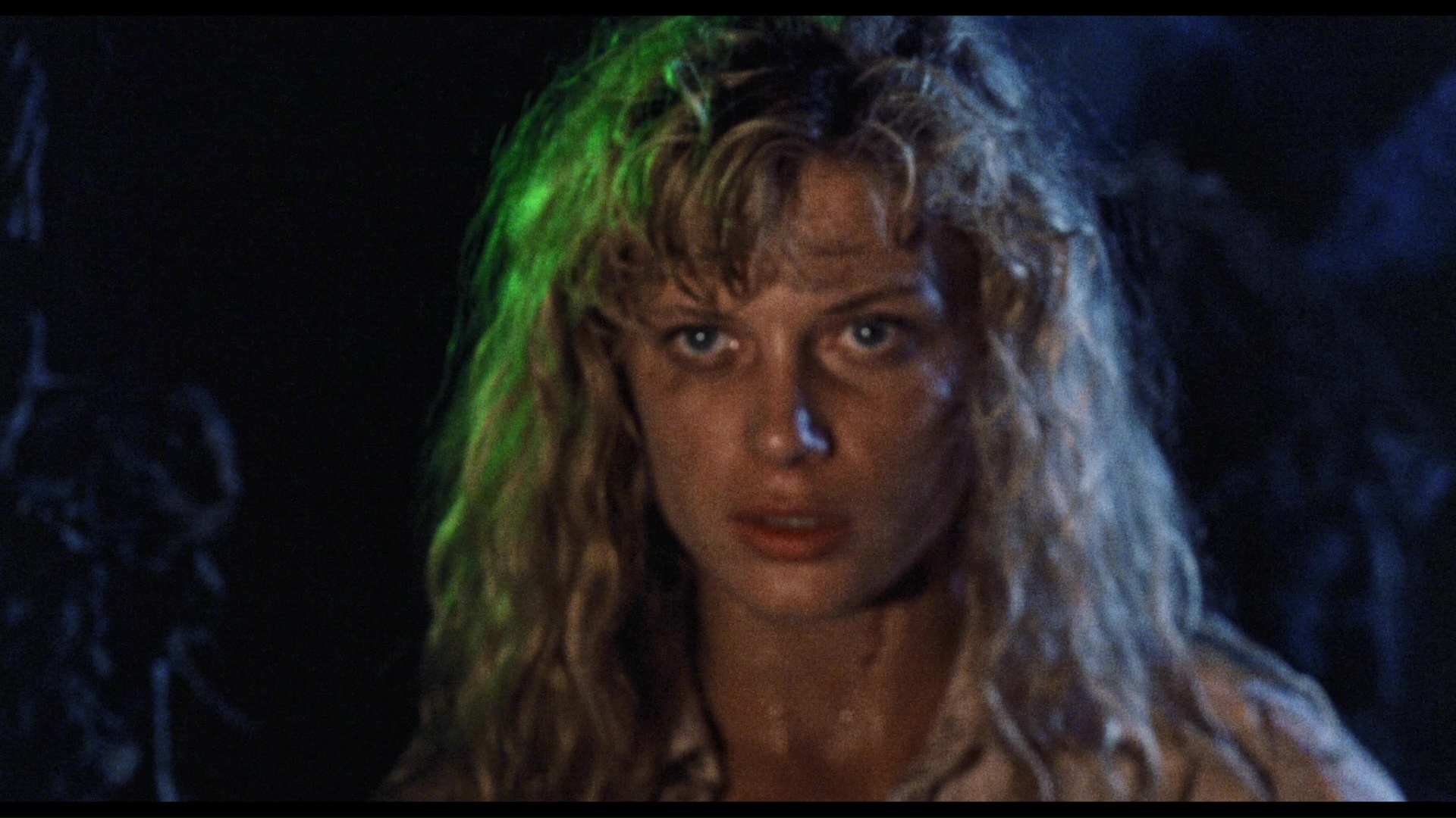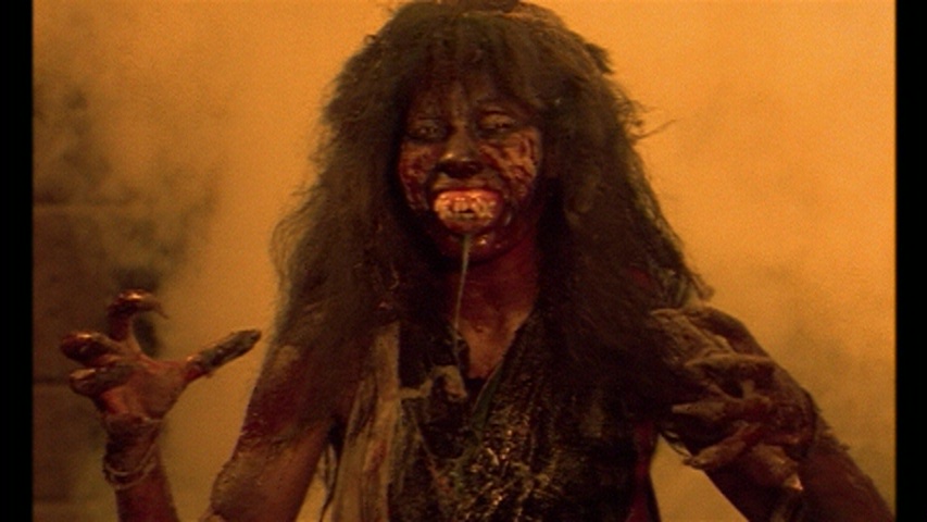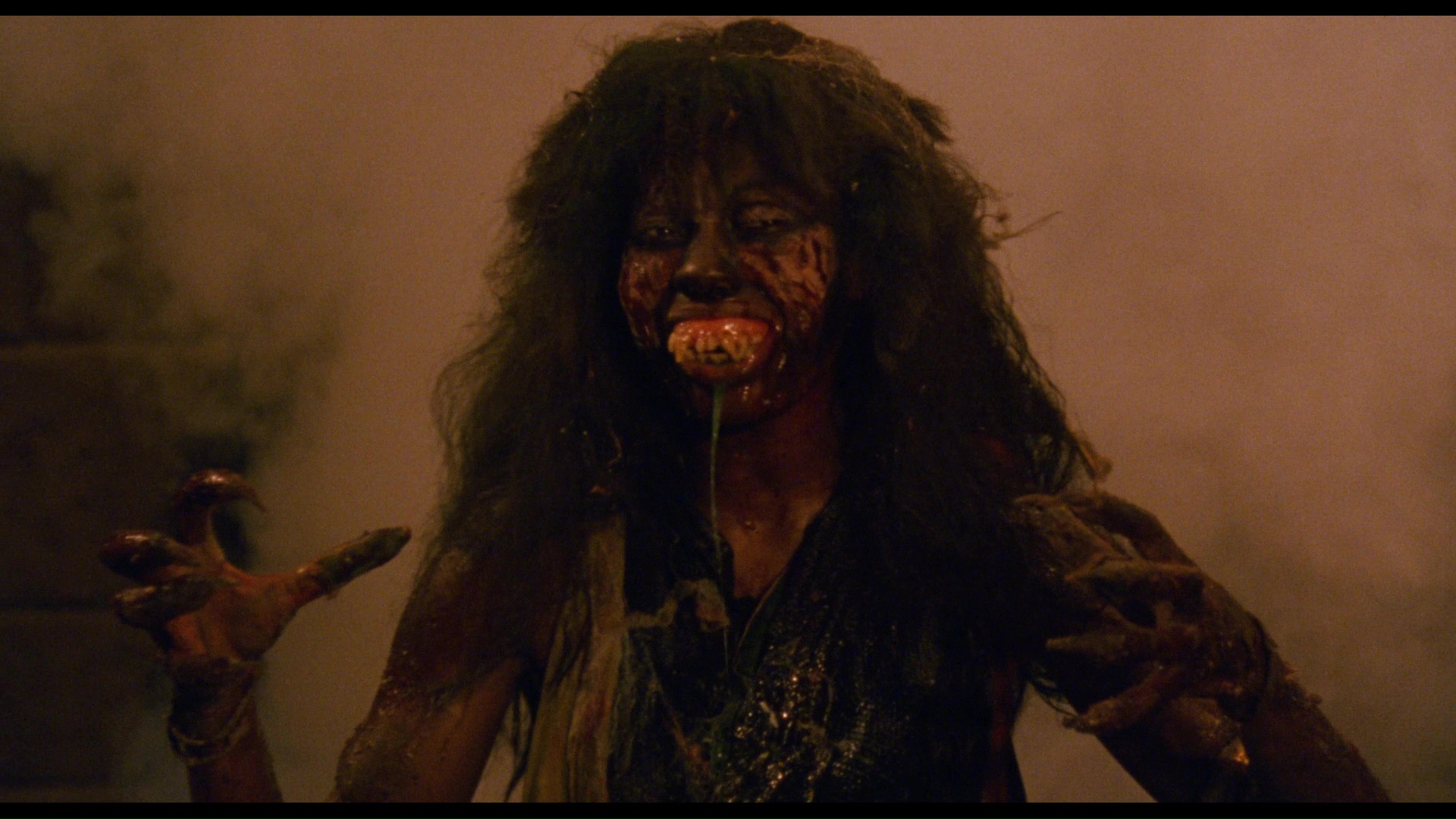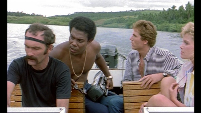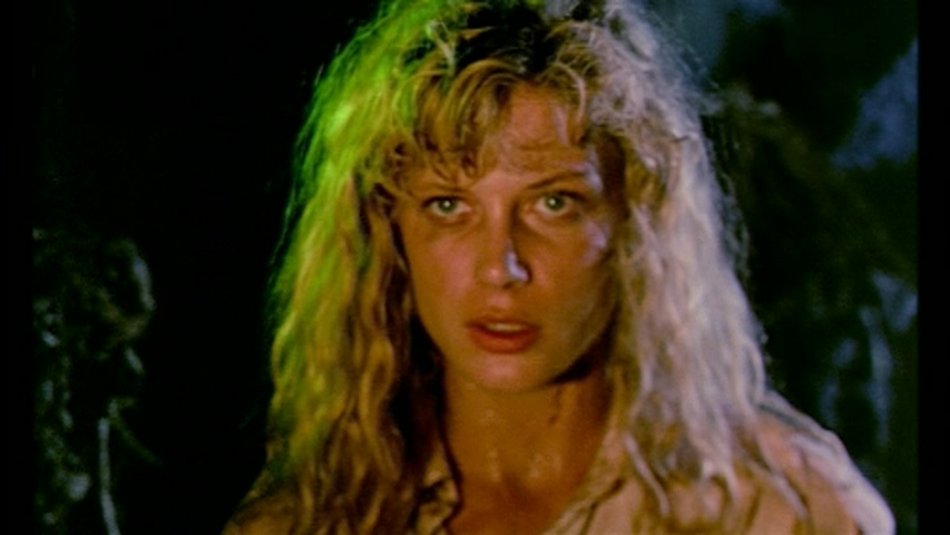 The goofiness begins full throttle in the obligatory opening set piece, which finds a hyperactive voodoo doctor fending off a gang of white interlopers by turning his drooling, zombie wife loose on them. The sole survivor returns two decades later as pretty Candice Daly, who for no particular reason tags along with a band of mercenaries led by the stoic Chuck (switch-hitting porn star Jeff Stryker, billed as "Chuck Peyton"). Of course, she isn't aware that this is the same island of doom until it's too late when they're all besieged by the hungry undead. Our heroes run into a band of inept scientists who have accidentally increased the zombie population, resulting in a claustrophobic voodoo showdown strangely reminiscent of the "magic circle" bit from The Devil Rides Out, only sillier. Eventually it all comes down to a handful of survivors and an ultra-moist finale "borrowed" from the "other" Zombi 3, Burial Ground.