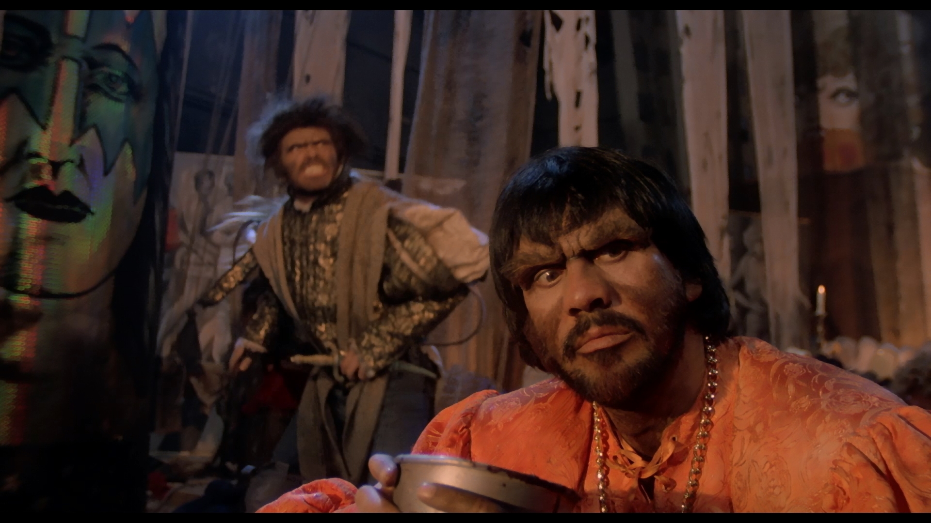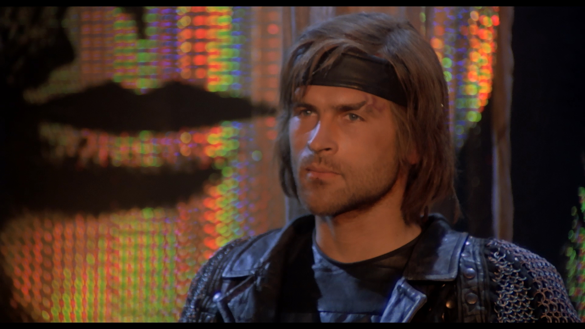 (10m20s), "Future Is Now," speaking in Italian with English subtitles about working with both Sergio and Luciano Martino including learning all of her English dialogue by heart despite the "Babel" feeling on set and working inside the wild futuristic sets. His comments about the film's matte painting of the Twin Towers are especially fascinating and poignant, too. The always colorful Eastman gets a fairly low-key interview for him out of his batch of Code Red featurettes, as "Meet the Apeman" (5m37s) finds him speaking positively of both the finished product and working with Martino even if he was "distant." In "Hook Man" (20m31s), Scalondro gets an extensive opportunity to cover his dramatic career in Rome, the challenges of trying to work with a hook hand and convincingly gouge out someone's eyes, and his motorcycle skills that came in handy during the shoot. Finally, set designer Massimo Anotello Galeng gets his turn in "Welcome to the New Middle Ages" (11m21s) explaining how he aimed to bring a "metaphysic abstraction" to the film by combining futuristic elements with the medieval past. Shortly after the Code Red release the film also hit UK Blu-ray and DVD from 88 Films; that edition is not available for review at this moment for comparison, but it features different interviews with Martino, Galeng, and a joint one with Galeng and Ginacarlo Marin.