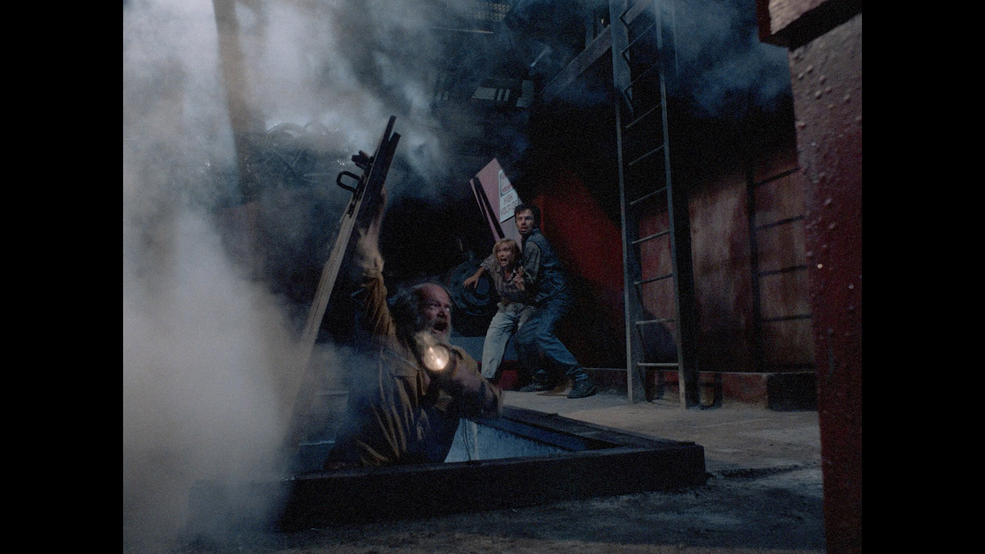 boat they've charted get spooking when an armed helicopter squad shows up to scare them away, so Lee and Jane have to cough up their last $1,000 to take a lifeboat to shore. There they whip out a video camera to capture the destructive shenanigans of Houston-based company E-Chem, whose evil Col. Kovacks (Napier) is dumping very dangerous levels of toxic waste into the local volcano. When Lee gets captured, Jane seeks help from nearby "snake farmer" Bob (Bosch) along with disillusioned company scientist Dr. Geoffrey (Margheriti mascot Alan Collins, a.k.a. Luciano Pigozzi) for a rescue mission that goes awry thanks to something gigantic and clawed punching its way around in the lower regions of the building.