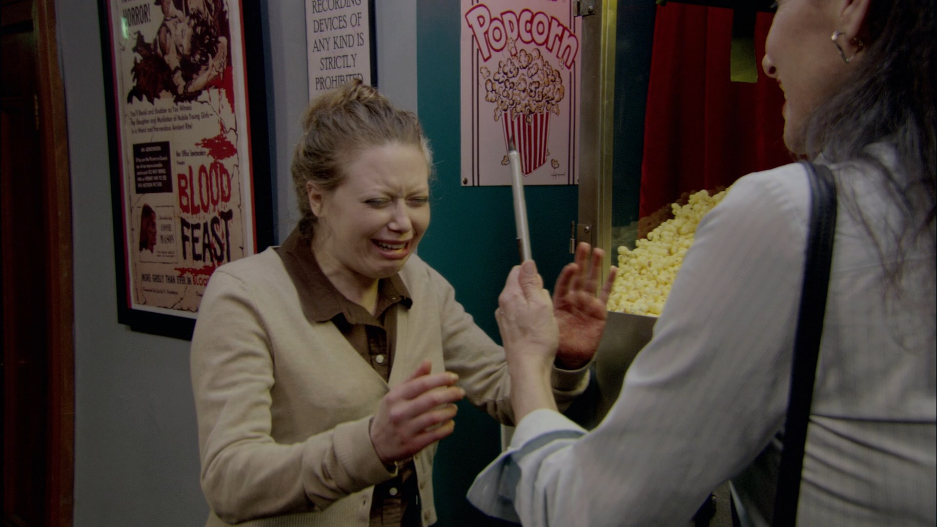 Years later, the grown Deborah (Lyonne) is working as a librarian and trying to find a way to keep her dad's flailing theater open after his passing. When Tammy pushes her too far, Deborah bloodily stabs her to death at the concession stand and, in