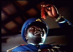 After a quick thumbnail history lesson about Uganda, we're introduced to our villain (portrayed by lookalike Joseph Olita) as he rises to power following the previous ruler, Milton Obote. Visiting British and Israeli diplomats are openly courted by Amin, who horrifies occasional visitors with the two severed heads he keeps stashed in the refrigerator. Soon he decides to undertake a ritual of "ethnic cleansing" on the Asian population, culminating in the showstopping sequence in which Amin cannibalizes one of the corpses. Using Adolph Hitler as his role model,