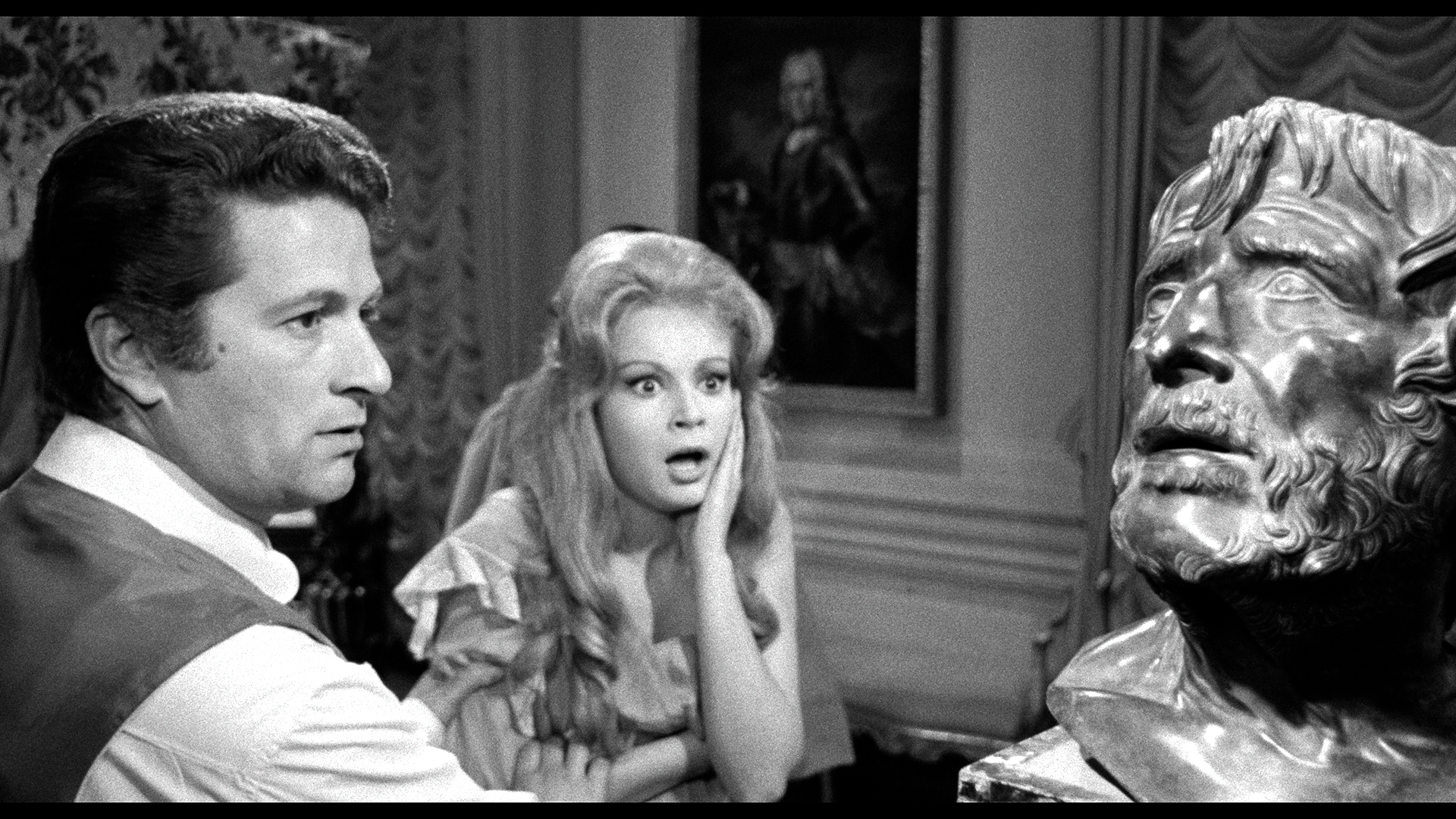 shades of ruby red looking particularly nice. Two reels display a thin line of orange-colored damage popping in and out a few times, most egregiously around the 36-minute mark. The English track, which works pretty well since that's what almost everyone spoke even if they were looped later, is presented in DTS-HD MA 2.0 mono and sounds okay as well. The film can be played in a "Katarina's Bucket List" mode with hostess Katarina Leigh Waters as both herself and her twin (of course), trying to find directions through the woods and taking possession of a really big ring before supplying the usual rundown of the major players in front of and behind the camera. She also has to deal with diabolical foodstuff, and that errant Japanese footage turns up tucked away at the end as well.