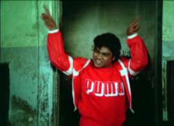 is corrected with Mahakaal, the headlining entry in Mondo Macabro's Bollywood Horror Collection, Volume 3. The opening sequence of this unabashed imitation of the Wes Craven classic kicks off with a young college student, Seema, stalked through a creepy, chain-filled subterranean room by a disfigured maniac wielding a nasty, razor-fingered glove, only to wake up in her bed and find scratches on her nightgown and arm. The next day we meet our heroine, Anita, who hangs pictures and makes out with her boyfriend, Prakash, when not prancing around with him engaging in random musical numbers. Meanwhile a tough guy named The Boss and his posse have their eye on Anita, who also hangs out at a cafeteria run by Canteen, a flamboyant Michael Jackson wannabe who prances around in front of a big MJ Bad poster, kisses his male clientele on the lips, and brags about getting a part in the new Ramsay Brothers movie (hey, maybe Wes ripped this off for Scream!). Turns out Seema is Anita's best friend and tells her about this Freddy wannabe (who looks the same except he has a mullet instead of a big hat), and soon Anita's having similar nightmares about a spooky little girl in a white dress and Hindi-Freddy chasing her while his face melts off. The next morning The Boss and his boys try to gang rape Anita in broad daylight on campus by, uh, spraying her with a garden hose until Prakash shows up to kickbox the bejeezus out of them. To get over the trauma, Anita and her pals (including Canteen, of course) decide to head out for a picnic ("where we can sing, dance and have a good time!"), where they perform a big musical number about - what else? - picnics. Unfortunately their car breaks down, so the fun-loving kids have to stay overnight at a weird hotel run by a goofy manager with a Hitler mustache who enjoys peeping in on his guests while they paint their toenails. That night, faster than you can say "Tina, come to Freddy," Seema is butchered in her sleep by dozens of claw-gloved hands bursting through the carpet as her boyfriend watches. Soon Anita's having horrible daydreams about a white-eyed Seema following her in a body bag, Canteen has a daydream where he turns into a Paul Naschy lookalike named Shahenshah (with his own theme song), and Anita's parents reveal the horrible truth about Shakaal, "a foul stain on the human race" who killed children to increase his black magic powers. Turns out they killed him after he murdered Anita's older sister (in a very stylish, Very Ramsay flashback), and everyone must race against time before Anita becomes the demon's next victim.