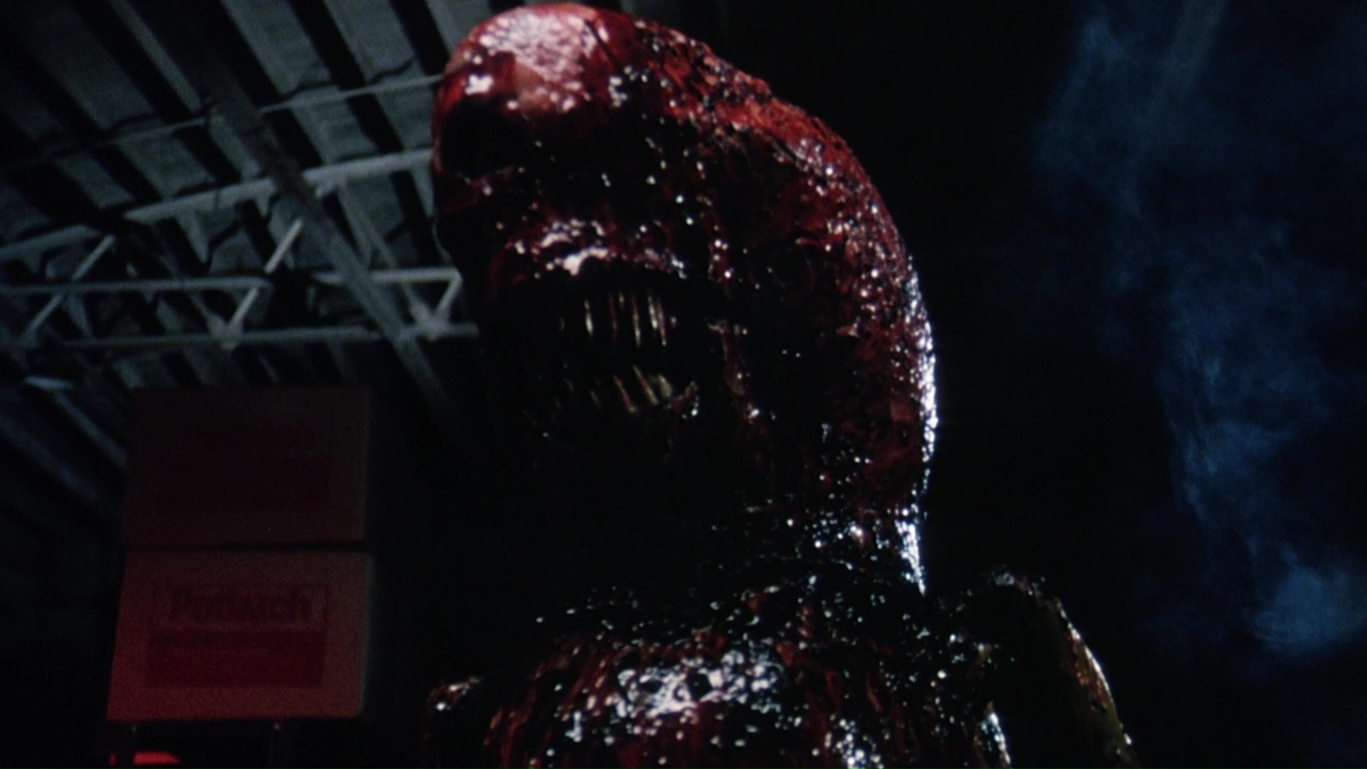 The BeingIn 2017, Code Red brought the film to Blu-ray with a transfer that presumably does what it can with a feature that still looks very dark and grungy. There's far less element damage here and detail notches up quite a bit, but the appearance looks like it's going to be modest no matter what. The English DTS-HA MA audio sounds okay for what amounts to a very basic sound mix. Fortunately the film has been outfitted with a couple of new extras, starting with a new audio commentary by Kong herself. Among other things she reveals that she originally intended Harry Dean Stanton to play the lead, pontificates on the heavy amount of slime, and explains the reason her films have tended to date very well. (It sounds like Marc Edward Heuck chimes in here and there as well, though he isn't introduced at the beginning.) As always she's smart and funny, making for a good 80-plus minutes of chatting. A second commentary is included with actor and comic Johnny Dark (also moderated by Hueck, far away from the mic), focusing on both his career in the heyday of comics like Robin Williams and his memories of Osco and Kong. The original trailer is included (in very lo-res quality) along with bonus ones for Sole Survivor, The Dark, Slithis, and Devil's Express.