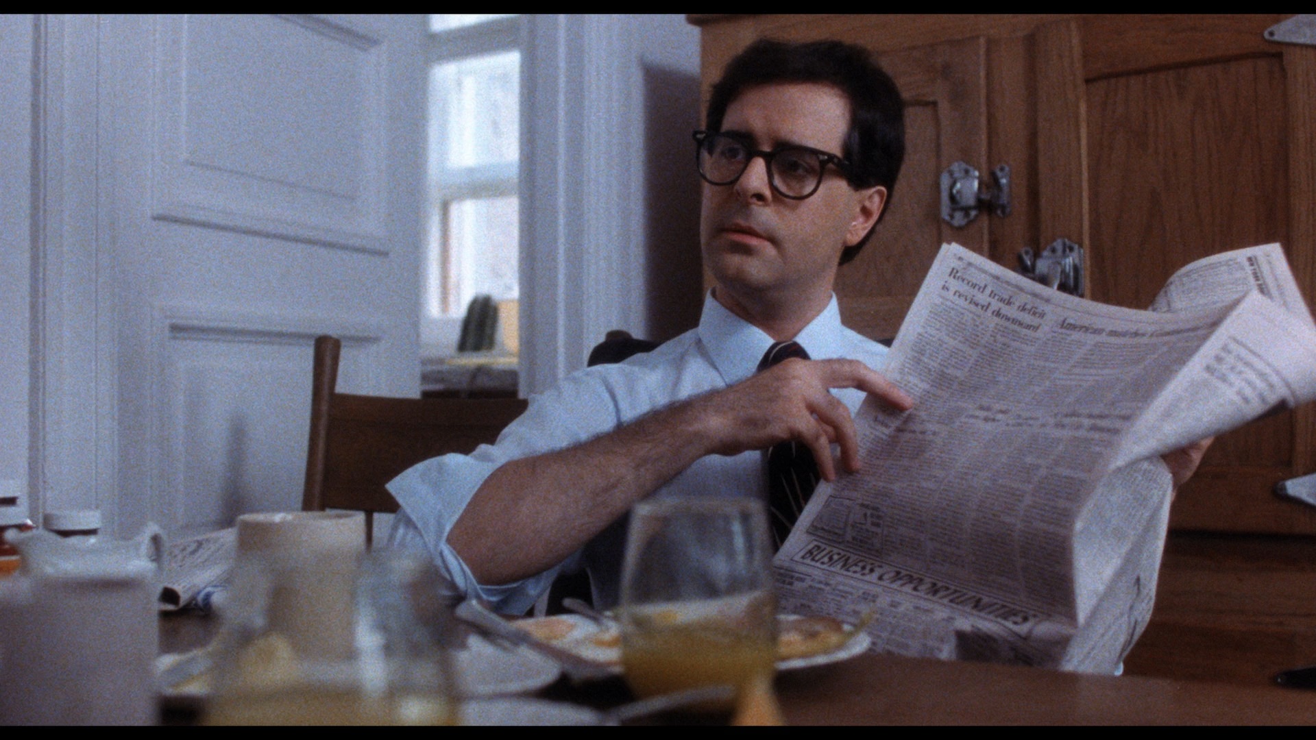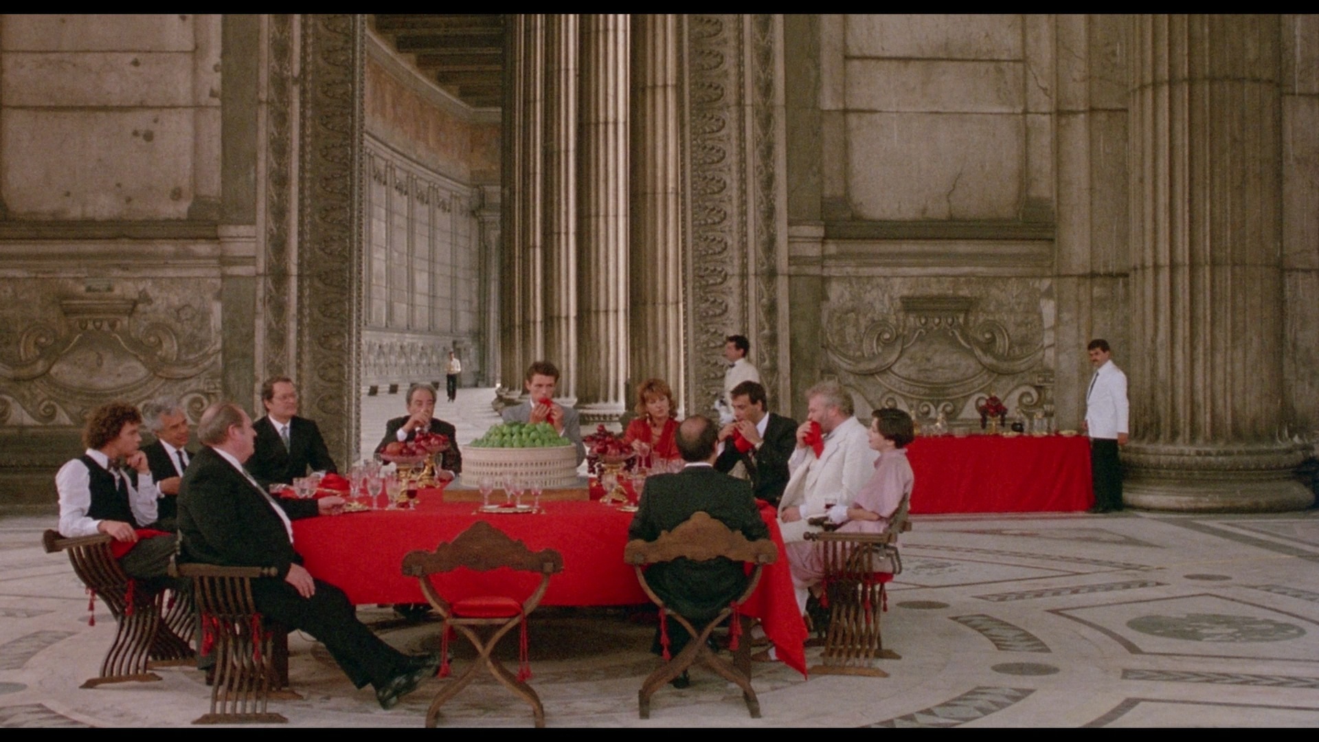 2K scan and restoration from the original 35mm camera negative. The prior HD presentation was already excellent so the difference here isn't tremendous, but the grain is managed better here and looks more natural while reds are more controlled and don't glow in a few spots like they do on the BFI (see fifth comparison grab below). The DTS-HD MA 2.0 English stereo track sounds as good as it always has with fine separation, and optional English SDH subtitles are provided. A new commentary track with Eugenio Ercolani and Greenaway obsessionist Tony Strauss covers everything you could possibly want to know about the production including Greenaway's reasons for distancing himself from it in later years, the numerous ties to his other films, the Italian production crew involved, the themes of architecture and the body, the merits of the score, and tons more. In "Stately Progress" (18m3s), still-busy editor John Wilson chats about his career path that led to the COI at the same time with Greenaway, the move to features with Draughtsman, working out the themes to this film upon seeing the footage which he couldn't see until it was all finished, the role of fine arts and especially drawing in this film and their others, and his overall working process with Greenaway which continued through Cook. "Caput Mundi" (28m31s) is an intriguing interview with architect Gianpaolo Ercolani (and some photogenic cats) about Greenaway's evolving relationship with Rome and its surroundings, his own introduction to Greenaway via Draughtsman, the boldness of casting Dennehy, the conceptual trademarks of Étienne-Louis Boullée's architecture, the heavy number of pick-up close shots done later in England, the doctrines behind the discipline, and the role of signature buildings here like the Pantheon. An insert booklet features an essay by Scout Tafoya, "The Cenotaph and Cake," placing this film in context with Greenaway's oft-stated theories about cinema and the ways one of its central architectural images reflects on the larger purpose of the story.