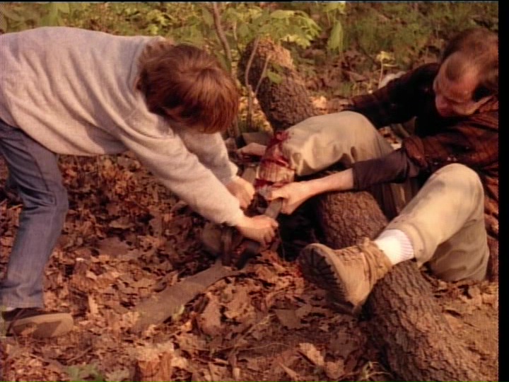 testy writer John DeWolfe (Robertson) meets up with his brother-in-law, Ross (Hamilton), a sheriff whose daughter has gone missing. Since we see a particularly salty Bible pusher get whacked in half with a scythe as soon as John pulls in, it's clear that the cannibal kid plague is spreading rapidly with the incredibly inept parents either unable or unwilling to do much about it. As the body count piles up, it's clear this will only end in tears -- and a lot of blood.