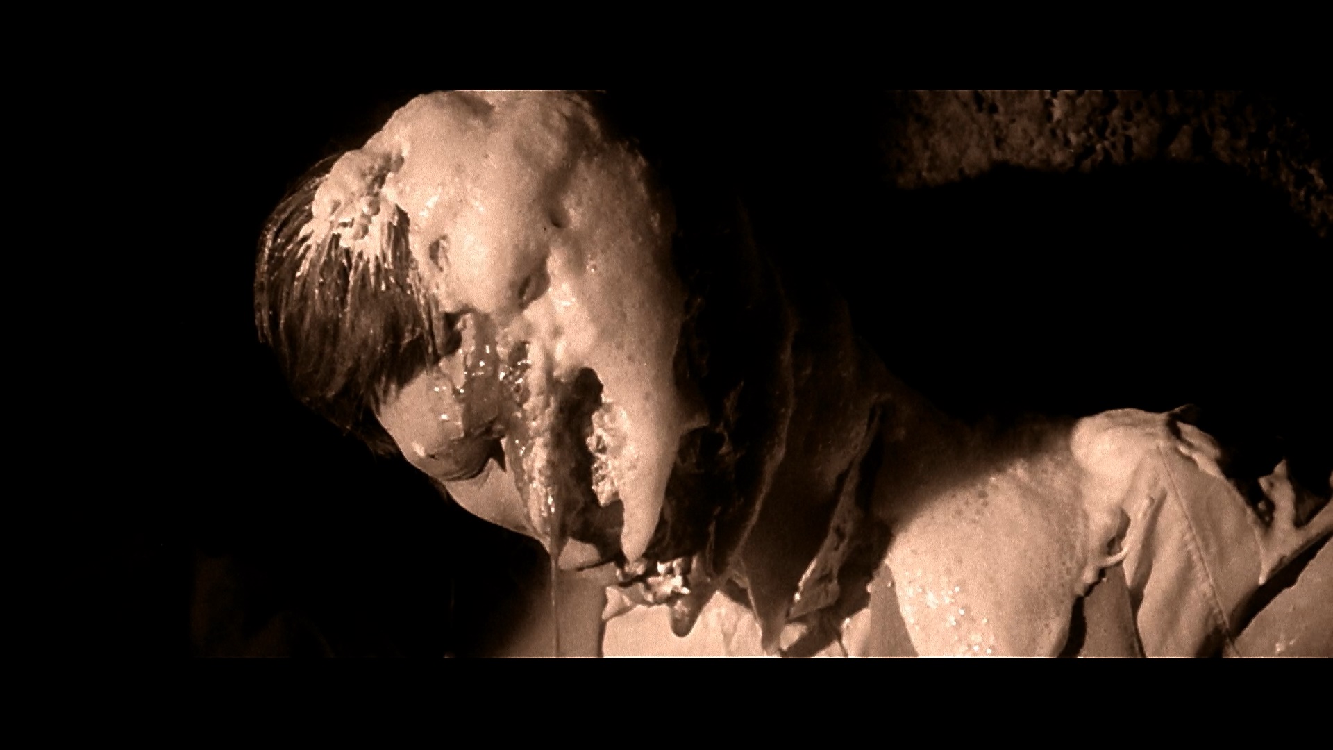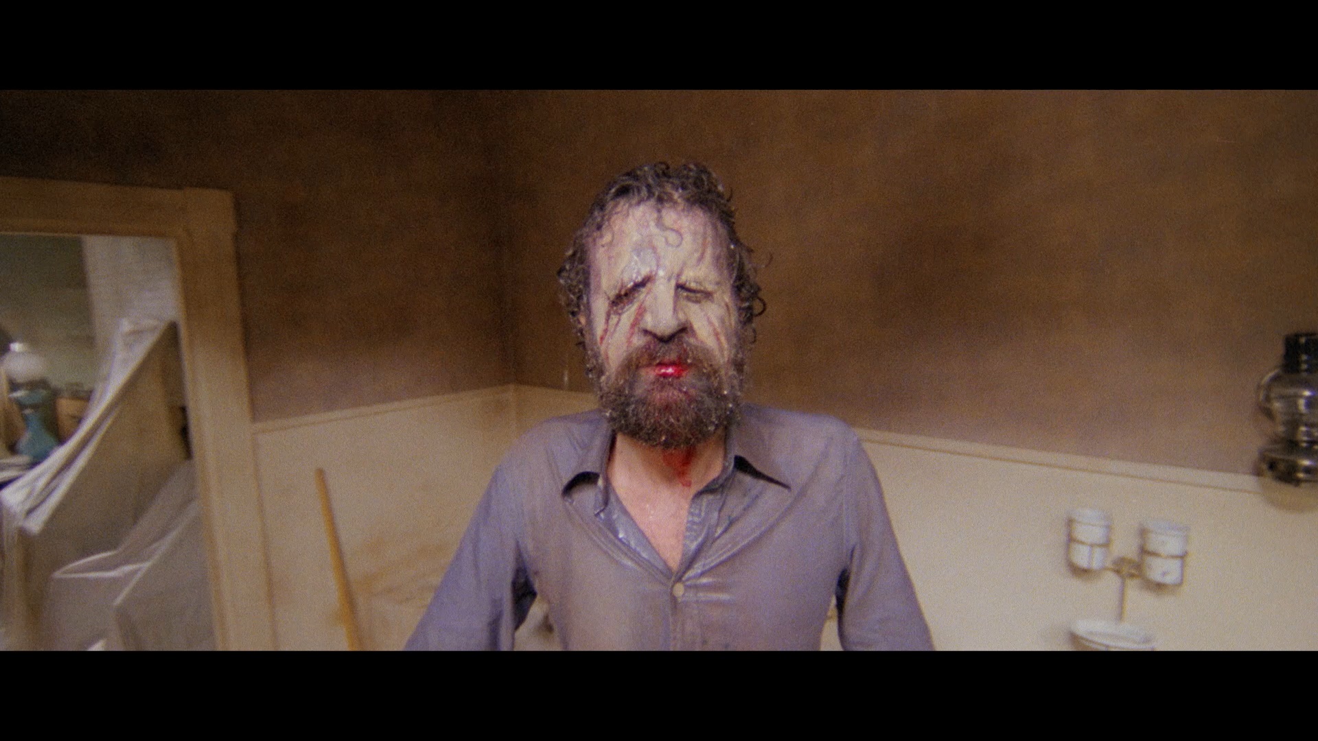 The special effects by splatter maestro Giannetto De Rossi are also effectively repellent, with eyes popping from their sockets and faces blending into mush. The legendary, painfully slow tarantula attack sequence is both stomach churning and darkly hilarious, with squeaking arachnids covering one poor victim and casually removing portions of his face with their... teeth, apparently. All of Fulci's most noteworthy collaborators attack this film full throttle, with the amazing Sergio Salvati pumping up the atmospheric lighting across the scope frame and Fabio Frizzi manipulating piano solos and electronics into a tremendous music score. Forget what mainstream critics like Roger Ebert had to say; this film is a heartfelt poem for horror fans and, most importantly, a The Beyondgory good show.