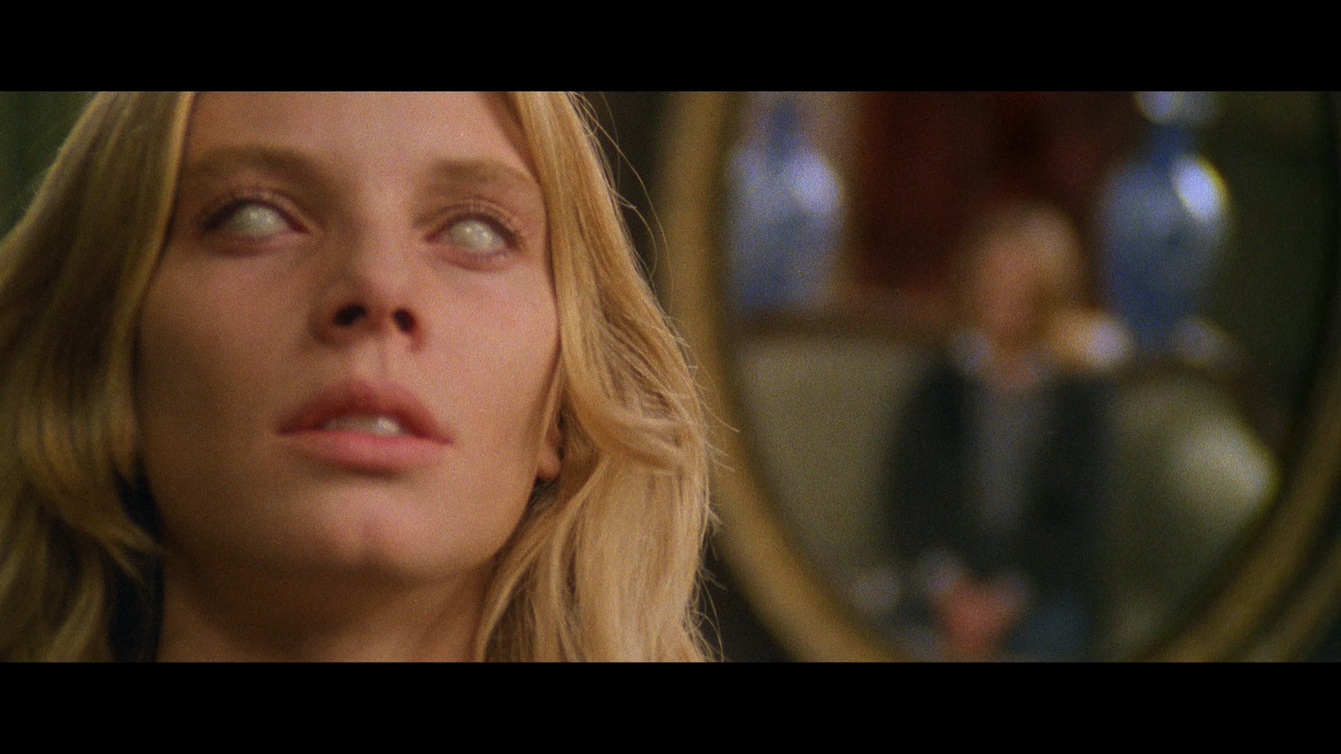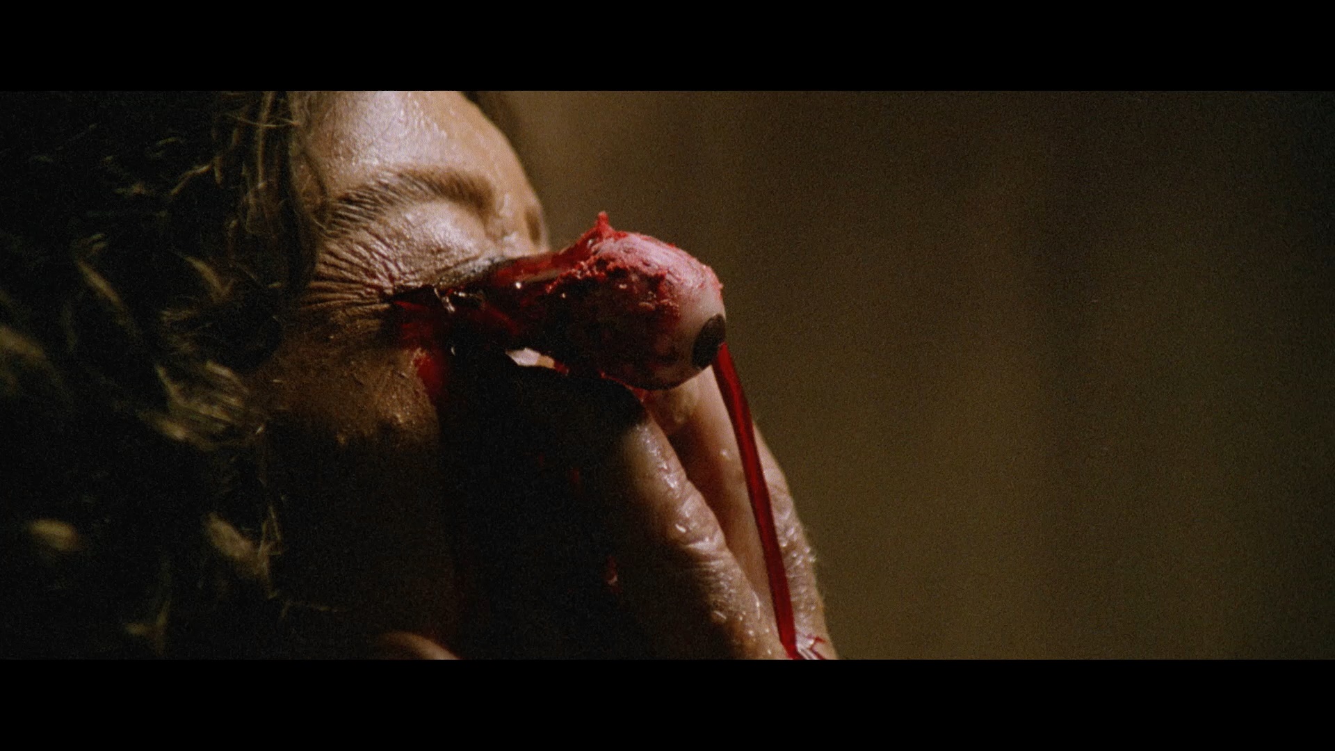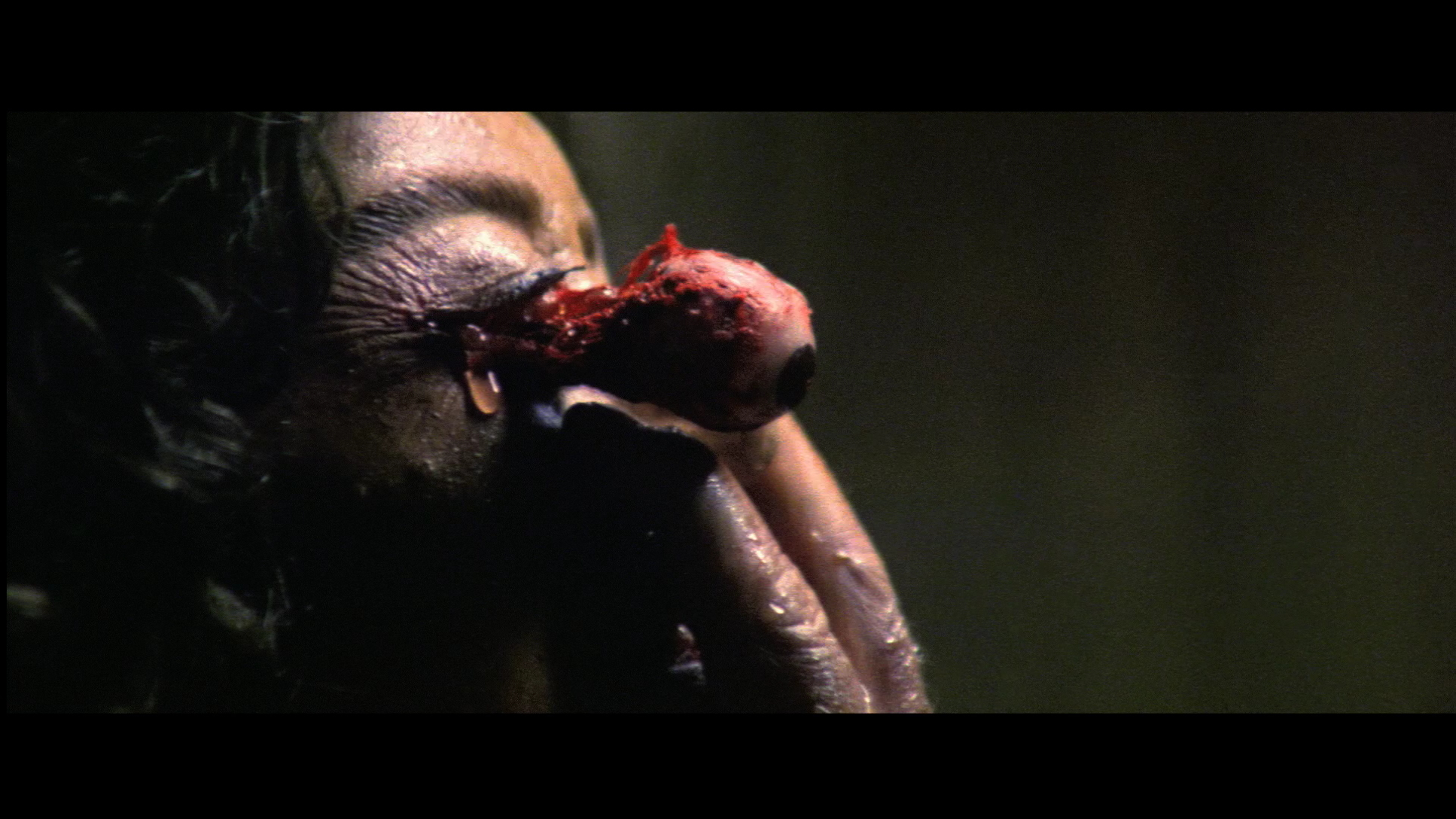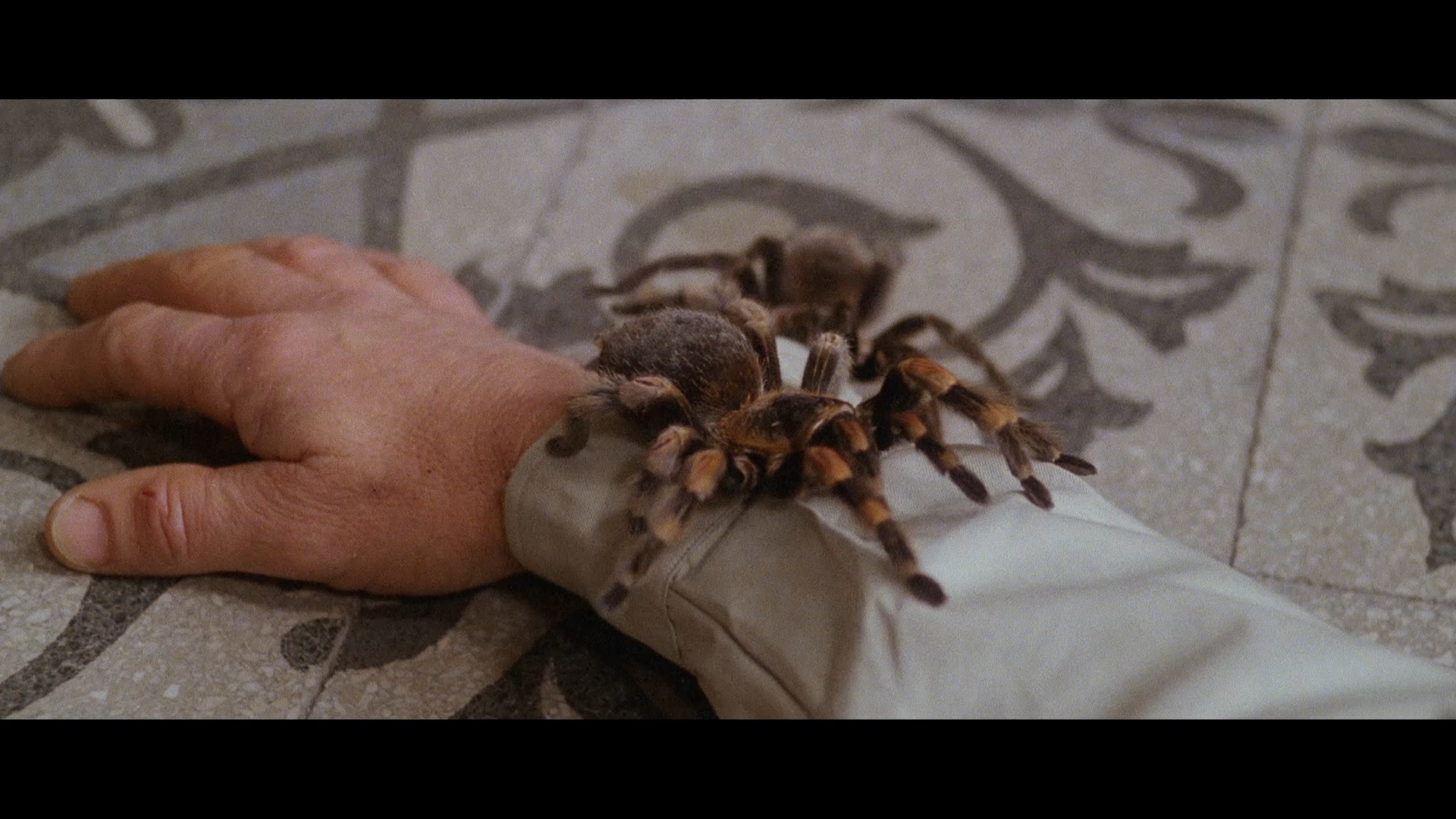 The Warbeck-MacColl commentary is ported over here, and you also get a second audio commentary by Salvati (in Italian with English subtitles) covering the intricate visual scheme of the film including manipulating the play of light, the capturing of the dreamy nightmare state Fulci was striving for, the different looks of the film depending on the territory, the demands of international commercial films at the time, and others in his field who had an impact on his work. An interview with Monreale, "Emily's Eyes" (16m55s), covers her memories of Fulci starting with their first encounter on Silver Saddle and touching on her memories from the set including her culinary prowess. Then "Arachnophobia" (28m30s) with actor Michele Mirabella highlights his own acting career, his big radio hit, his rapport with Fulci, and the joys of getting covered with a bucket of tarantulas. (Best quote: "It's very unlikely that a tarantula would pounce to eat a human face.") In "Murder They Wrote" (12m59s), writer Giorgio Mariuzzo reminisces about the maestro's creative process, etiquette on the set, and the uncanny knack the filmmaker showed for generating cinematic atmosphere. An archival Fulci interview (1m47s) from 1991 on the set of Daemonia shows him acting quite giddy in a brief shot-on-VHS chat ("my friend Clive Barker!"), and a prologue comparison (7m14s) showing off the differences between the four current versions.