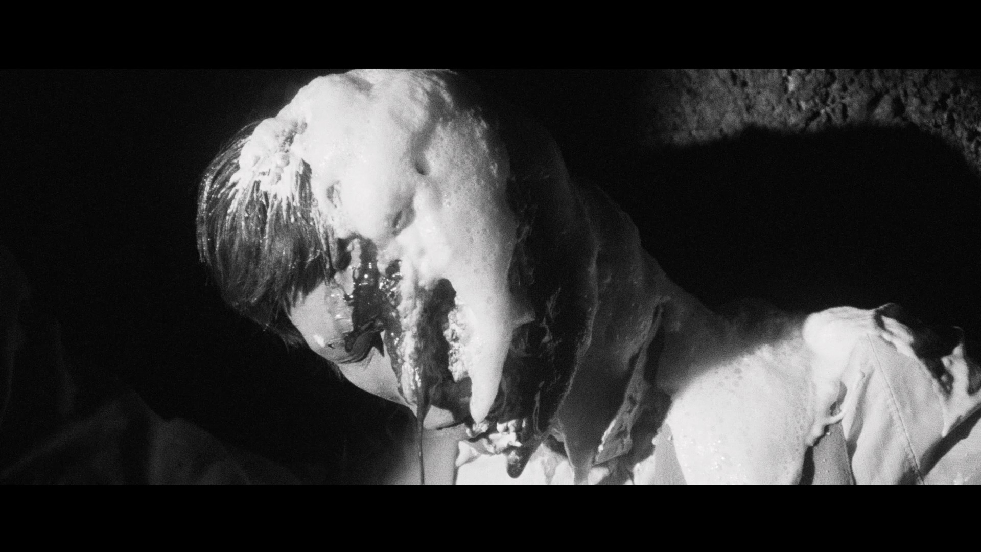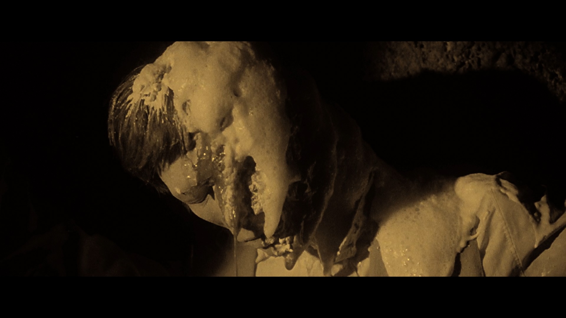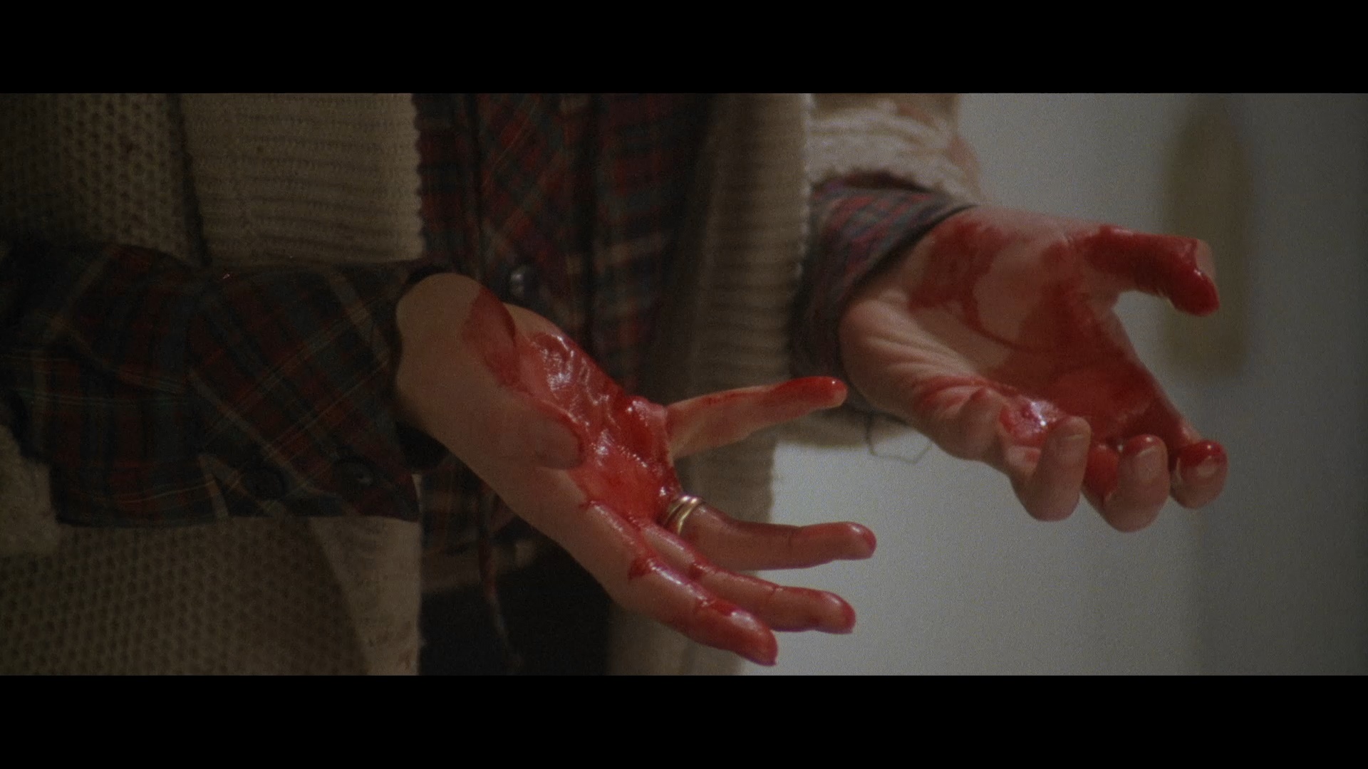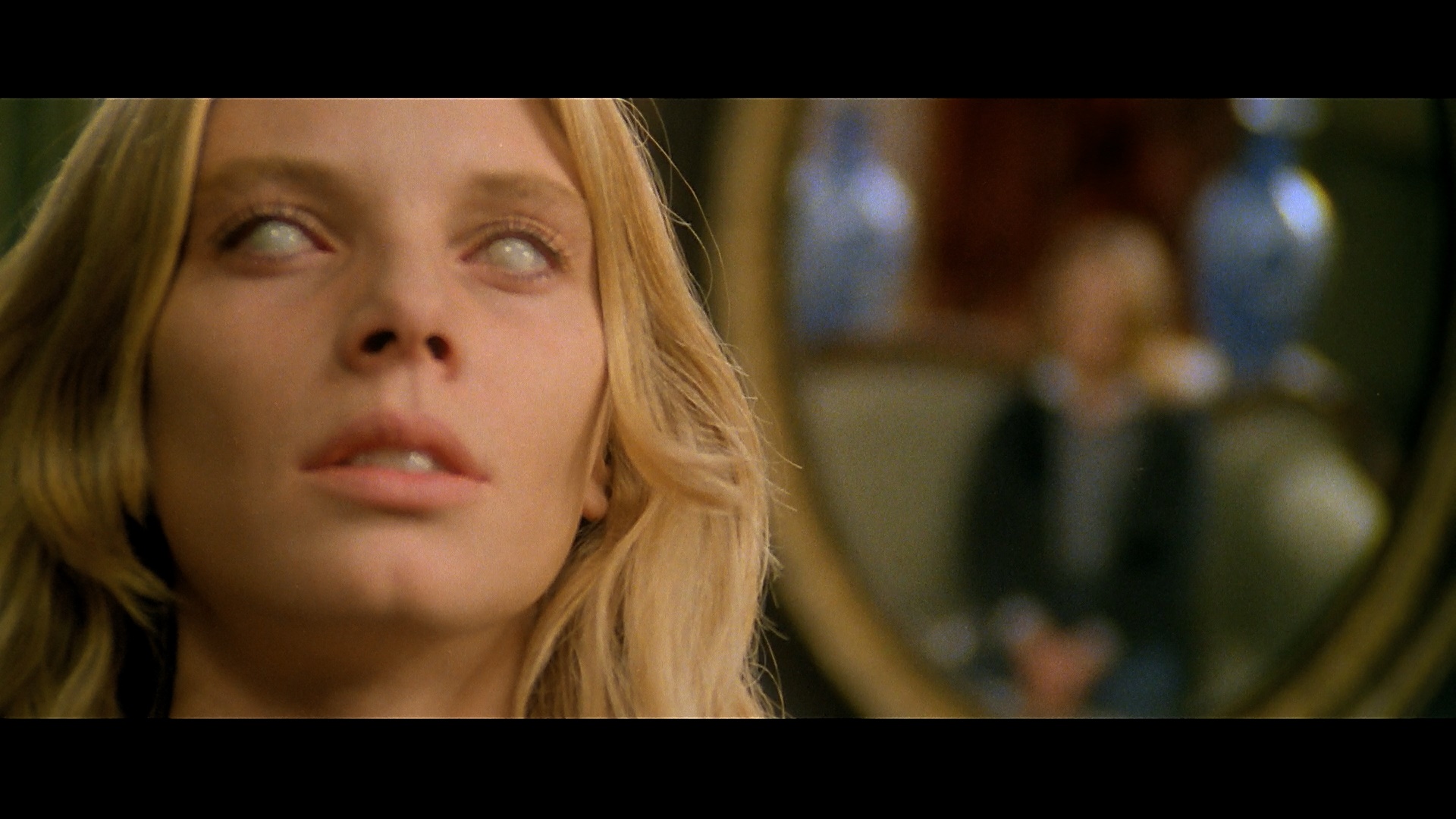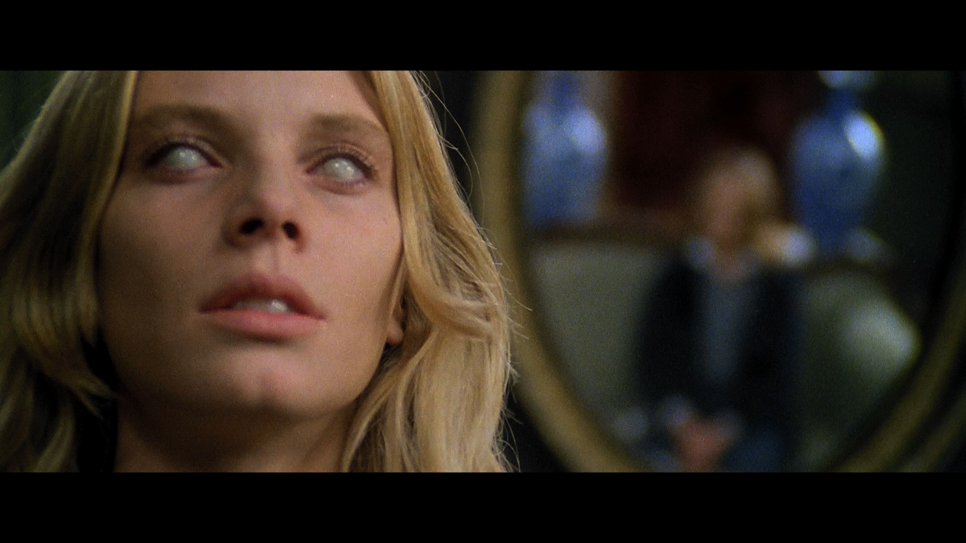 The Warbeck-MacColl commentary is ported over here, and you also get a second audio commentary by Salvati (in Italian with English subtitles) covering the intricate visual scheme of the film including manipulating the play of light, the capturing of the dreamy nightmare state Fulci was striving for, the different looks of the film depending on the territory, the demands of international commercial films at the time, and others in his field who had an impact on his work. An interview with Monreale, "Emily's Eyes" (16m55s), covers her memories of Fulci starting with their first encounter on Silver Saddle and touching on her memories from the set including her culinary prowess. Then "Arachnophobia" (28m30s) with actor Michele Mirabella highlights his own acting career, his big radio hit, his rapport with Fulci, and the joys of getting covered with a bucket of tarantulas. (Best quote: "It's very unlikely that a tarantula would pounce to eat a human face.") In "Murder They Wrote" (12m59s), writer Giorgio Mariuzzo reminisces about the maestro's creative process, etiquette on the set, and the uncanny knack the filmmaker showed for generating cinematic atmosphere. An archival Fulci interview (1m47s) from 1991 on the set of Daemonia shows him acting quite giddy in a brief shot-on-VHS chat ("my friend Clive Barker!"), and a prologue comparison (7m14s) showing off the differences between the four current versions.