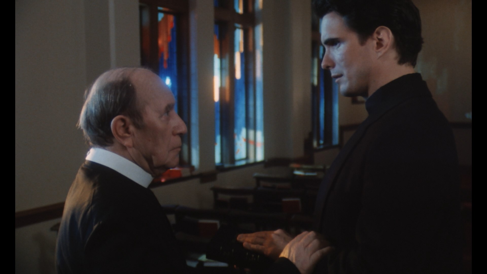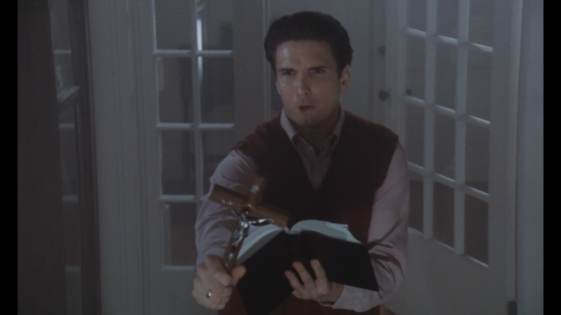 In 2021, Severin Films gave the film its second U.S. release as a two-disc special edition including a soundtrack CD that marks the first release in any format of Cordio's score (which overlaps with some of his work on Witchery). It features the same Filmirage-sourced scan and English track, though here you also get the Italian track with correctly translated English subs (plus English SDH subtitles for the main track). In addition to the trailer, the disc comes with three new featurettes starting with Fragasso in "Beyond Possession" (37m16s) chatting about the whole La Casa situation, the genesis of the script, the influence of The Exorcist, and the execution of the special effects. Then it's Drudi's turn in "The Devil in Mrs. Drudi" (22m50s) as she talks about developing the script, her fascination with demonic topics and cults, the weird story behind a skin-crawling book, the genesis of the demon Ameth used in the film, and her later encounters with kids freaked out by the movie. Finally in "The Sign of the Cross" (28m45s), Brandon shares his extremely detailed and precise memories from the shoot including a memorable interaction dressed in his priest garb, his fascination with the New Orleans locales, his preference for vomiting stage blood instead of foam, and the filming of that guerrilla "man on the street" sequence. The Blu-ray also came with a limited slipcover if you moved fast featuring an "unpromotable" title that rhymes with Weevil Head Hive.