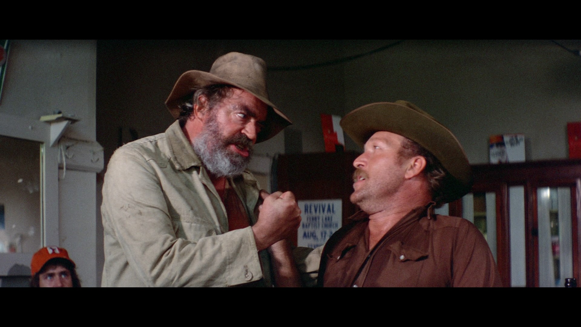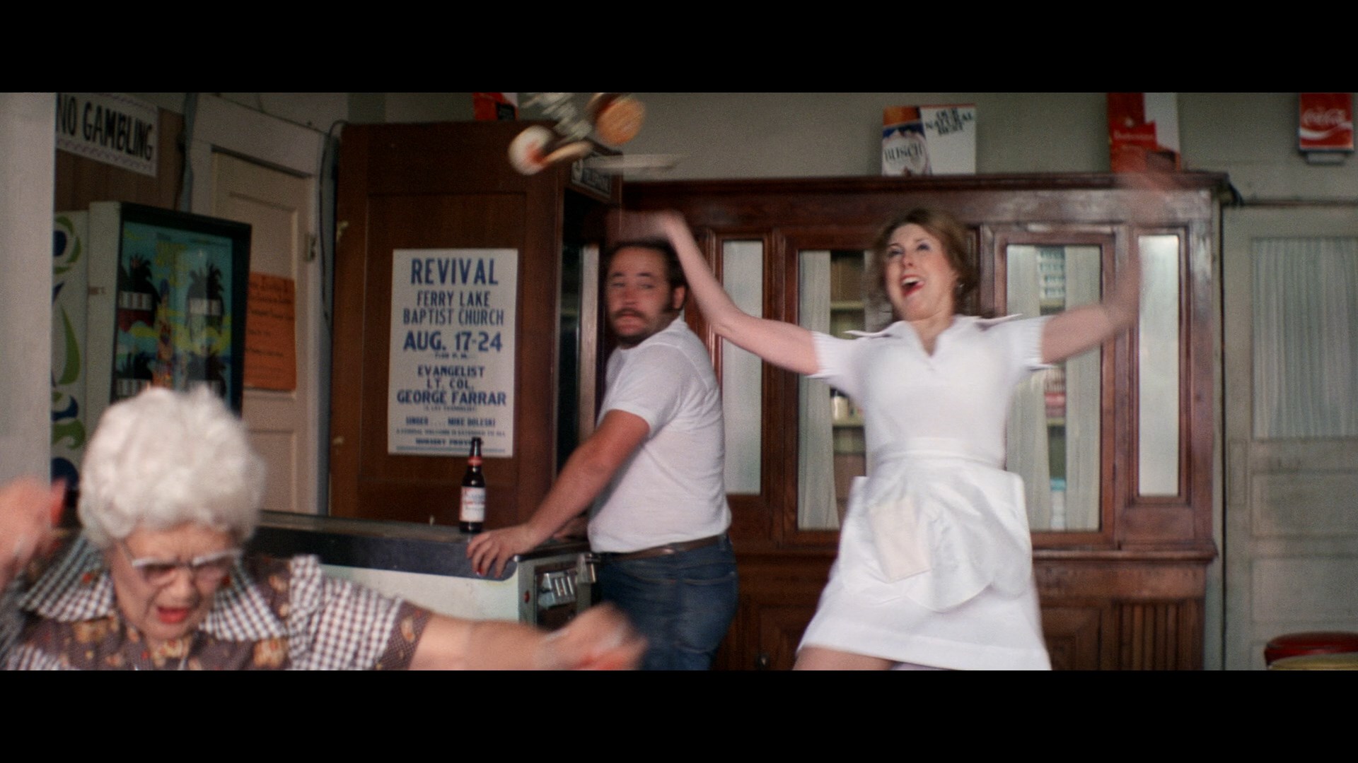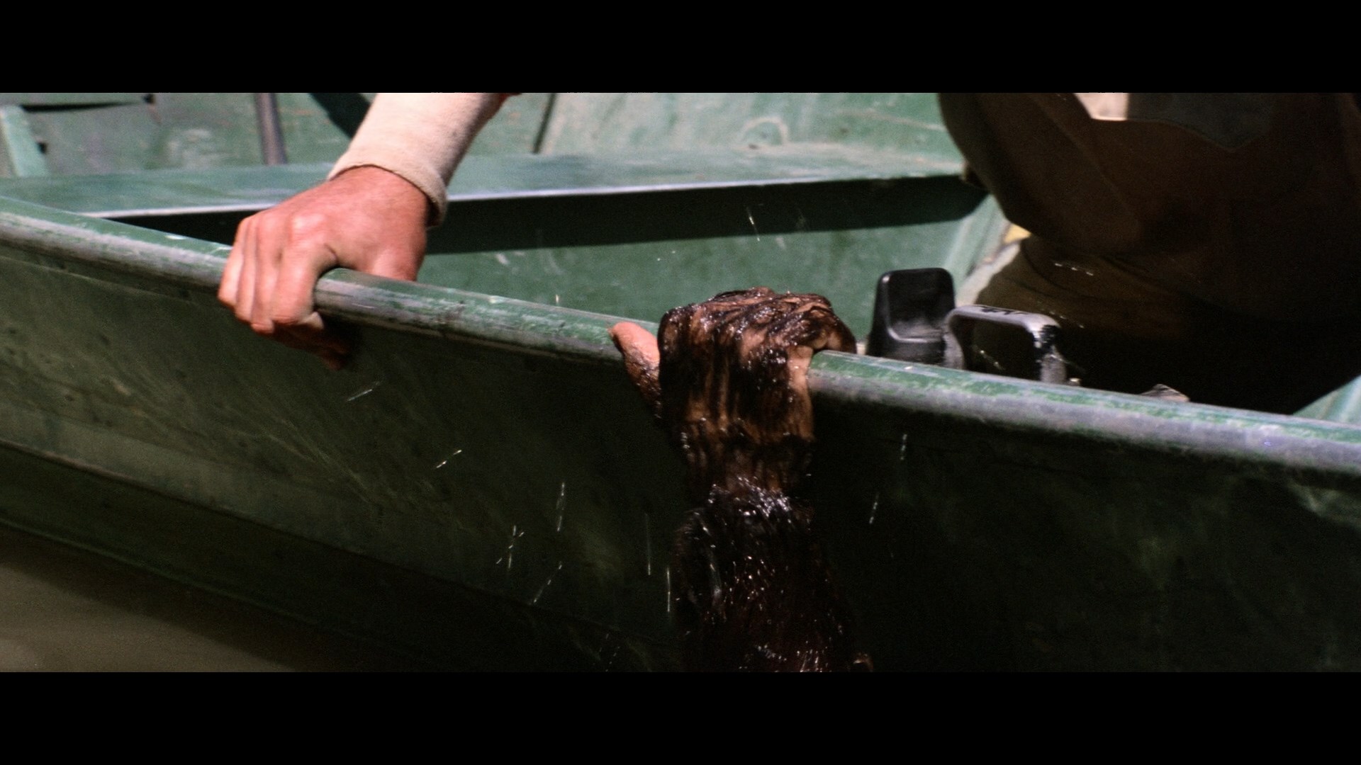 budget film, this looks great with a colorful, sharp appearance and loads of atmospheric gliding camerawork. Previously tough to make out in other video transfers, the nocturnal climax is finally crystal clear here as well and much easier to enjoy. The DTS-HD MA English 2.0 mono track is also excellent and features optional English subtitles. A new audio commentary with Michael Gingold and Chris Poggiali is as great as you'd expect given their breadth of knowledge about the genre; they both have a lot of affection for this film and have tons of info about the filmmakers, cast, location shooting, and cinema du Bigfoot. In "Swamp Stories" (19m5s), Cundey looks back at his early years working on a wild array of exploitation films, his memories of the colorful cast members here, and other anecdotes from the set including the unorthodox payroll process. The theatrical trailer and a radio spot are also included.