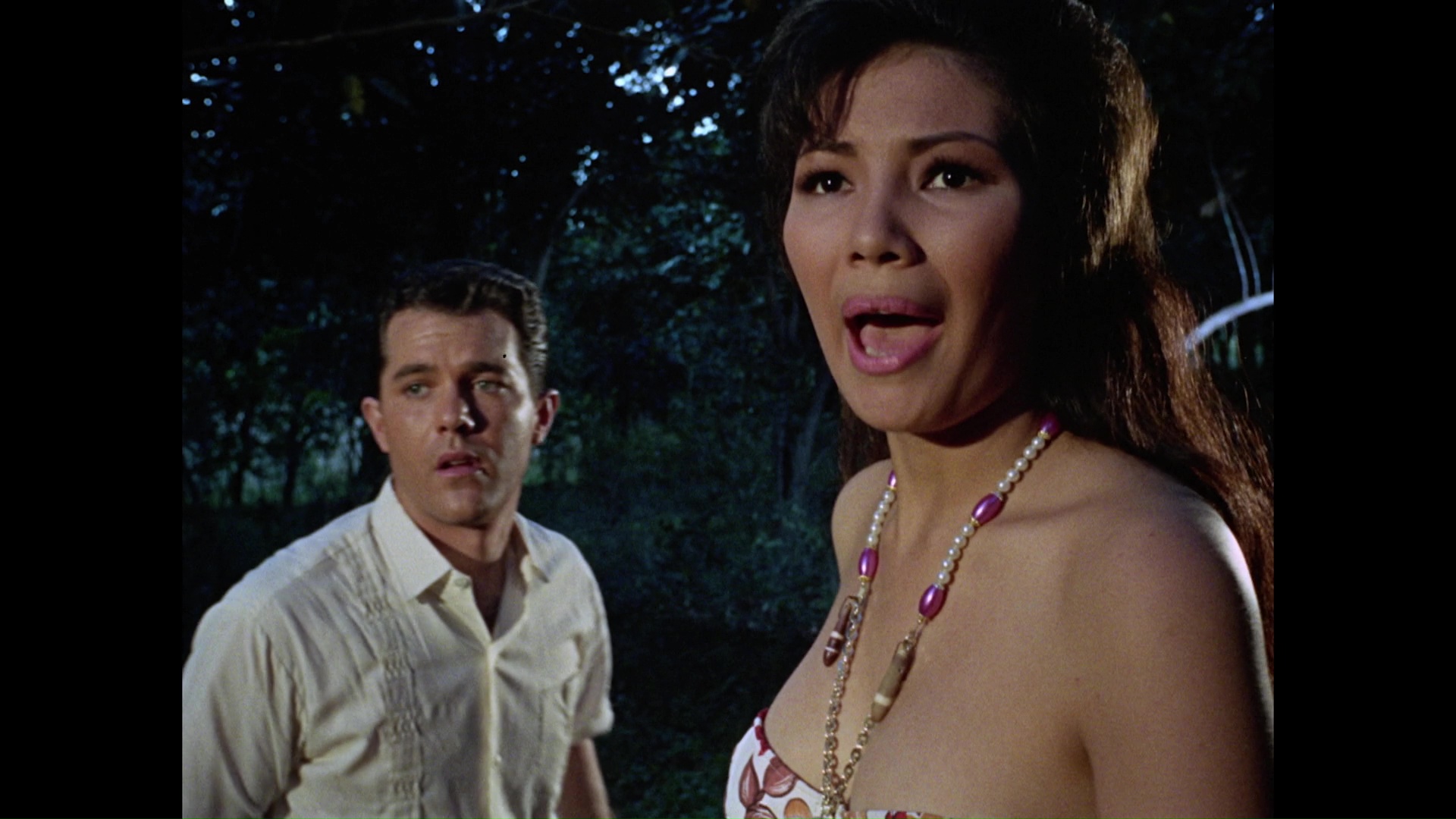 paced, this grafts in several plot elements from Terror Is a Man (the noir-ish blonde wife, the suspicious scientist, etc.) but puts them in a pulpy, outlandish new context completely different from the classic horror-inspired approach of that prior film. Here you get a much higher body count, plentiful body parts, quick flashes of titillating semi-nudity, and lots of colorful coverage of the lush, humid setting. The monster itself is far from convincing and isn't much of a step up above the infamous From Hell It Came, but that just adds to the charm.