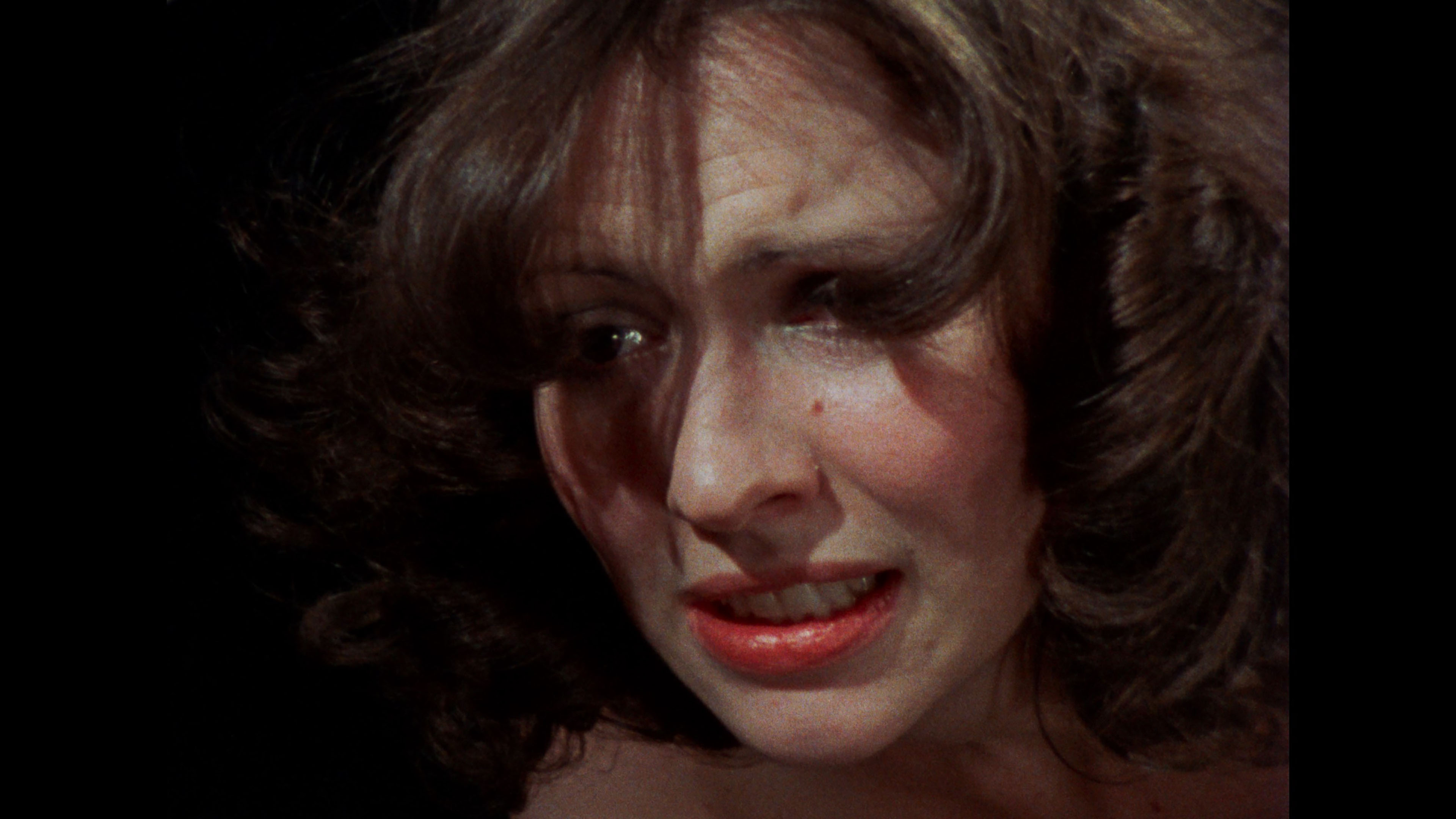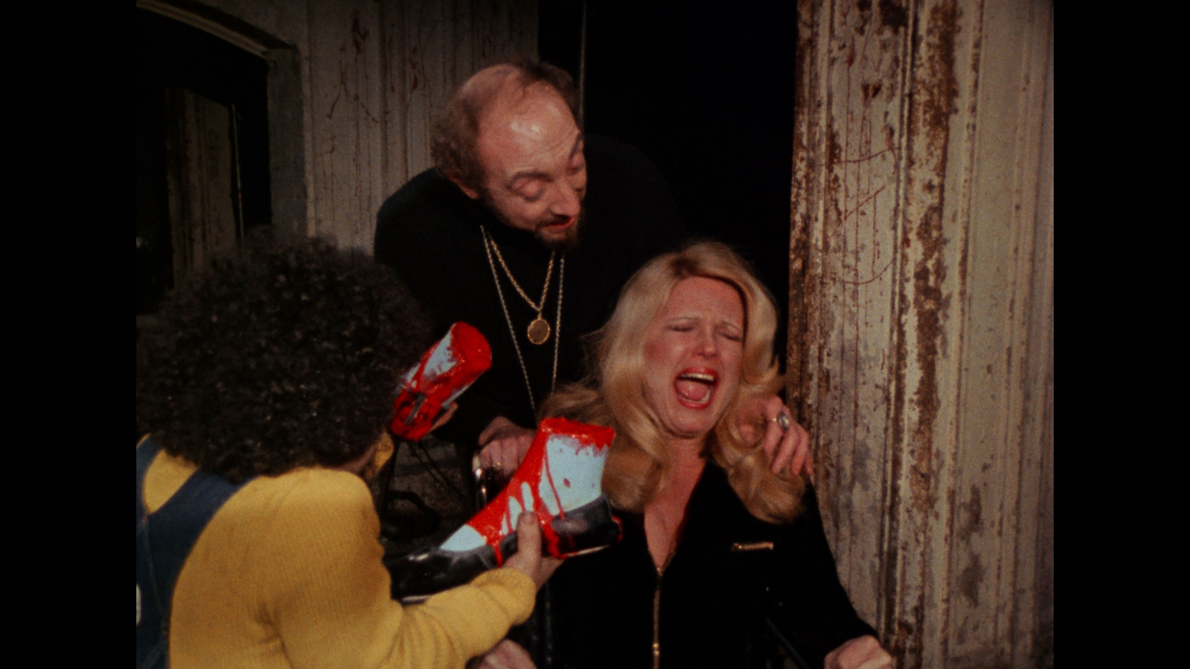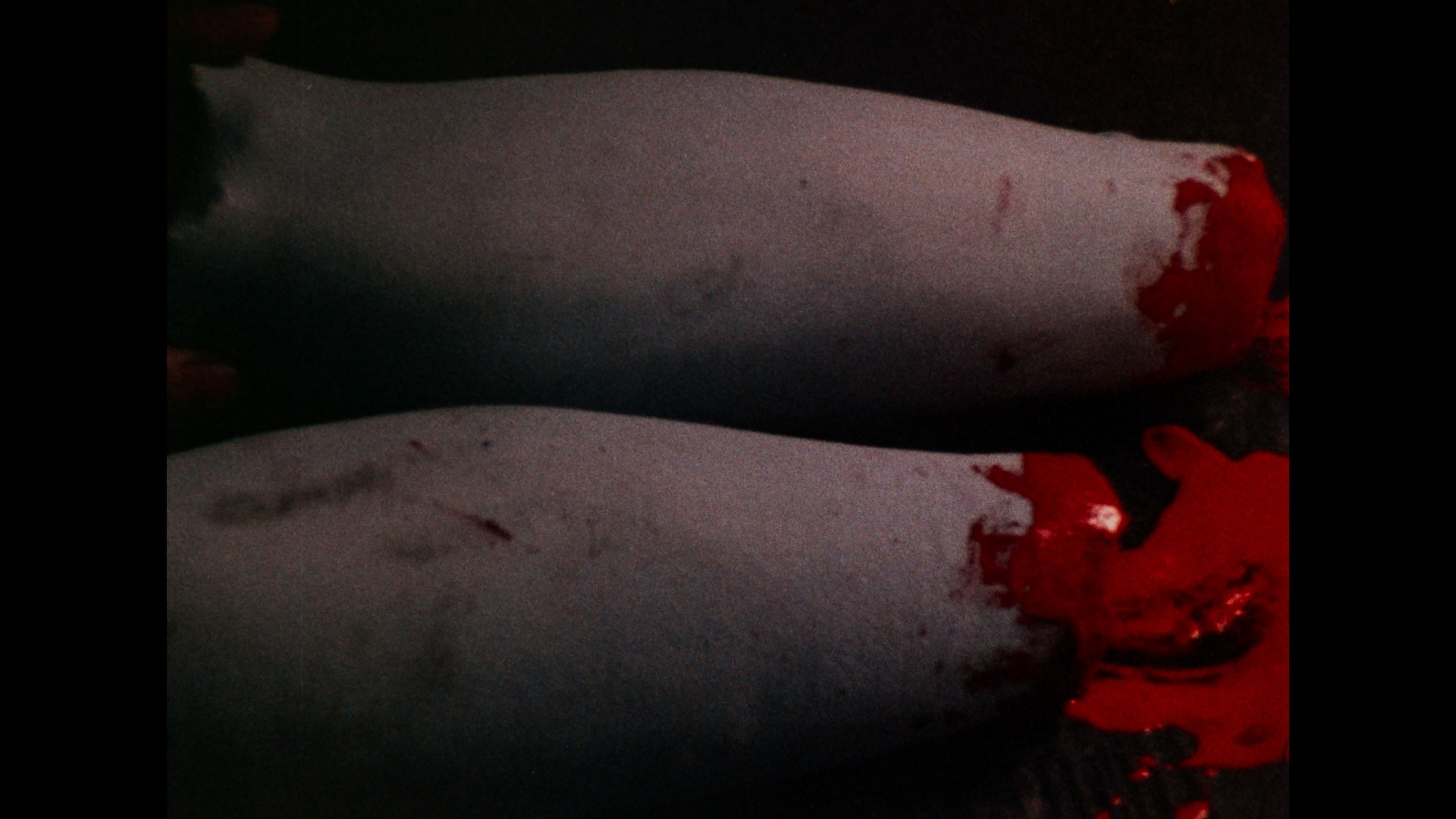 Vinegar Syndrome gave the film its inevitable upgrade to 4K UHD with a two-disc set also featuring a Blu-ray with additional extras. We may not have 4K editions of Seven Samurai or Gone with the Wind, but at least we finally have a pristine 4K edition of Reed's grubby classic in our hands. The presentation (with HDR on the UHD and transferred from the 35mm internegative, the best element around) is back to 1.33:1, a welcome gesture as it's far better composed that way and no longer squeezed, and the leap in quality is drastic with rich black levels, much more natural skin tones, and finer detail throughout. This is also the extended cut (including the Sardu, Master of the Screaming Virgins title card), with the restored scene now immaculate (see the second frame grab comparison below) and matching the rest of the film. In addition to the Roth commentary, you get a terrific new commentary track by John Szpunar, author of Blood Sucking Freak: The Life and Films of the Incredible Joel M. Reed, who offers a packed history of the film from its outgrowth during the development of another unrealized project called Teen Demon, the financing process, the inspiration of a real S&M ballet performance, and wild stories about nearly every single cast member. Absolutely essential listening, especially if you're a fan of the film. "Freaks Come Out at the Drive-In" (14m31s) captures highlights from the Troma-Thon 2023 screening of the film at the Mahoning Drive-In Theater in Lehighton, PA, including an interview with Lloyd Kaufman about the film's distribution history and its success as a midnight movie title along with the real and fake women's rights protests. A full live commentary (93m37s) captured on VHS from a 2009 screening features Reed, Art Ettinger and Ken Kish, plus an intro by Reed, with lots of loose and funny stories from the shoot all the way through. The audio quality is hit and miss since Reed tends to mumble and the movie audio is fairly loud, but it's a priceless record to have for sure. A colorful screening Q&A with Reed (55m9s) has him answering questions at length in a movie theater lobby and on a stage, while a "random hotel room interview" with Reed (24m39s) from his Cinema Wasteland appearance lives up to its name as he takes a weird phone call, talks about doing conventions, and ruminates on his career. Ported over from the earlier releases are Kaufman's intro (2m36s), the archival cast and crew interviews by Roth (3m52s), the Roth interview (20m11s), and the Chris Jericho interview (14m36s), plus the reissue Blood Sucking Freaks main titles. VINEGAR SYNDROME (UHD)