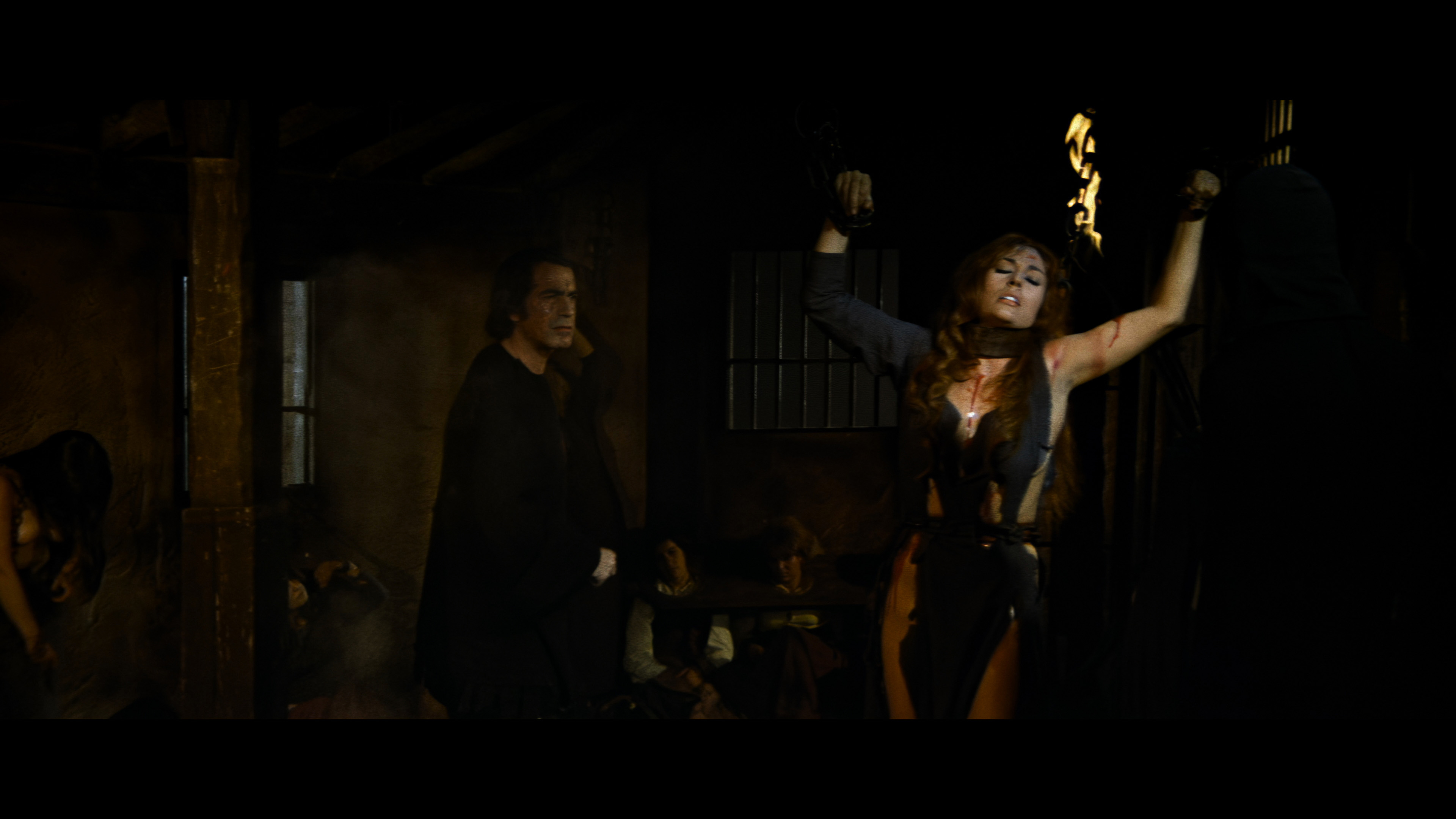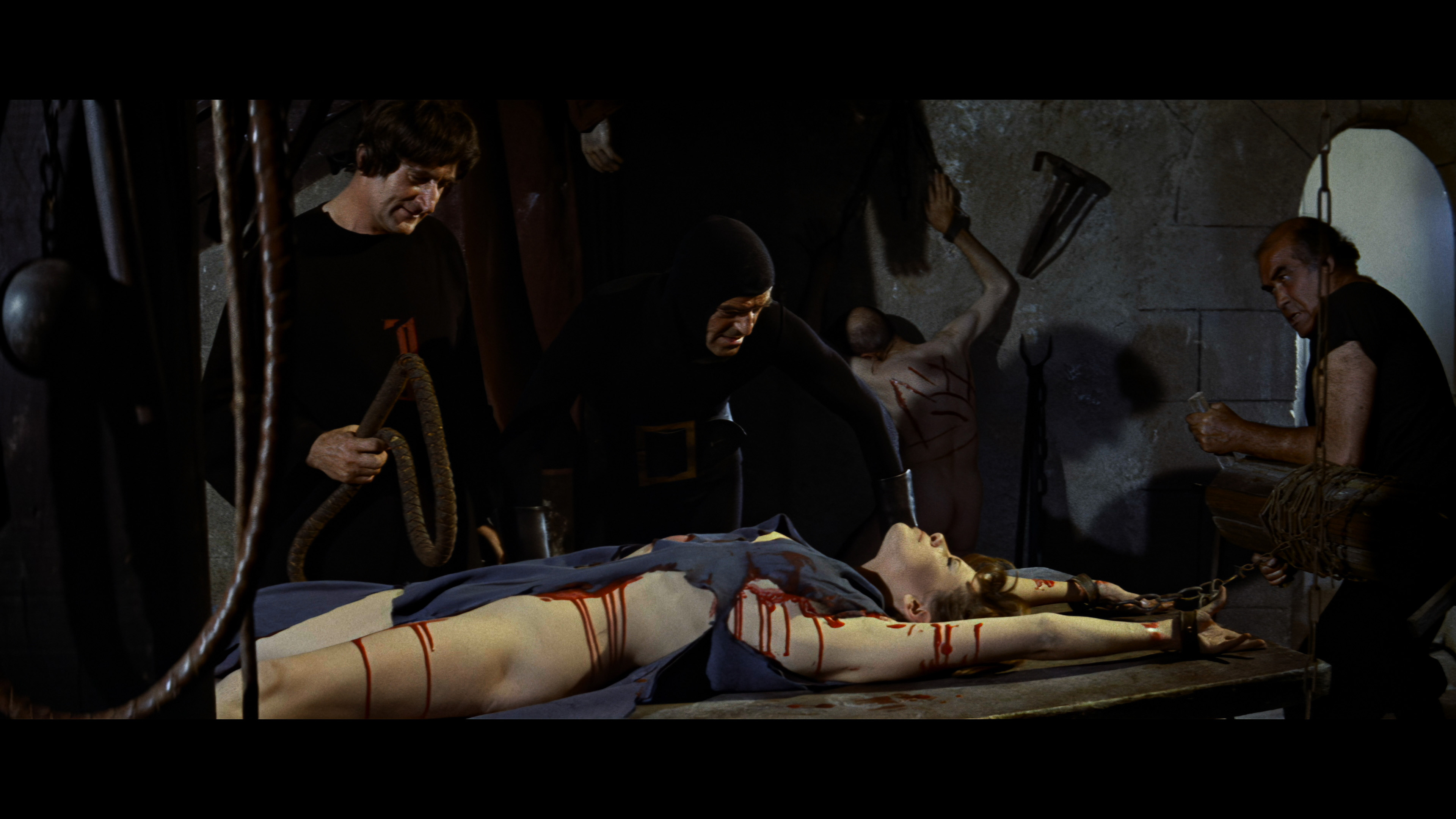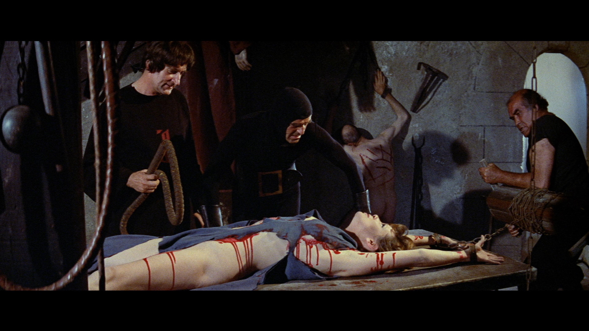 The first DVD out of the gate from Redemption sublabel Salvation in the U.K. in 2000 was notable for containing one fairly strong, bloody sequence with Alicia’s barely covered body being tortured on the rack by Franco stalwart Howard Vernon (in a very funny costume), but otherwise there was precious little violence or sex in this so-so, non-anamorphic letterboxed release clocking in at 89 minutes. The German edition, The Witchhunter of Blackmoor (Der Hexentöter von Blackmoor), featured many additional topless and torture scenes (primarily with Ms. Rohm), and this footage was incorporated into the English version for Blue Underground’s much