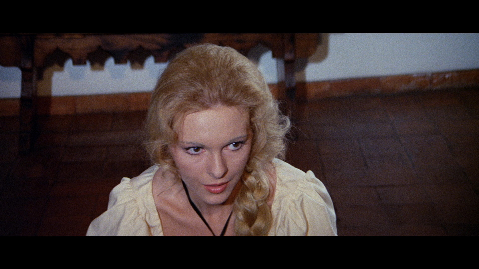 figure as a man so firm in his beliefs and warped principles that he doesn’t comprehend the full damage being inflicted by his gavel. Unfortunately this treatment also makes him a less menacing and compelling figure, despite Lee’s usual commanding performance (mostly confined to sitting behind benches and desks). Otherwise the story is pretty much the same as Reeves’, with a young couple (Rohm and German actor Hans Hass Jr.) torn apart by the misguided religious persecutions inflicted by blind justice. The Bloody Judge also bears a resemblance at times to another Franco/Towers production, Justine, by playing like a costume melodrama punctuated with an odd nasty torture scene that seems to have strayed in from a different movie.