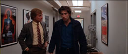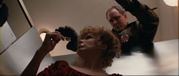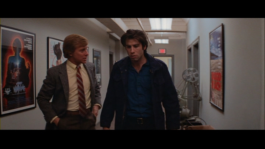 Allen (who still looks great) appears for a separate video interview in which she discusses her character's accent, her surprised initial reading with Travolta, and her feelings about the film's unwise release date, among many other topics. Both are terrific extras and highly recommended. This was also De Palma's first film to use a real Steadicam (in that great opening sequence), so the intentor of the system, Garrett Brown, talks about using it in the film, which came out shortly after Stanley Kubrick's pioneering use of it in The Shining. Other extras include Louis Goldman photos from the shoot, the theatrical trailer, and one very hefty extra, Brian De Palma's first film, Murder à la Mod. This wild little 1968 number lays out several of De Palma's visual motifs (especially some fun Hitchcock nods) and features regular player William Finley; it was previously issued from Something Weird as a double bill with The Moving Finger, and flashes of it can be seen on a TV screen in Blow Out, too. The transfer here is comparable to the excellent one seen previously on DVD, which was also taken from the original negative. As for the liner notes booklet, Michael Sragow offers some new observations called "American Scream" about the film's critical reception (especially with De Palma champion Pauline Kael) and some of its themes, while Kael's "Portrait of the Artist as a Young Gadgeteer" essay about De Palma is included as well. Most amusingly, you also get a two-page reproduction of Senator McRyan's car crash frame by frame and a great spread of the poster art seen in the film like Squirm and Without Warning. As for the feature itself, the transfer from the 35mm negative supervised by De Palma looks much more solid than the MGM disc (it's the first time that funky blue-and-red-and-white wallpaper in Allen's hotel room didn't bleed all over the screen), but bear in mind this is a scruffy, early '80s film often shot in low lighting. Grain is especially heavy in the opening nocturnal scenes, which is as it should be, and overall it's a pleasing upgrade in every respect with the original two-channel stereo track retained as well (with optional English subtitles). The DVD was delivered for review here so the Blu-Ray should deliver the expected uptick in resolution, but clicking on any of the frame grabs here will give you an idea of how it looks. Definitely a satisfying disc no matter which format you prefer.