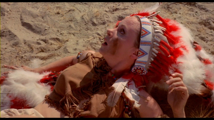 mines of obscure sleaze cinema have yet to come close to being exhausted, along comes Vinegar Syndrome with another batch of disreputable discoveries unseen for generations (if ever). First up is The Blue Hour, the most ambitious of the bunch and the only one made in the '70s, which charts a young woman's journey to happiness in spite of a sordid back story that'll make your head spin. While making out on the beach with her boyfriend David (Nicholas Wayne), brunette model Tanya (Ann Chapman) finds her mind drifting off somewhere else. "It has nothing to do with you," she explains about her chilliness (which doesn't seem like a very flattering excuse). Her shrink says her head's screwed up because of her past... and what a past! From flashbacks we see this involves her in an Indian headdress getting hauled around behind a horse in the desert, a blond dude wielding a rifle, and avant garde music... which turns out to be a TV commercial shoot. Apparently the blond guy, a professor, thought it was a real attack, and he decides to track her down through her modeling agency -- which leads to a romantic montage set to a frothy pop song and a very, very long exotic gypsy dance at a restaurant. The owner of the agency decides to stop her from running off by busting into her apartment and smacking her around, which ends very badly. More flashbacks show how she became a model in the first place, which includes nudie photo shoots, piggish clients, bucket loads of glittery silver eye shadow, shock freeze frames, attempted