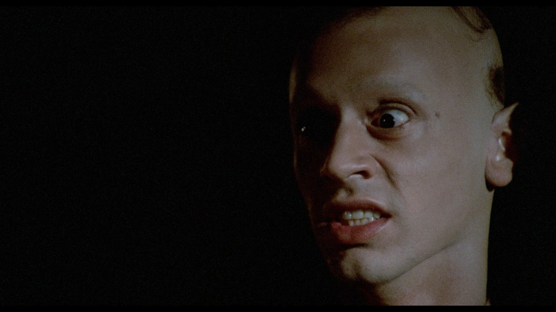 get a workout throughout most of the running time. Even the innocuous sound of a crackling fireplace is dramatically foregrounded in an early scene, bursting from the front speakers with unnerving impact. Lieberman contributes a number of extra features, beginning with an audio commentary in which he discusses with Howard S. Berger the ins and outs of low budget shooting, the obstacles posed by the production, and the problems with creating multiple bald people on film. An early Lieberman short film, The Ringer (19m44s), is a stylized parody of Afterschool Special-style alarmist educational films, complete with dizzying close-ups and stern monologues. Then he turns up again for "Lieberman on Lieberman," a half hour career overview in which he discusses everything from his big break to his most recent activities. The disc is rounded out with a still gallery and the creepy theatrical trailer, which must have turned a few heads at the drive-ins. The first pressing of the disc includes a second disc, the complete music score on CD, which is guaranteed to disrupt the happy mood at any party.After that the film went incognito again for a while apart from a 2007 DVD from Shout! Factory, hosted by Elvira and paired up with Monstroid. In 2016, indie label Filmcentrix (a mainstream-targeted offshoot of adult film distributor Distribpix) released a much-needed Blu-ray featuring a stunning scan from the recently uncovered camera negative. Obviously it proved to be a big upgrade, with the DTS-HD MA English audio options including the 2.0 mono theatrical mix and 5.1 remix. That release also features a new Lieberman commentary with Elijah Drenner, and it's a great one as well as he talks about his own experiences with LSD and the government propaganda around it, the challenges dealing with his lead actor, his fondness for genre films, the influence of Cold War films, and more. Also included are two trailers, a select scene commentary with actor Mark Goddard (8m45s) about some of the acting muscles he got to flex in his role as a prominent politician, followed by a slew of video bonuses. "Tuning In On Tuning Out" (6m32s) features Lieberman discussing his own take on the film being slotted as an anti-drug movie and