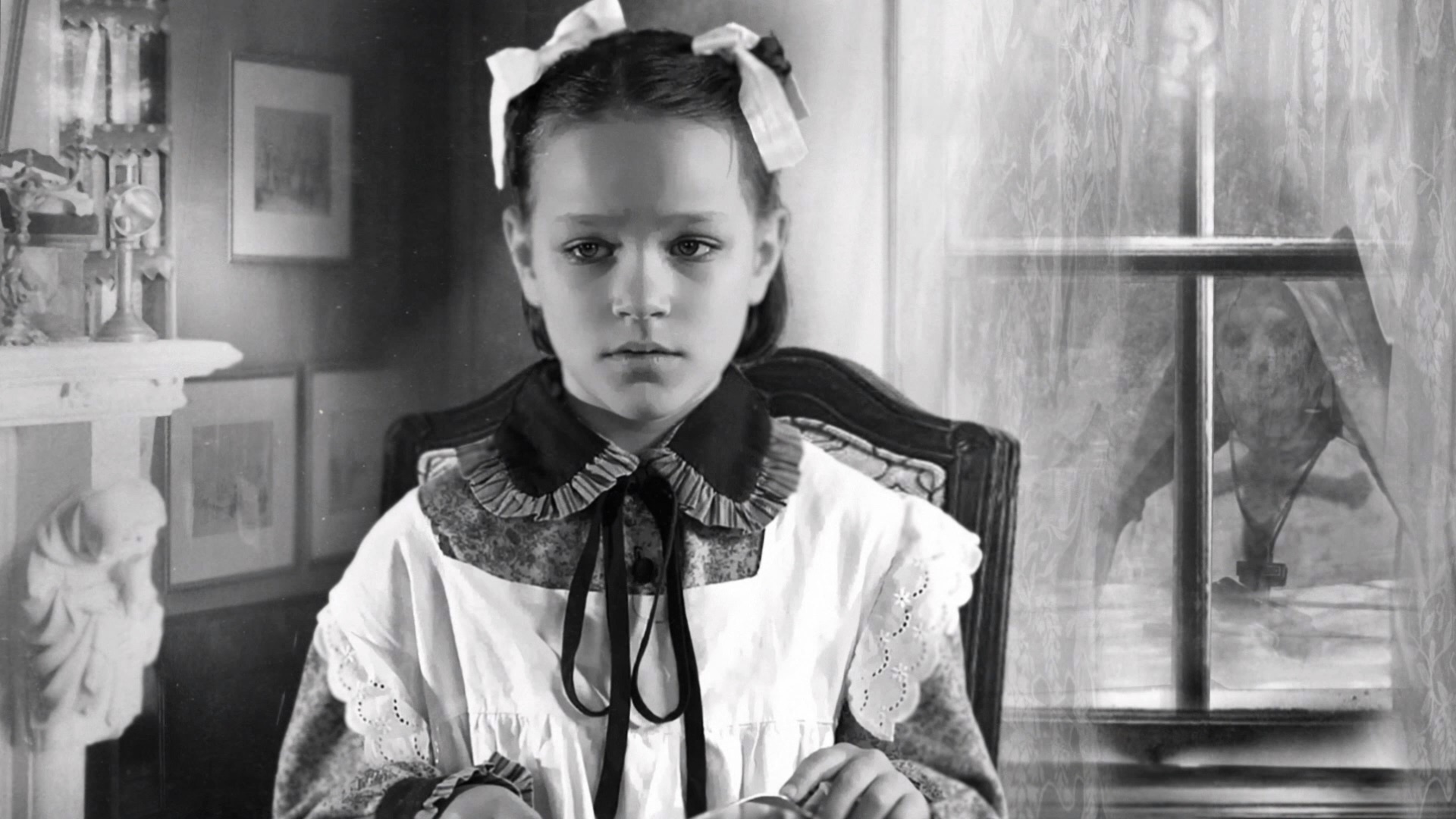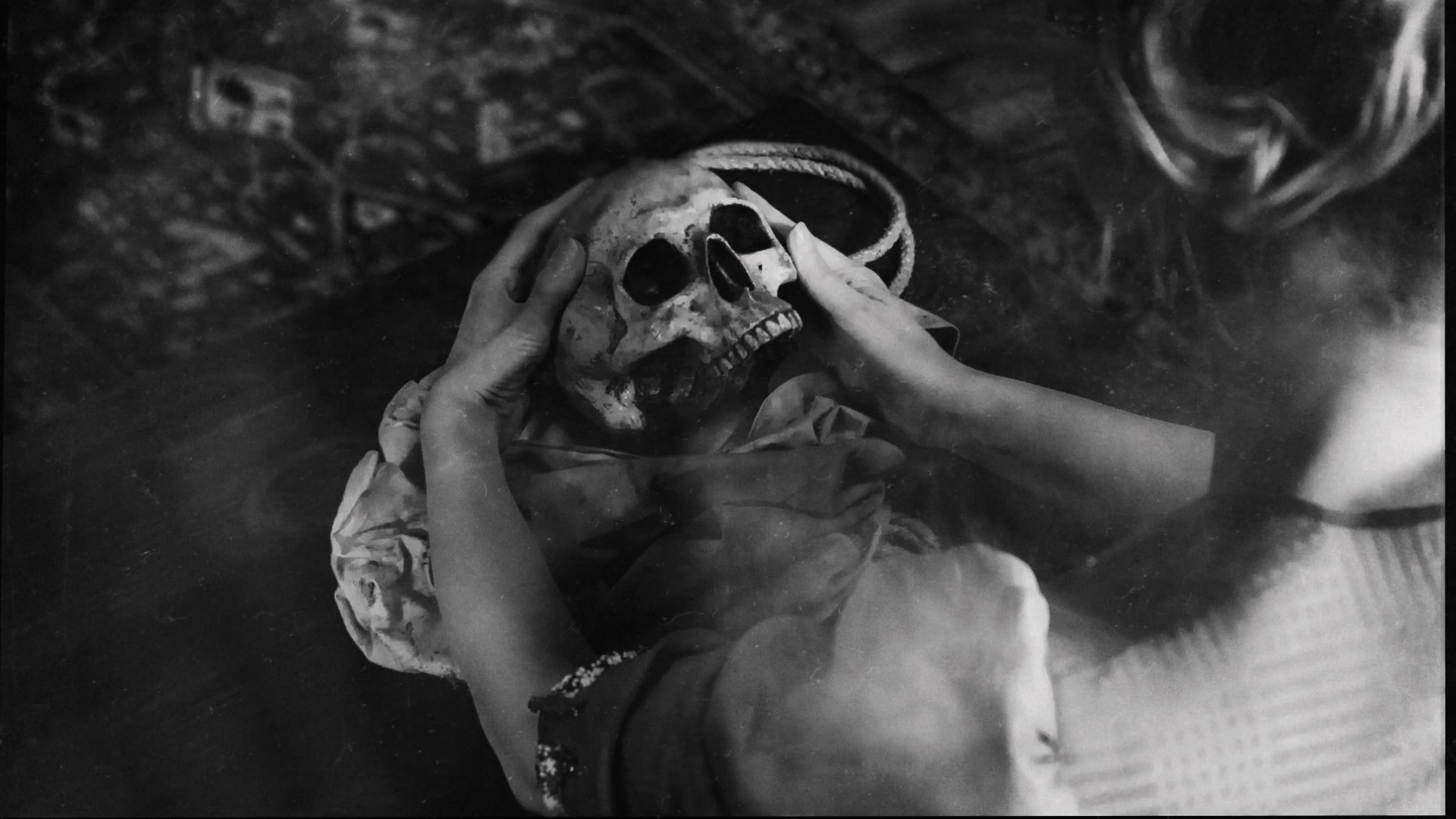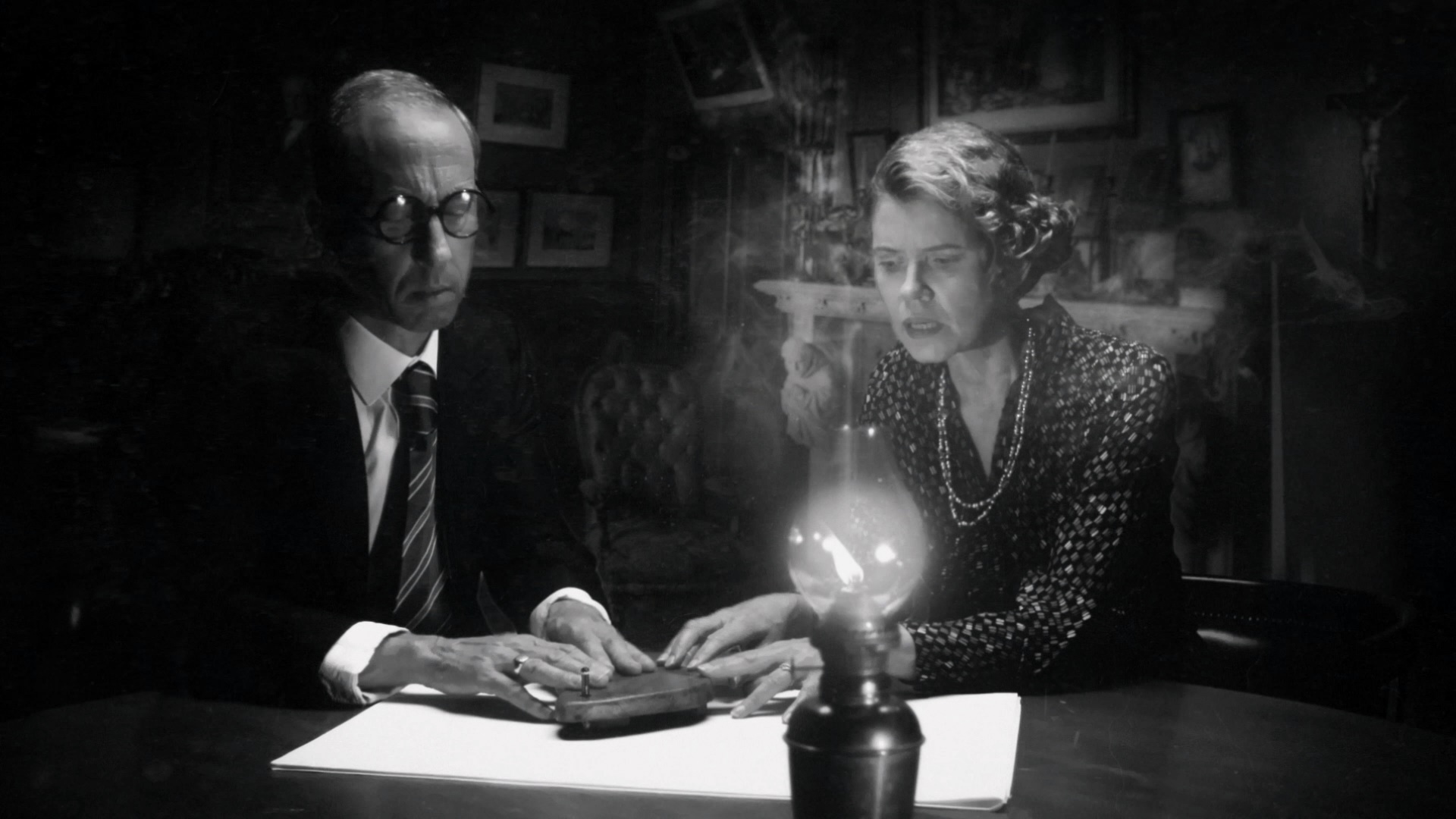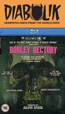 Screams" (32m14s) is a 2017 screening Q&A with Thorpe and actor Nicholas Vince offering a slightly condensed and reworking appraisal of the film. (Festival screening note: not a great idea to do a Q&A while the film itself is still wrapping up behind you!) In "At the Mercy of Ghosts" (27m52s), British screenwriter Stephen Volk (Ghostwatch, The Awakening) sits down with Thorpe for a conversation about English ghost stories and the themes of grief and irrationality that run through the storied tradition. In "History of Borley Rectory" (60m4s), you get a thorough scholarly account of Price and the building via authors Stewart Evans, Eddie Brazil and Paul Adams, who go in depth about the ghostly figures like the nun and offer hypotheses about the background behind them. A visit to the British Library's horror expedition (16m48s) is a very enjoyable, casual hangout with Shearsmith and Rigby (and Thorpe, briefly) looking at film and historical gems while chatting about their own fascinations with the macabre. Then a Grimmfest interview (11m7s) with Thorpe, Rigby, Amias, and Atkinson covering the making of the film in front of a step and repeat, while "Anatomy of a Scene: Animating Borley Rectory (10m19s) brings in Double Farley Creative's Kevin Double to demonstrate how existing photos and plans were used to make a virtual 3-D replica of the long-vanished architecture. In "Conjuring the Spirits" (11m14s), furniture restorationist and artist Robert Thorpe is seen at work on the Borley Ouija board, an idea that came late in the process and features some nice attention to detail including some familiar elements from the film. In "Harry Price and the Martian Lighthouse" (4m55s), Thorpe presents a thumbnail sketch of one of Price's fascination with Mars and astral waves, including his attempts to communicate with Martians via lenses developed with the aid of a lighthouse and the Chance Brothers glassblowing company. Finally the disc closes out with a gallery (6m45s) of the production from Sands' recording session through the extensive greenscreen work, two teasers, a trailer, and the three Thorpe shorts touched on elsewhere in the extras: "Scayrecrow" (12m25s), "The Hairy Hands" (13m23s), and "Screaming Skull (10m12s).