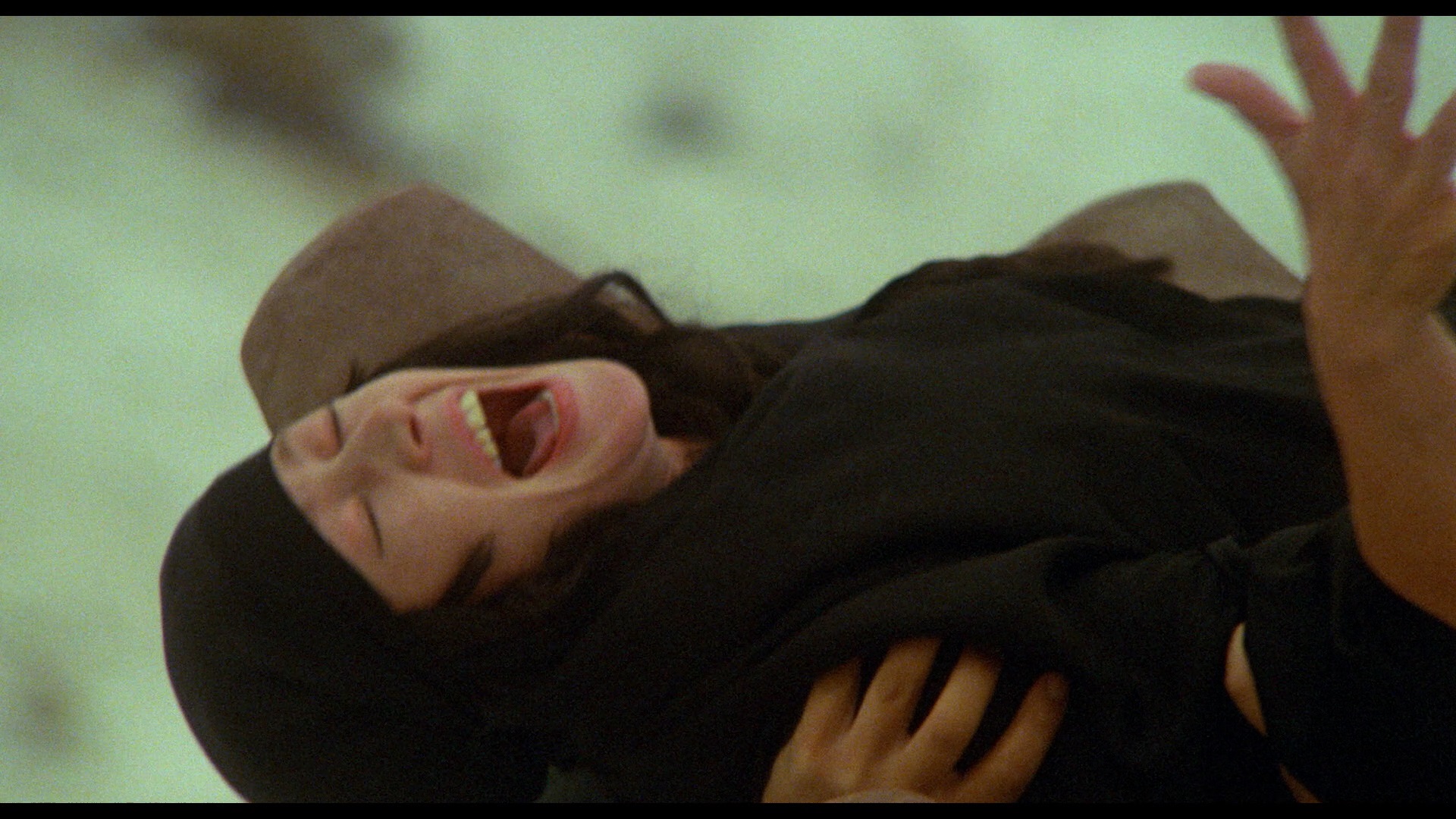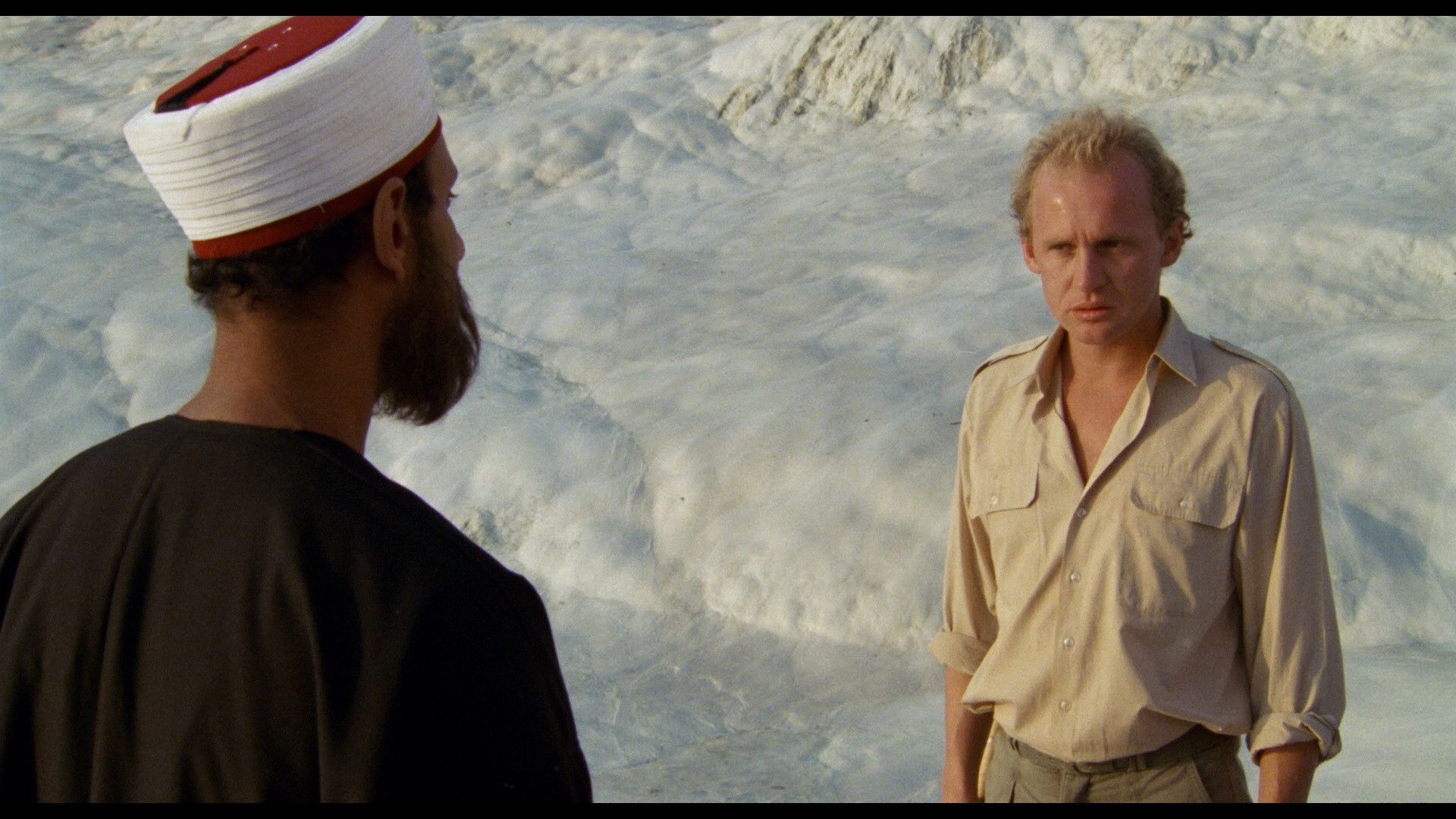 from his past work and more than a little bit of political turmoil, with TV commercials keeping him going in the interim. He also reveals which part was the most difficult to cast, and it's not the one you'd expect-- and there's even an anecdote about trying to cast Jack Palance, which would have resulted in a markedly different film! Shaban appears for a new interview in "The Silent One Speaks" (34m39s) for a comprehensive account of how he got the role (despite being convinced he'd be passed over) and was attracted to the deep, more abstract qualities that he finds are too rare in films now. He also explains how he ended up being transported around the imposing terrain and shares tales about some of the wilder moments during shooting, including a perilous cave fire. "In Another World" (16m52s) is a very welcome new interview with composer Colin Towns, who had already provided one of the best horror scores of all time with The Haunting of Julia and got to stretch himself with a world of unusual instruments and a heavy emphasis on the flute. The 2009 Firth interview is also carried over here, and a better presentation of the U.S. trailer is included along with separate galleries for location photography (48 images) from Saban's collection and a batch of (NSFW) stills and posters. The limited 3,000-unit edition also contains an insert booklet with new liner notes by Dr. Ali Nobil Ahmad, writer Raficq Abdulla, and Shaban, plus a selection of reviews from the initial release.
