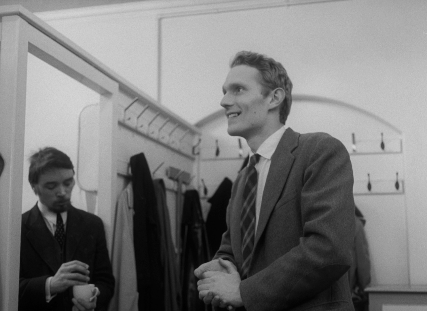 Culled together in the BFI's dual-format Blu-Ray and DVD set is a collection of Johnson's work starting with his most widely-seen debut effort, "You're Human Like the Rest of Them." This 17-minute, 1967 adaptation of his decasyllabic poem features actor William Hoyland (later seen in far more mainstream titles like Hellboy and For Your Eyes Only) as a teacher reciting the lines first in a hospital surrounded by aging pensioners (being lectured on proper lifting techniques by a nurse) and then at work in a classroom. Along the way there's quite a bit of absurdist comedy, including an imaginary but functioning shotgun and punctuated cutaways to cows and anatomical drawings. Johnson's much-noted debt to Samuel Beckett is obviously in play here, especially the classroom sequence, but some of the visual flourishes are striking including a sudden switch to vivid color at the end for a brief montage.