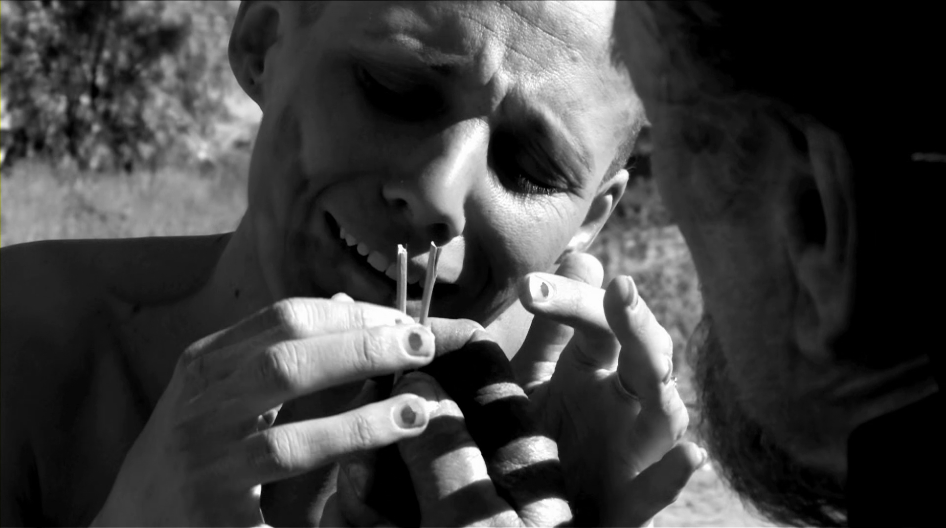Whatever issues one may have with The Bunny Game as cinema, it certainly boasts a bold visual look with moody black-and-white imagery captured on crisp HD video. The rapid-fire editing in some sequences (especially the harrowing bunny mask bit in the desert) poses something of a compression challenge, but the Blu-Ray from Autonomy handles it well and seems to capture the original source with a great deal of fidelity. (There's a D
