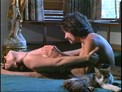 level by peeping on a local couple rolling around in bed (complete with a startling amount of non-simulated visible arousal from both players). Recently returned from a Copenhagen vacation themselves, the man and woman also don't seem to mind the fluffy kitty on their bed that steadfastfly refuses to move out of frame during the entire scene. No longer able to contain herself, Karin goes back to her hotel room where she gratifies herself with the aid of a few handy household objects.