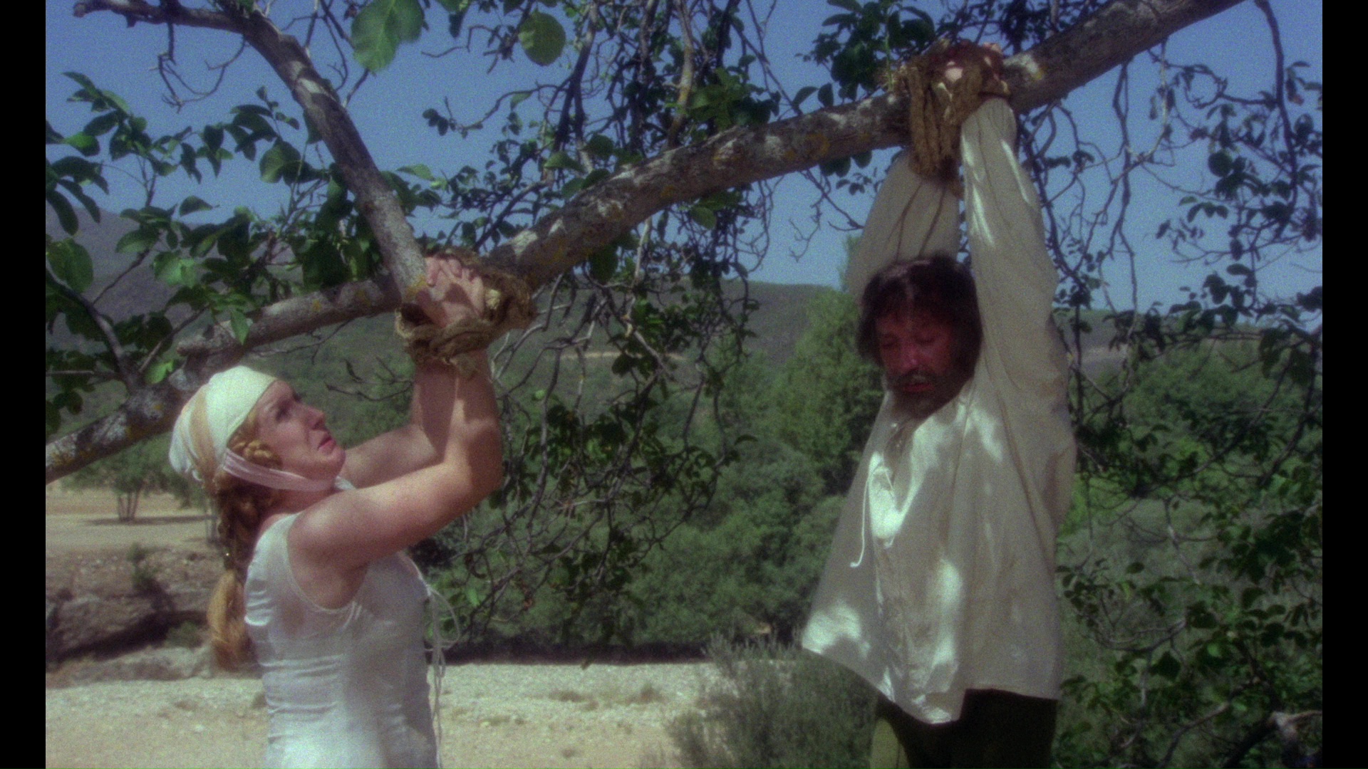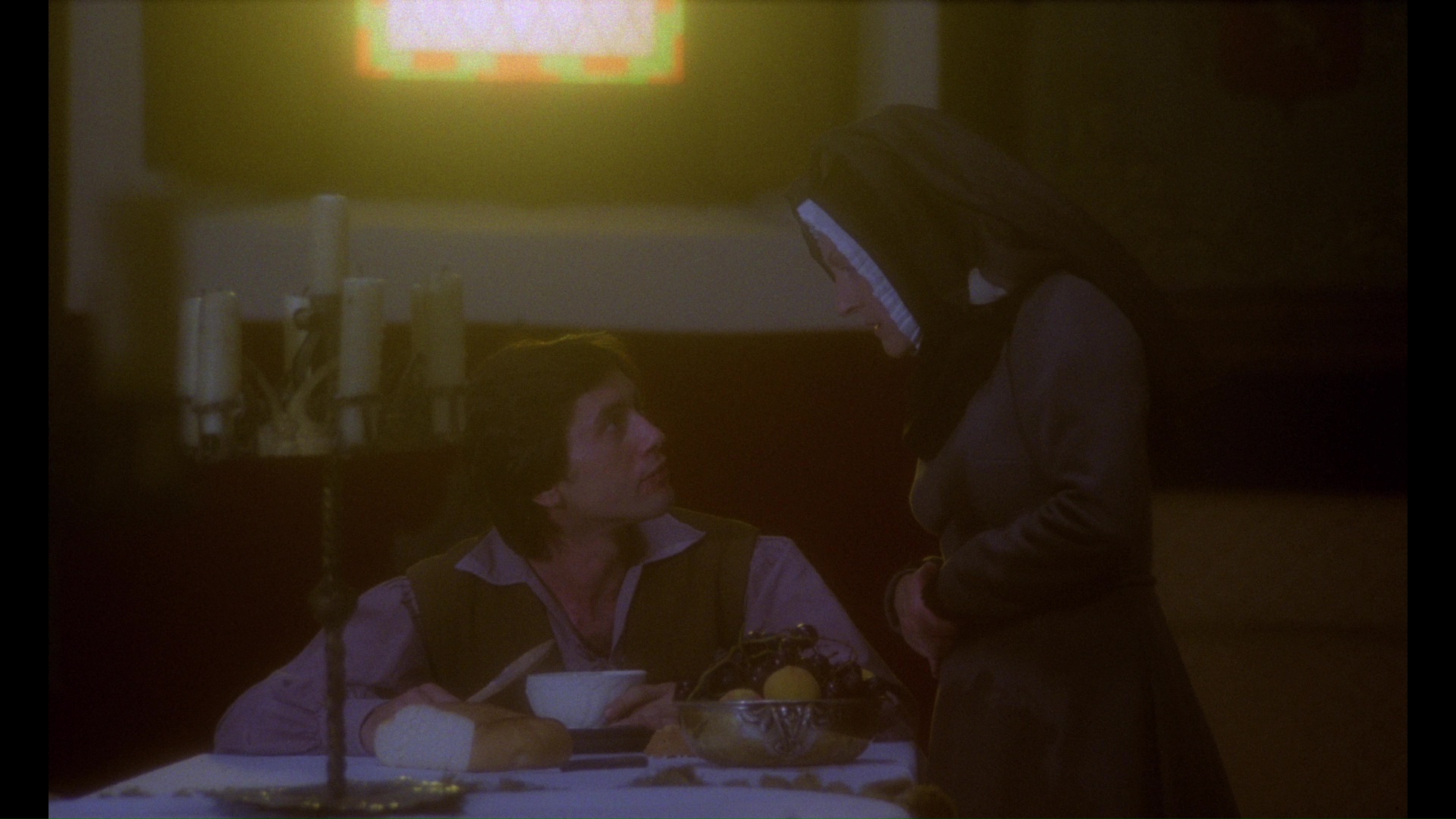a dark spiritual force at work in this story isn't a major shock when it's revealed at the end, with blatant clues dropped along the way and Naschy making inventive use of blazing, rose-colored light when Leonardo's up to his nastiest shenanigans. It's really the decision to tell this story with such a heavy vein of sardonic humor that comes as the biggest surprise, with the frequent sex scenes justified by the plot as well as a way of celebrating the freedom of storytelling in the recent collapse of heavy Spanish censorship. It's also a beautifully mounted film with a fine eye for color, costumes, and decor, accentuated by a fine score by Angel Arteaga. Interestingly, this could have easily been a religious scare film with just a couple of artistic tweaks, but in Naschy's hands it's more complex and challenging than anything so simple. Some of his flourishes bite off a bit more than they can chew (a sped-up comical sex romp and some freeze framing feel out of place), but others are audacious enough to work against the odds like a chilling intrusion of newsreel footage as a vision of the future. Never released theatrically outside of Spain, The Devil Incarnate was a mystery title on Naschy's filmography for most English-speaking fans for a very long time until fan-subtitled copies started popping up from fuzzy VHS copies and later off of a very brief Spanish DVD release. The Mondo Macabro Blu-ray, culled from a new 4K scan of the original negative should prove to be a real eye opener for many viewers as it features a sterling presentation of a film that's proven very tricky for standard definition to handle in the past. The stylizing lighting, occasional heavy filters, and elegant pastoral landscapes really