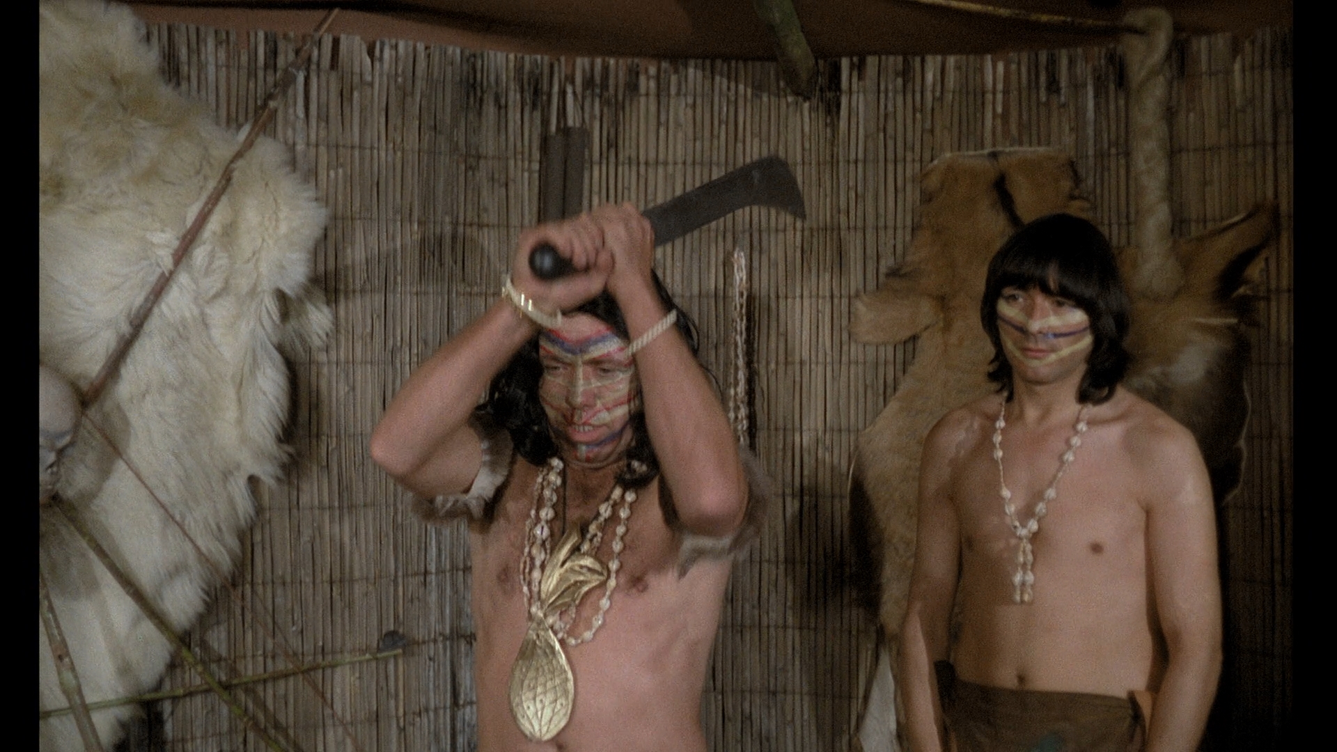 cannibal cookout central. Said flesh eaters are obviously Caucasians wearing warpaint and bad hairstyles, even more ridiculous than the ones in Franco's Cannibals. Then there's that beloved Eurociné dubbing, which never comes even remotely close to matching any single language spoken by mankind. The dialogue is easily as hilarious as Zombie Lake, while anyone expecting the no-holds-barred experience of Cannibal Ferox will be either amused or utterly deflated by watching the "natives" rubbing and mushing lots of animal guts for what seems like minutes on end. The cast only features a small handful of familiar faces, such as Sylvia Solar (Eyeball) and Jess Franco regulars Olivier Mathot and the ubiquitous