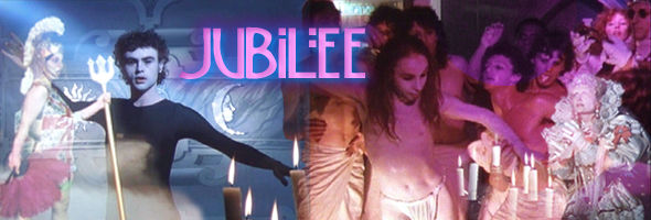 Early video editions (especially the one from Mystic Fire) of Jubilee were a smeary mess, but here the vivid color schemes remain in check. The first DVD option to hit the market from the UK's DVD Second Sight offers a generally pleasing fullscreen edition with some element damage (including one nasty splice an hour into the film) evident from time to time, and the Super 8 bits (including one memorable set piece involving a ballerina and a lot of fire) looking appropriately grainy and worn. The disc also contains a "Face to Face" interview with Jarman running a little under half an hour; shot one year before the director's death, this piece offers a thumbnail sketch of his artistic philosophy and makes for an interesting introduction to his work for newcomers wary of jumping into the deep end with the films themselves. More lavish is the American disc from Criterion, which presents the film in a sharp, appreciably more pristine letterboxed edition which adds slight information to the sides while trimming about as much extraneous space from the top and bottom. (On an anamorphic television which crops 1.66:1 transfers to 1.78:1, however, there's a lot of tight headroom, so adjust accordingly.) The biggest extra is a half hour documentary, "Jubilee: A Time Less Golden," created by actor Spencer Leigh (who jumped on the Jarman ship with 1986's more sedate Caravaggio). Runacre, Willcox, film writer Tony Rayns, production designer Christopher Hobbs, and filmmakers John Maybury and Lee Drysdale offer their memories and observations about Jarman and this film in particular. Looking warm and wholesome, the charmingly accented Willcox scores the most memorable points as she recalls her trepidation as an unskilled actress thrown into such a challenging project. Also included is a short 8mm film which later became the ballerina-and-scissors vision in the film (though minus the feature's nudity), a lengthy gallery of black and white continuity snapshots, various stills and scrapbook tidbits, and the raucous original trailer, as well as historical notes by Jarman scholar Tony Peake. The disc also offers optional English subtitles for those having trouble with the hodgepodge of accents.