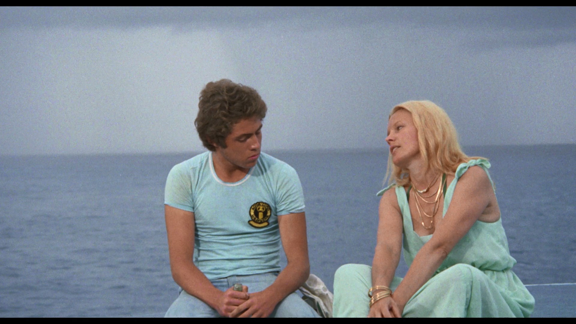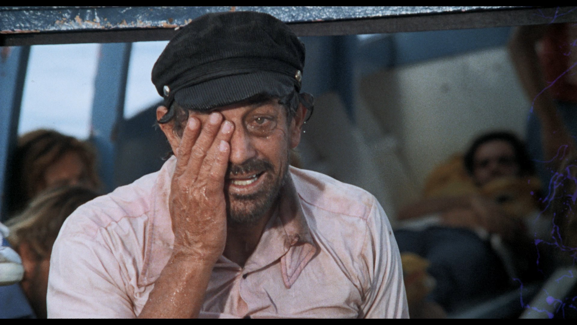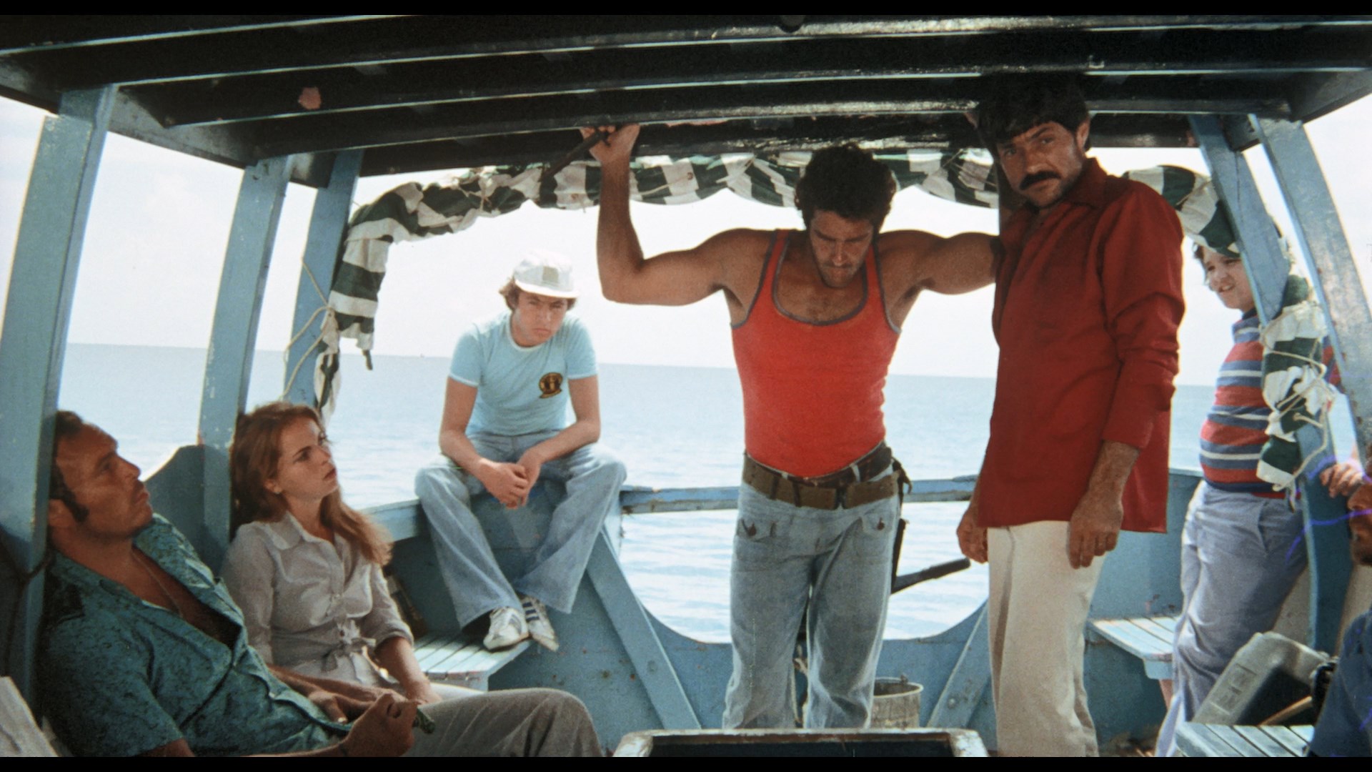 the Damned) and mostly sat around ignored until Synapse Films released it on DVD in 2005 with a colorful widescreen transfer of the standard English version. Extras on that disc include an alternate credit sequence as Terror Storm and bonus trailers including Tintorera, Danger Girls, The Deadly Spawn, and Olga's Girls, all of which should be programmed together for a film festival someday in that exact order. The Vinegar Syndrome Blu-ray marks the first time both the English and Spanish versions have been collected together, the former from a good theatrical print that's brighter and much more detailed than the earlier DVD with more image info visible on the edges. There's some visible element damage on the right side during one reel (see the fifth frame grab comparison below), but otherwise it's in pretty good shape. The Spanish version is another fresh 4K scan from the negative and looks about as good as it could; interestingly, the color processing between the versions is a bit different with reds in particular looking more subdued and natural in the Spanish but more hot and orange-leaning in the English one. The DTS-HD MA 2.0 mono audio is fine for both. In "Surviving the Cyclone" (18m29s), Cardona III returns for another exploration of the making of the film (he acted again in this one, too), explaining how this was made in quick succession after Tintorera and The Bermuda Triangle with an eye on global distribution all the way. He also notes that some different takes were done for the Italian version as well, though that version isn't included here and was reportedly very heavily cut. Then in "The Eye of the Cyclone" (32m36s), Iacono talks some more about being a producer in Mexico after some disastrous releases in Italy, the Lando Buzzanca comedy in Italy that changed the course of his career, the local logistics necessary to pull off the plane sequence, and even working with the Mexican Navy. Finally in "Beware of Sharks" (16m27s), Baker chats over Zoom with Brad Henderson about meeting Cardona, loving the experience in Cozumel, the iffy nature of Mexican stunt work, and her refusal to jump in the water with a shark even if it was "tired!" A gallery (2m39s) of stills and a pressbook is also included. Vinegar Syndrome (Spanish version) (Blu-ray)