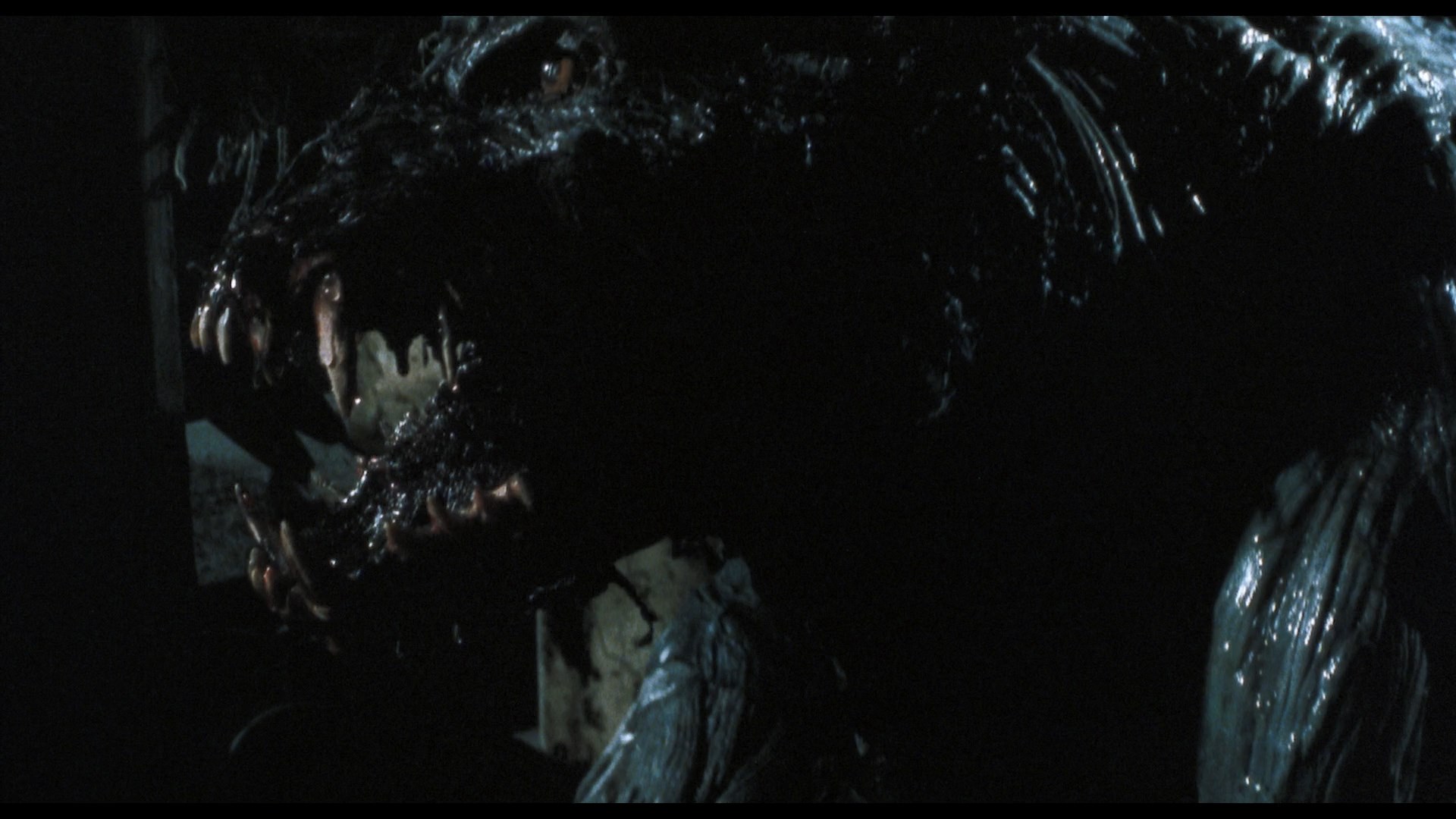 great with dynamic channel separation throughout that makes this a real treat for the ears. The theatrical version still has an Ultra Stereo logo but is in DTS-HD MA mono here, sounding a lot weaker by comparison. Both options come with optional English SDH subtitles. Tenney's all over this release including contributing a bemused video intro (1m34s) and joining both Savoy and Kilpatrick for different audio commentaries over both cuts of the film. The director's cut commentary is definitely the more informative as they recall their positive experiences working together, the challenges of picking up shooting on scenes that had already been partially shot by someone else in a handful of cases, and the pluses and minuses of shooting in Tucson. The theatrical track is a lot looser as they swap more production anecdotes and mostly use it to take down the vandalism committed against the film, which also makes for pretty lively listening on its own. The one video extra here is a hefty one: "From Chicken Shit to Chicken Salad: Unearthing the Lost Cellar" (46m12s), a lighthearted look at the making (and unmaking) of the film with Tenney, Kilpatrick, Savoy, producer Steve Berman, creature creator Kevin Brennan, and composer Dennis Tenney separately recalling their careers to that point, the production process, the less than ideal creation of the main monster, and the familial aspect of the film that appealed to them even if the final result didn't quite go as planned.