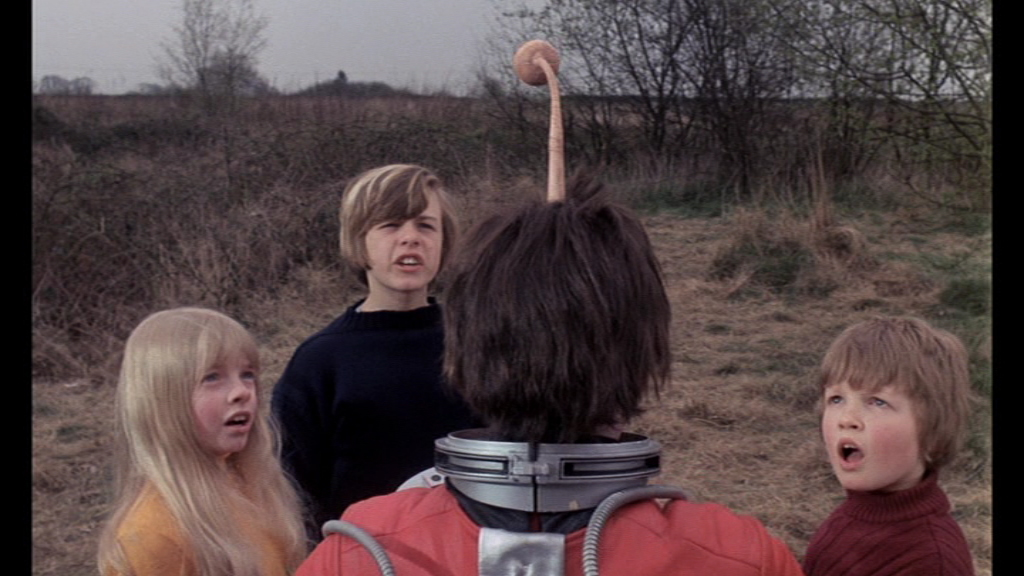 Next we jump to vivid color for the 1972 offering Kadoyng, an off-kilter yarn in which three kids out in the woods are startled when a gold spaceship shaped like a giant (American) football turns up with a clumsy human-like visitor emerging on a ladder. As it turns out, the traveler (Maguire) also has the ability to teleport. He claims to be from Stoikal , a "super planet" filled with "mental and physical giants" (which would make him a bit of a runt). Oh, and he has an extrasensory ball on a stalk sticking out of the top of his head (which has to be covered with a top hat). Inside the ship is an unseen companion on the ship named Babble, whose true nature will become apparent later, and of course the kids decide to bring him home and introduce him