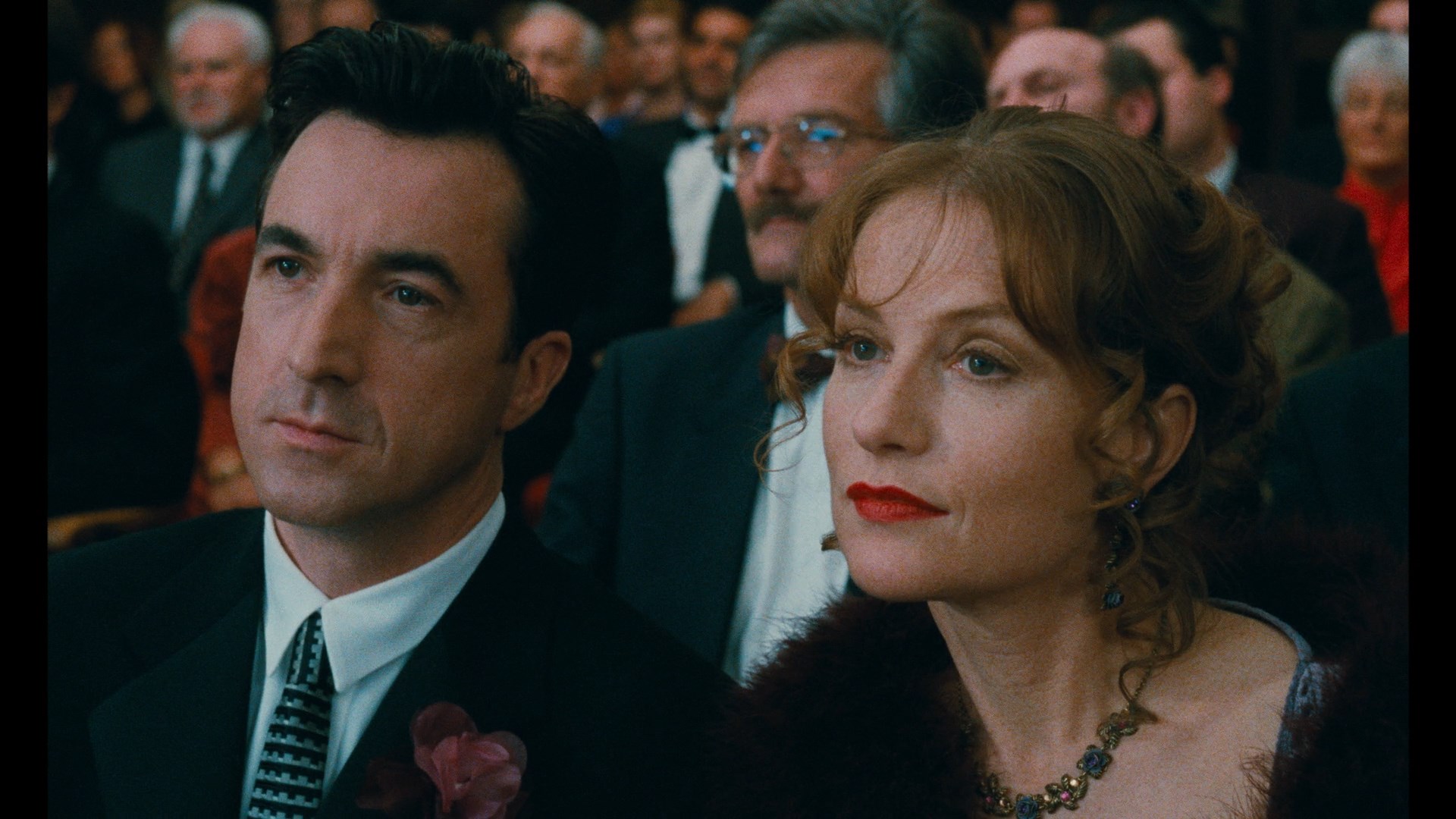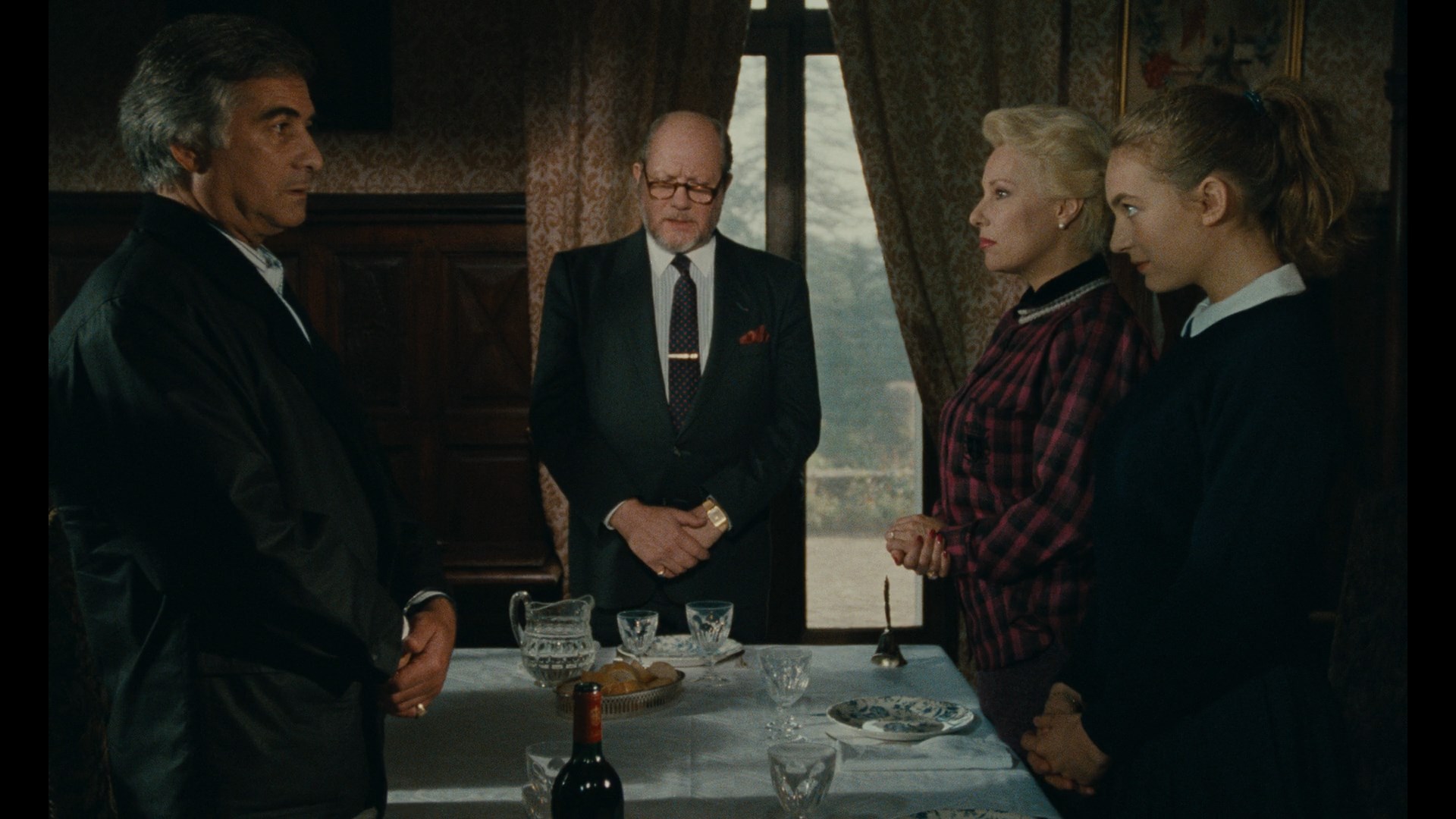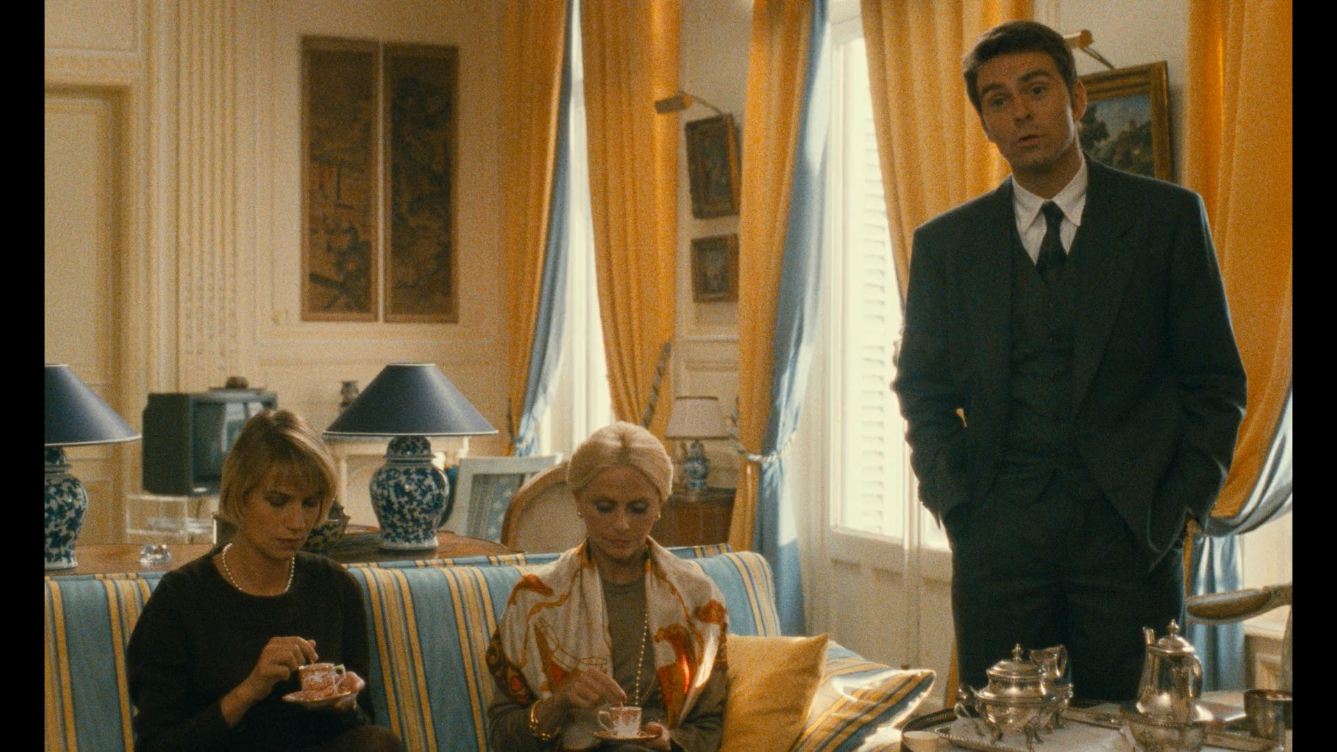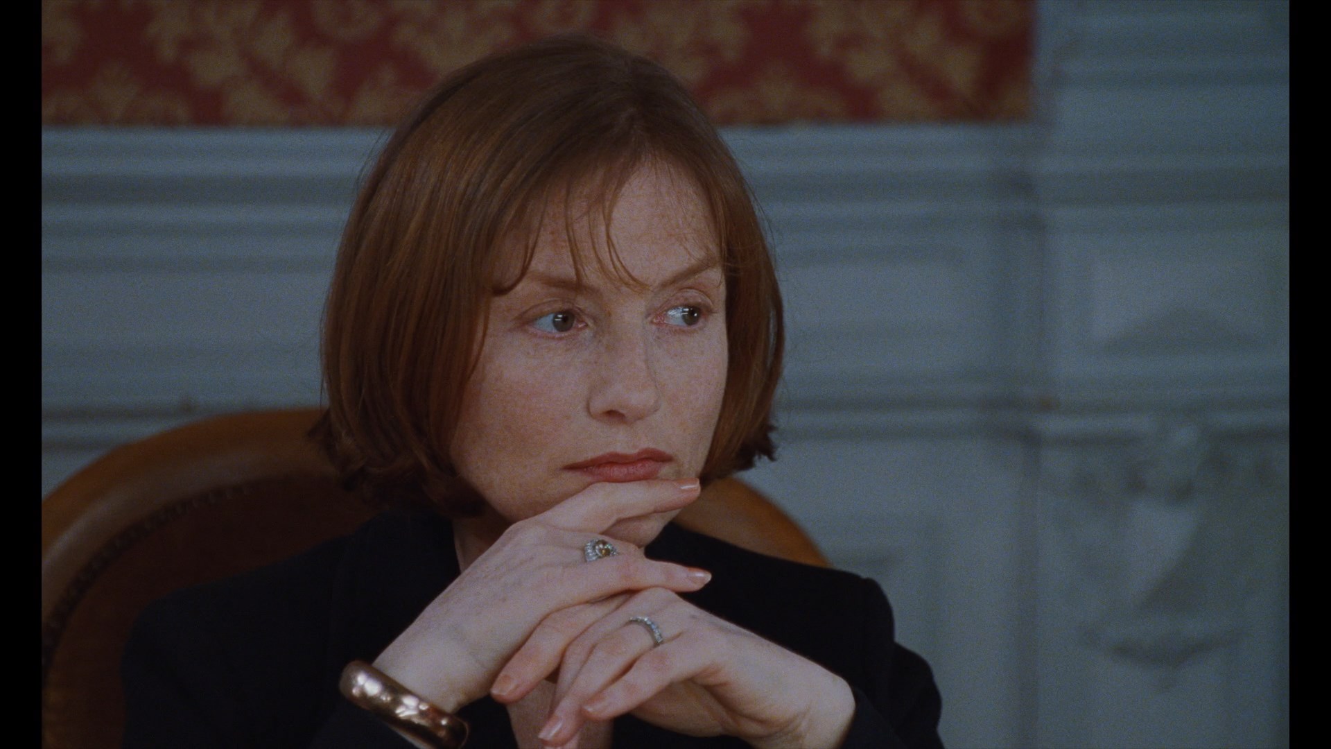 Cérémonie. Released in the U.S. by New Yorker Films both theatrically and on VHS, this eventually went over to Cohen for a pretty nice Blu-ray release in 2016 featuring a Major and Klein commentary, a reissue trailer, and a "Many Forms of Love" interview with Cluzet (42m32s) by New York Film Festival director Kent Jones covering the actor's work with Chabrol. The Arrow Blu-ray is the only one of the second batch to retain the yellow leaning, though it's toned down here relatively speaking and not that bad once your eyes get used to it after a while. Otherwise it looks good with fine detail throughout. A new commentary by Barry Forshaw and Sean Hogan helps put the film in context within Chabrol's career and really goes into the nature of how his tendency to crank out films at a rapid pace hampered his status among the auteur-centric crowd but ultimately may have helped him in the long run. In "Chabrol’s 'Soap Bubble'" (14m36s), Catherine Dousteyssier-Khoze (author of Claude Chabrol: The Aesthetics of Opacity) uses Chabrol's own term for this film (thus the title) as a jumping-off point for analyzing some of his more playful efforts like this and Blue Panther, with an exploration of how production design choices reflect his twisty stories. The Zoom conversation "Film as a Family Affair" (38m11s) features Chabrol's stepdaughter and frequent assistant, Cécile Maistre-Chabrol, chatting about her first exposure to show business through the theater, their working relationship, his pun-loving personality, and his methods on set. Also included are a Magny intro (2m28s) about the film's significance to Chabrol despite its middling box office reception in France, scene specific Chabrol commentaries (24m20s), an EPK-style vintage making-of featurette (8m22s) with the cast and crew, an interview with Huppert (25m38s) conducted by MK2 covering her first meeting with Chabrol and their working process together, the French trailer, and a stills gallery.