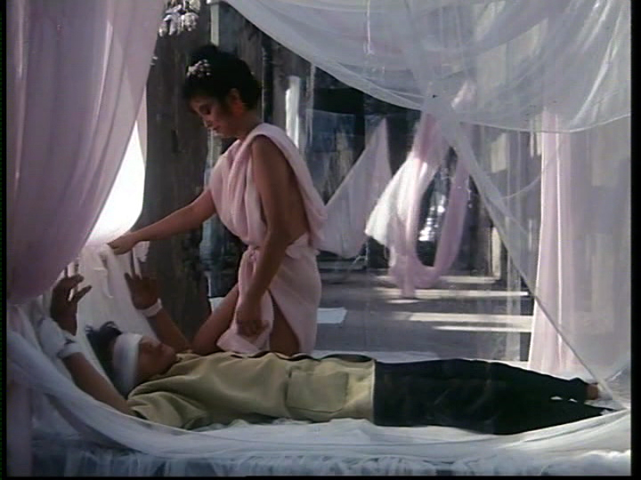 his being a D'Amato film, there's a lot of softcore moaning and sighing, copious female nudity, and a hilariously sick, bloody twist ending that pretty much kills off any randiness for male viewers in the audience. The film does its best to mimic the look of Hong Kong erotic and horror films of the period, complete with lots of flowing transparent gowns, billowing curtains, and dappled sunlight, and as far as copycats go, it gets pretty darn close at times. It's certainly an odd duck in the director's filmography and marks a farewell of sorts to his career in both soft erotica and horror, since he jumped from this into a lengthy run of hardcore variations on famous historical and fictional characters until his death in 1999. It was also the last film for his company Filmirage, which had become something of a trash VHS institution with titles like 11 Days 11 Nights, Troll 2, Witchery, and by far their best film, Stage Fright.