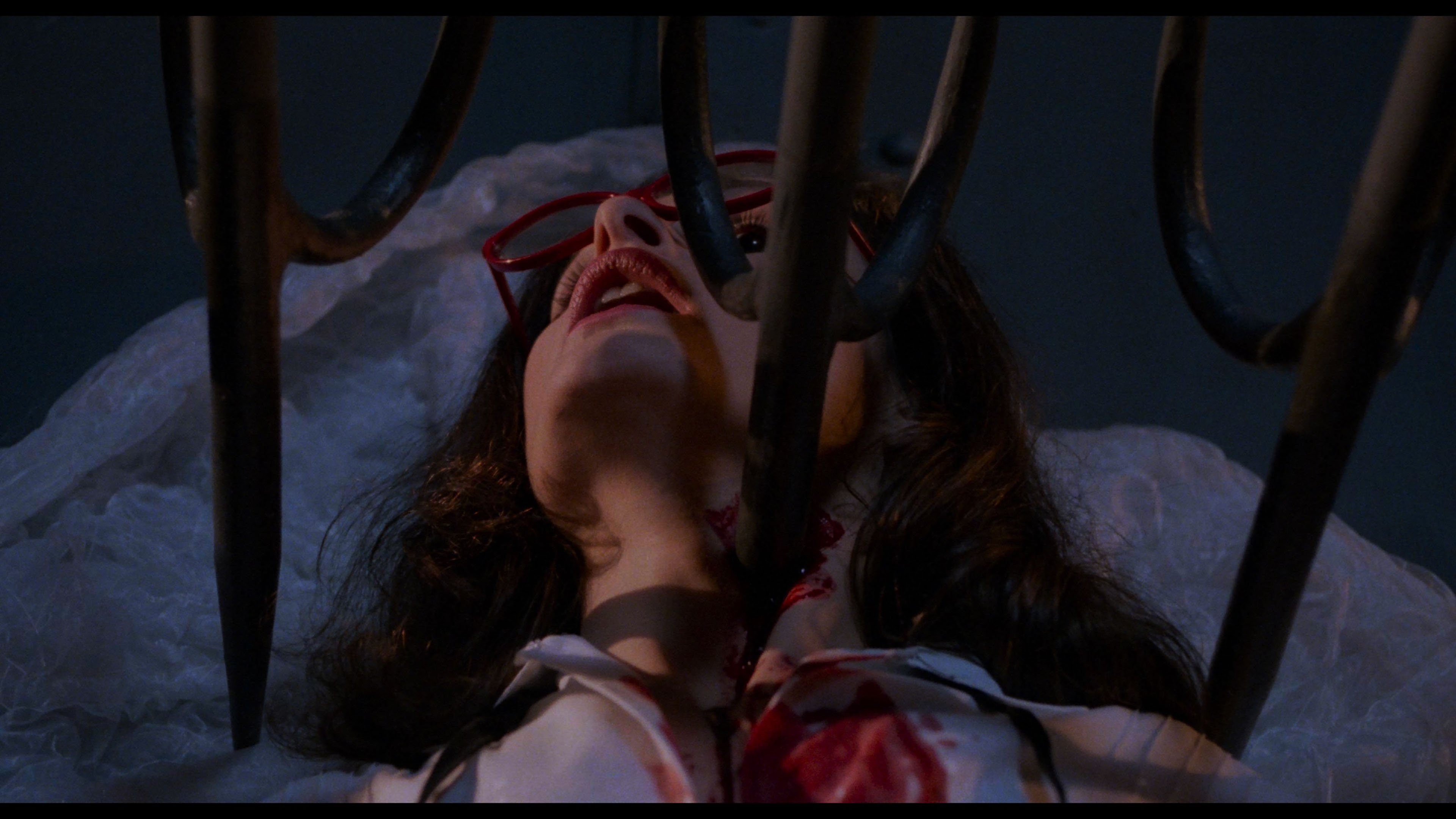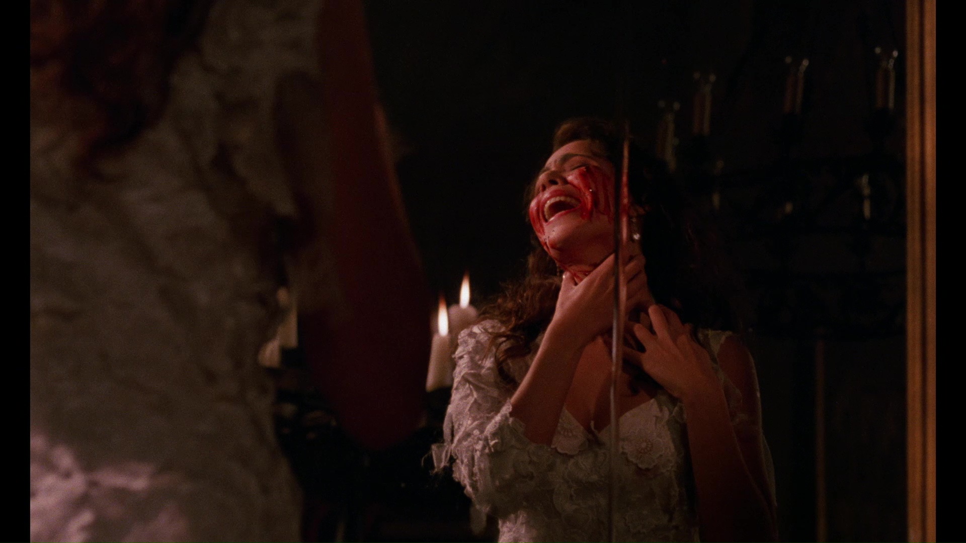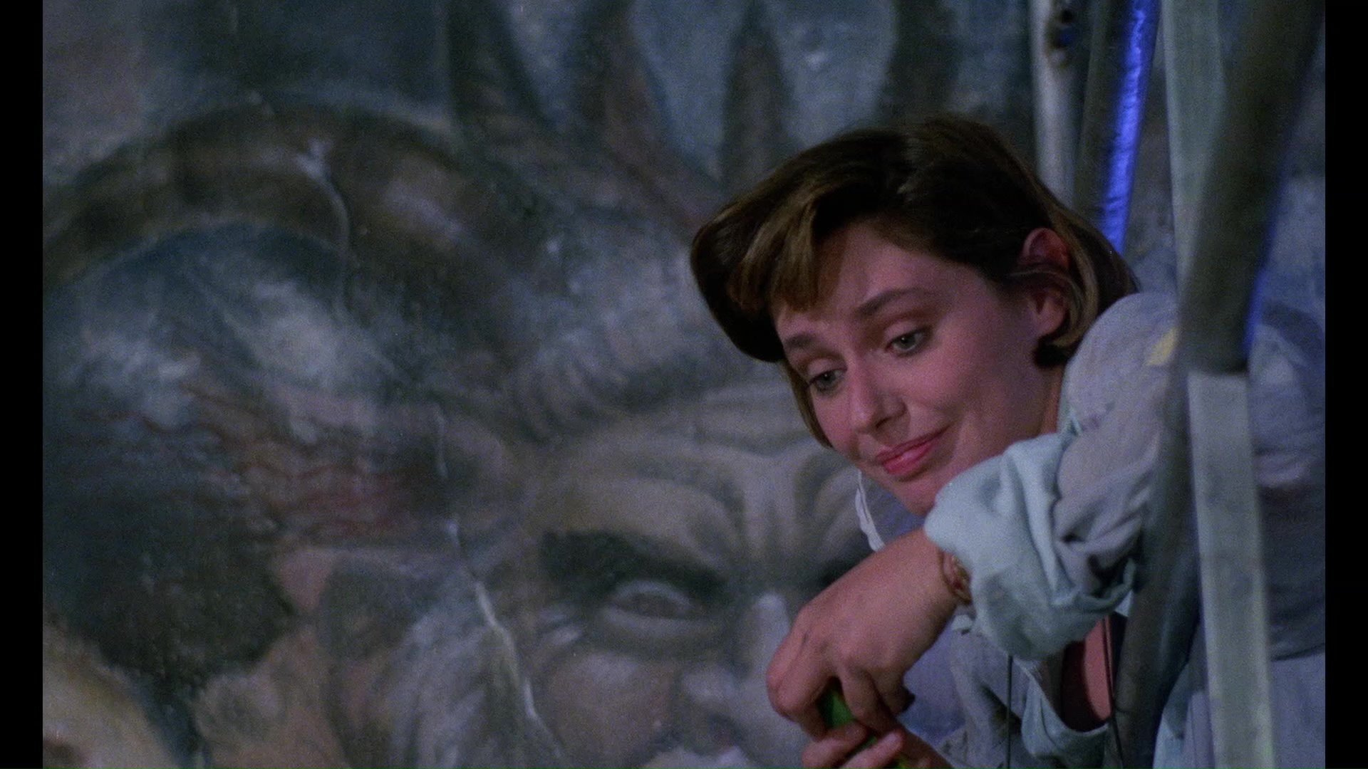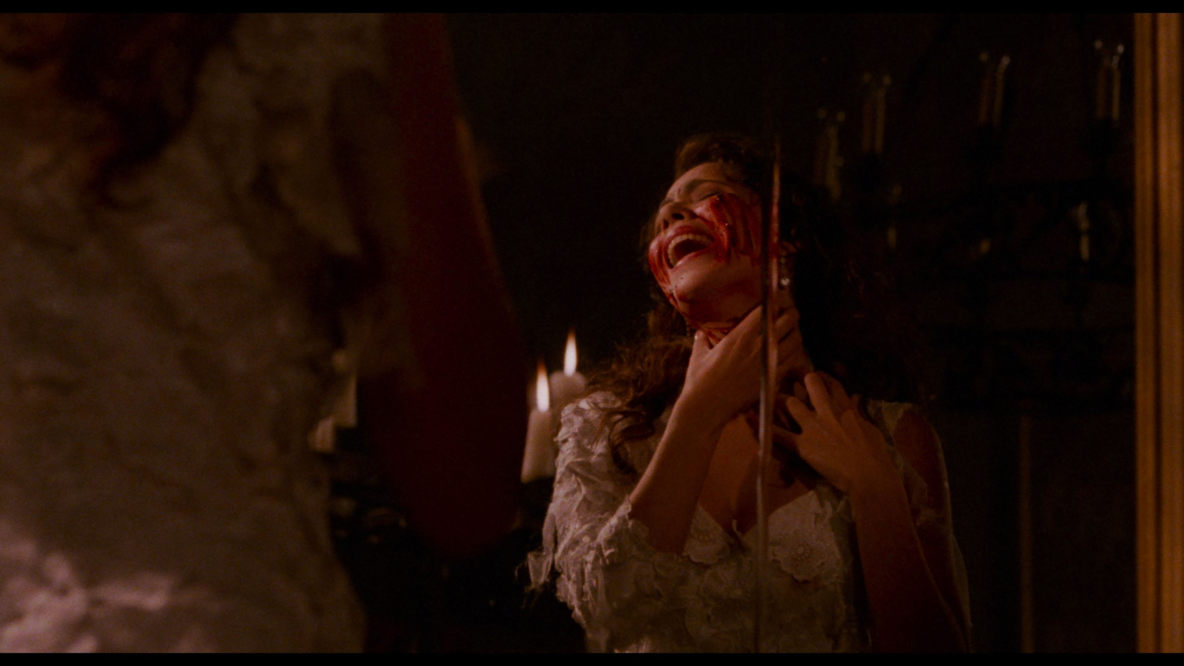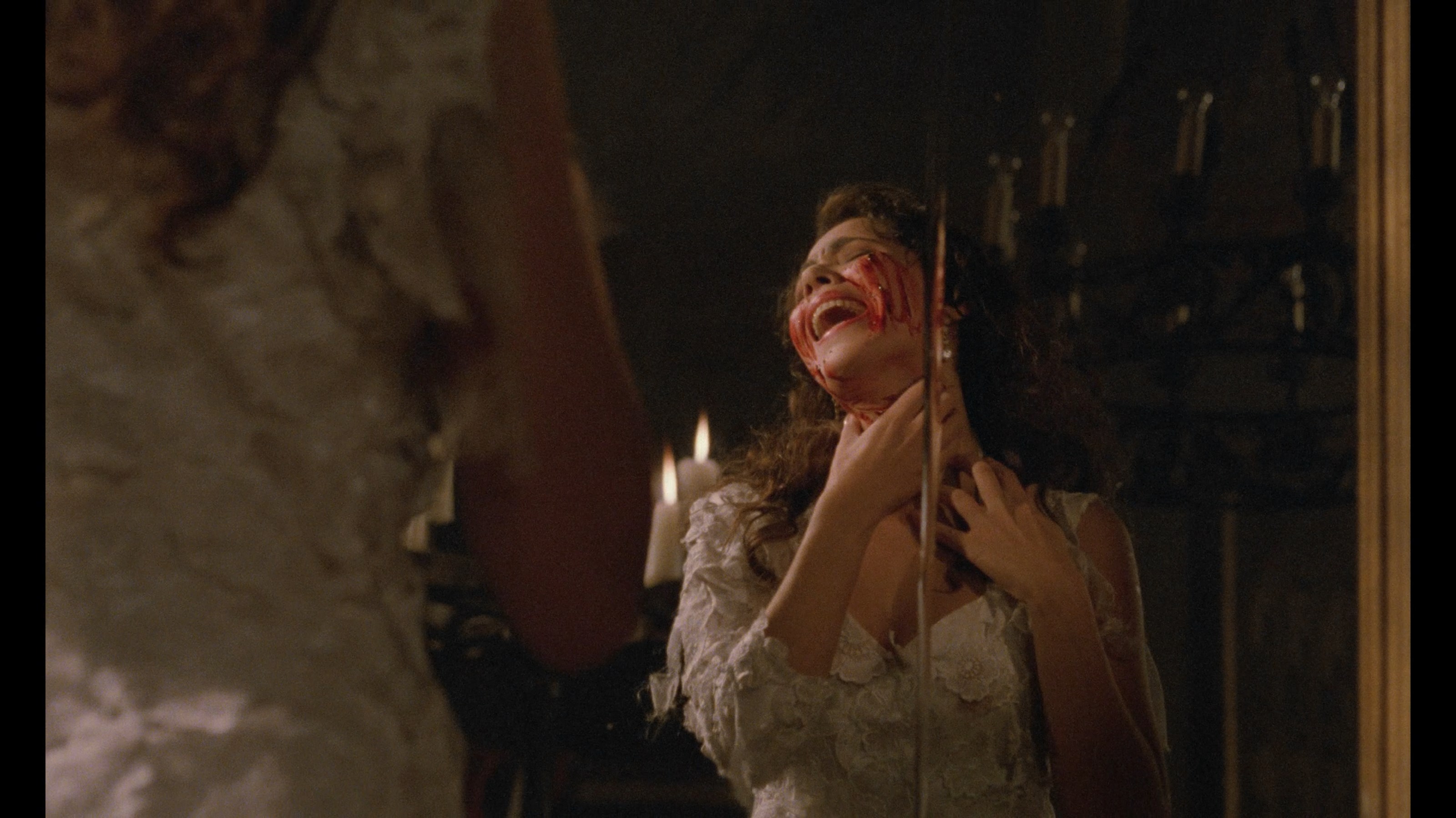 In 2023, Severin Films bowed the film on 4K UHD as part of a three-disc set also containing a new Blu-ray edition and a soundtrack CD (plus a webstore exclusive slipcover and a booklet with an essay by Claire Donner). The UHD features the main feature with DTS-HD MA English 2.0 stereo and Italian 2.0 mono options with optional English subtitles, as well as a shockingly robust 5.1 English track that's easily the clearest and most energetic this film has sounded to date. The film is matted here at 1.85:1, which works as well as the other framing options out there, and looks excellent here with the most vivid and convincing color timing to date. The UHD also features the trailer, which is present on the Blu-ray along with a huge batch of featurettes both old and new. Ported over from the Scorpion release but with new credits are "The Mystery of the Cathedrals" (19m46s) with Soavi, "Alchemical Possession" (12m41s) with Dario Argento, "Lotte" (8m36s) with Asia Argento, "Father Giovanni" (14m14s) with Radice, "Holy Ground" (9m46s) with Casagni, "Building the Church" (20m46s) with Geleng, and "The Eleventh Commandment" (13m18s), a redo of the Franco Ferrini interview with much better optional English subtitles. The six new featurettes begin with "The Ghostwriter" (18m36s) with co-screenwriter Dardano Sacchetti talking about the project's evolution during and post-Lamberto Bava as well as the process of getting horror films off the ground by that rockier point in the industry. Perhaps the most valuable addition here is "Here Comes the Bride" (10m56s) with Antonella Vitale finally going in front of the camera, warmly recalling how her two big effects sequences were executed involving the gigantic wedding dress and, later on, lots of pumps and latex appliances on her face. "A Demon Named Evan" (25m37s) is a new, different interview with Tomas Arana, going over his fondness for the film and the crazier stories he's shared (especially involving Chaliapin). Effects legend Sergio Stivaletti comes next in "Monsters and Demons" (19m41s) covering the menagerie of creatures he had to make for the film and the artistic inspirations Soavi pointed to from fantasy paintings and medieval artwork that he wanted to incorporate. Then in "The Right-Hand Man" (16m50s), assistant director Claudio Lattanzi recalls the daunting nature of the production in Hamburg and Budapest with lots of challenges involving the many actors, scenes, and intricate visual tricks needed to pull it off. Finally Profondo Argento author Alan Jones gives a short summation of the film's genesis and evolution in "Return To The Land Of The Demons" (5m59s), praising the end result while alluding to a few gossipy bits along the way.