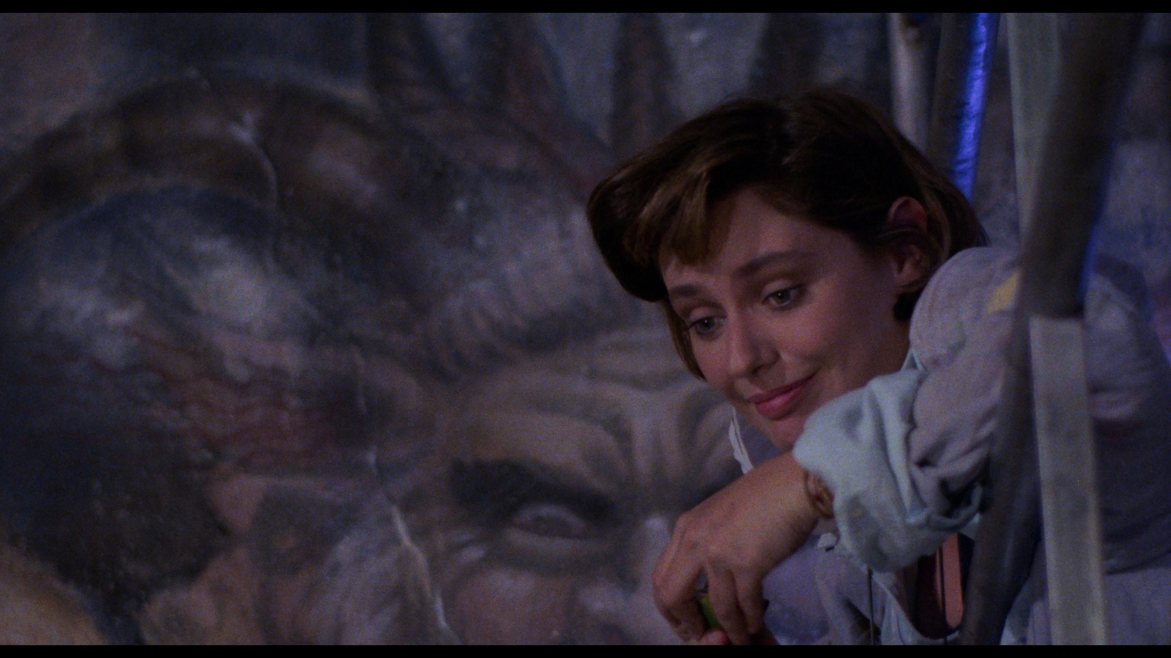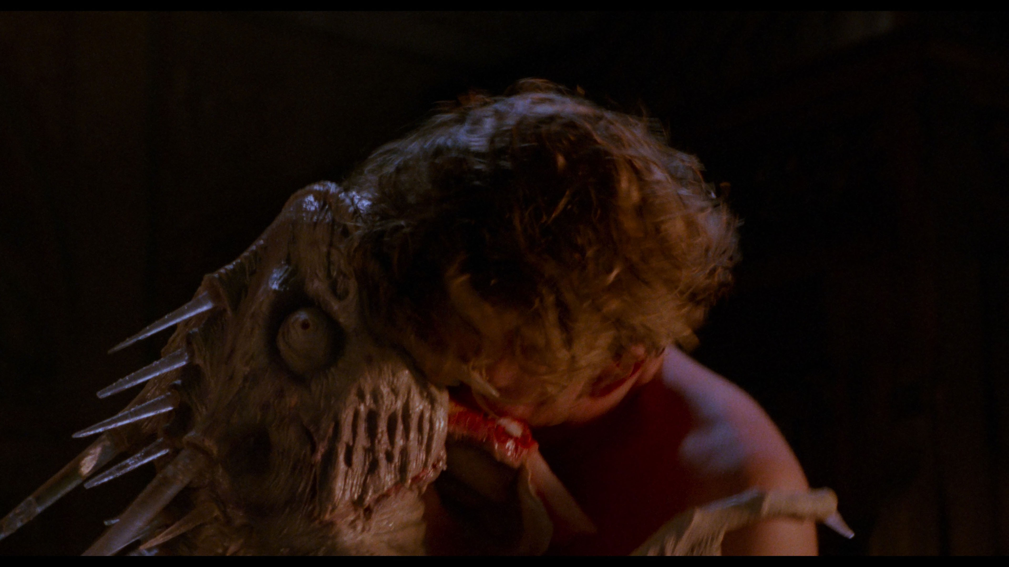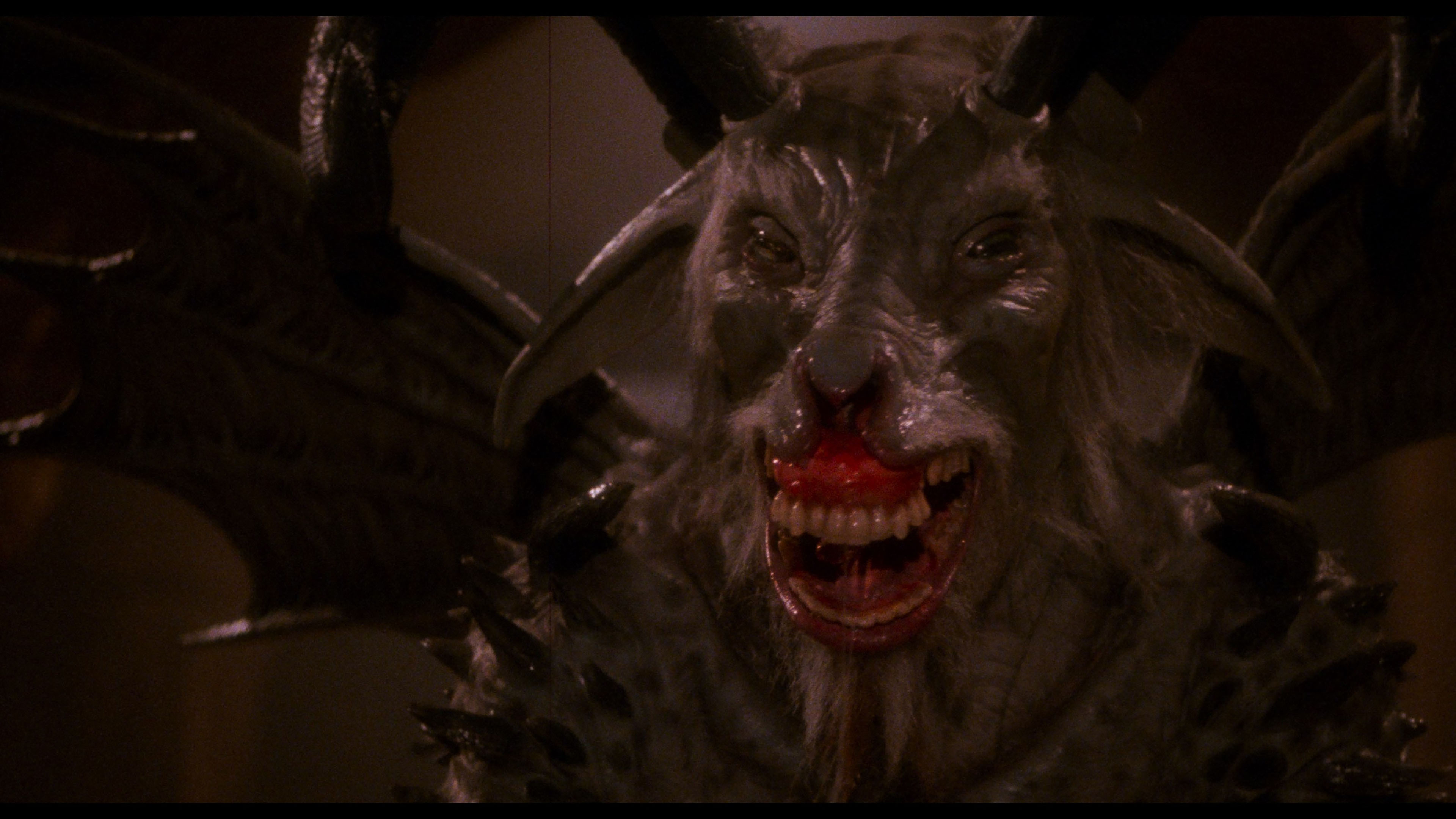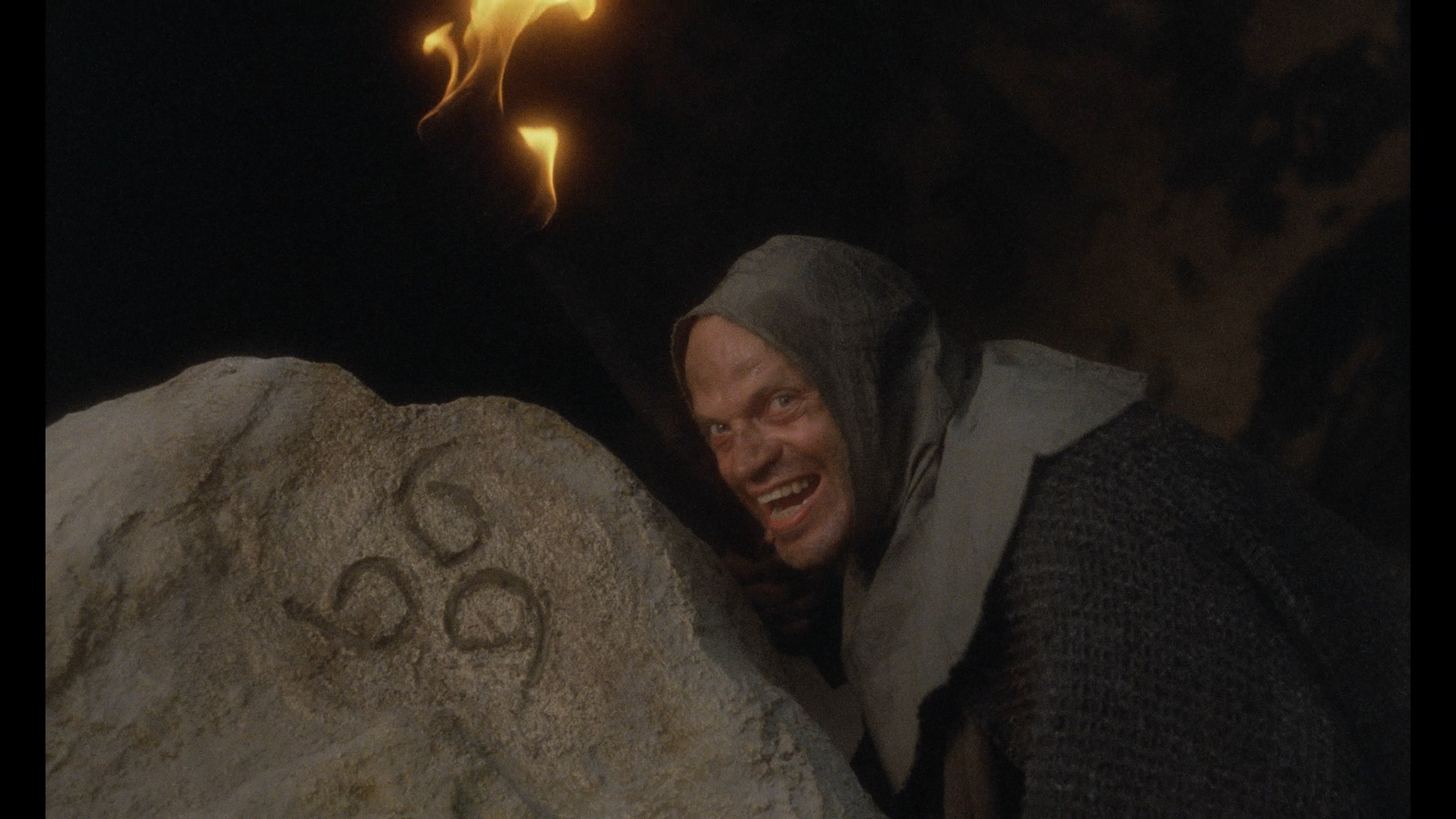 In 2023, Severin Films bowed the film on 4K UHD as part of a three-disc set also containing a new Blu-ray edition and a soundtrack CD (plus a webstore exclusive slipcover and a booklet with an essay by Claire Donner). The UHD features the main feature with DTS-HD MA English 2.0 stereo and Italian 2.0 mono options with optional English subtitles, as well as a shockingly robust 5.1 English track that's easily the clearest and most energetic this film has sounded to date. The film is matted here at 1.85:1, which works as well as the other framing options out there, and looks excellent here with the most vivid and convincing color timing to date. The UHD also features the trailer, which is present on the Blu-ray along with a huge batch of featurettes both old and new. Ported over from the Scorpion release but with new credits are "The Mystery of the Cathedrals" (19m46s) with Soavi, "Alchemical Possession" (12m41s) with Dario Argento, "Lotte" (8m36s) with Asia Argento, "Father Giovanni" (14m14s) with Radice, "Holy Ground" (9m46s) with Casagni, "Building the Church" (20m46s) with Geleng, and "The Eleventh Commandment" (13m18s), a redo of the Franco Ferrini interview with much better optional English subtitles. The six new featurettes begin with "The Ghostwriter" (18m36s) with co-screenwriter Dardano Sacchetti talking about the project's evolution during and post-Lamberto Bava as well as the process of getting horror films off the ground by that rockier point in the industry. Perhaps the most valuable addition here is "Here Comes the Bride" (10m56s) with Antonella Vitale finally going in front of the camera, warmly recalling how her two big effects sequences were executed involving the gigantic wedding dress and, later on, lots of pumps and latex appliances on her face. "A Demon Named Evan" (25m37s) is a new, different interview with Tomas Arana, going over his fondness for the film and the crazier stories he's shared (especially involving Chaliapin). Effects legend Sergio Stivaletti comes next in "Monsters and Demons" (19m41s) covering the menagerie of creatures he had to make for the film and the artistic inspirations Soavi pointed to from fantasy paintings and medieval artwork that he wanted to incorporate. Then in "The Right-Hand Man" (16m50s), assistant director Claudio Lattanzi recalls the daunting nature of the production in Hamburg and Budapest with lots of challenges involving the many actors, scenes, and intricate visual tricks needed to pull it off. Finally Profondo Argento author Alan Jones gives a short summation of the film's genesis and evolution in "Return To The Land Of The Demons" (5m59s), praising the end result while alluding to a few gossipy bits along the way.