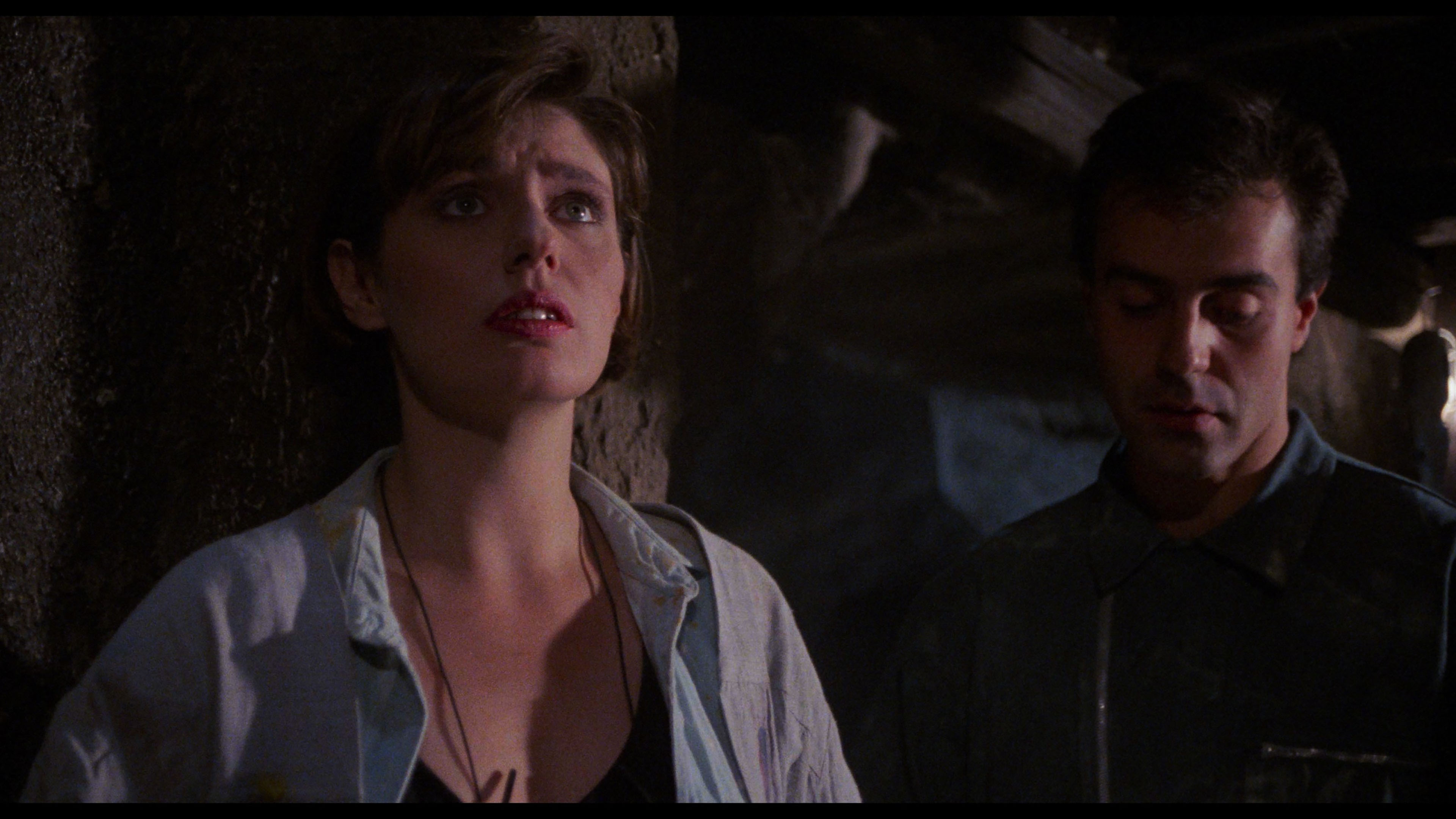 In March of 2018, The Church made its U.S. Blu-ray debut from Scorpion Releasing via Doppelganger with a standard one-disc retail edition, featuring a presentation from what may be a scan of the same core film source with the English credits here instead of Italian. It also looks a couple of notches darker and richer with significantly more saturated colors (the reds are intense!), so fans should be very pleased. (Frame grabs in the body of this review are from the Scorpion; comparison ones can be seen below.) The DTS-HD MA English 2.0 audio also sounds very good considering the limitations of the original mediocre mix. This single-disc release does come with a different Soavi interview (19m48s), about how he grew up into a film buff, hooked up with Argento as a producer and developed this from the ashes of the abandoned third Demons film, and had to assemble the soundtrack piecemeal since Keith Emerson lived in London at the time. A new interview with Asia Argento (8m26s), "Lotte," features the actress and director recalling one of her earliest roles shooting in a memorable Budapest church and having a lot of fun on the set as a kid ("lots of blood, masks, special effects... it was amazing"). The theatrical trailer is The Churchalso included along with bonus The Churchones for The Sect, Sleepless, Opera, The Card Player, and Etoile.