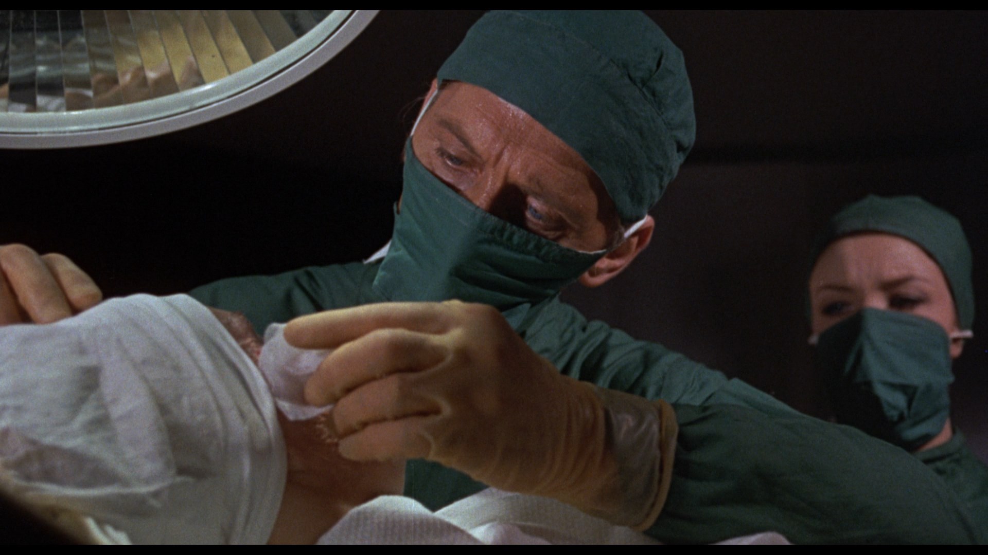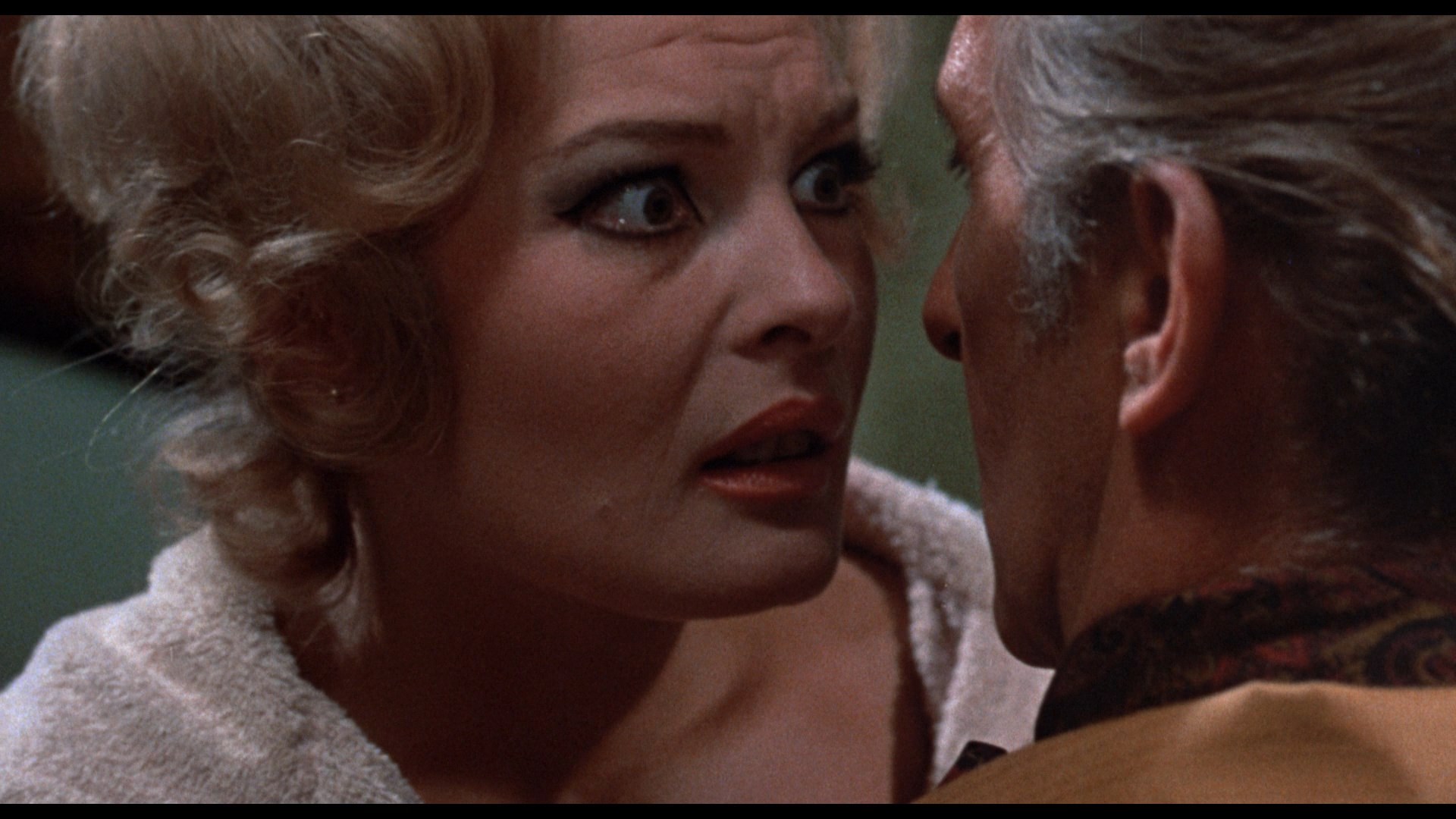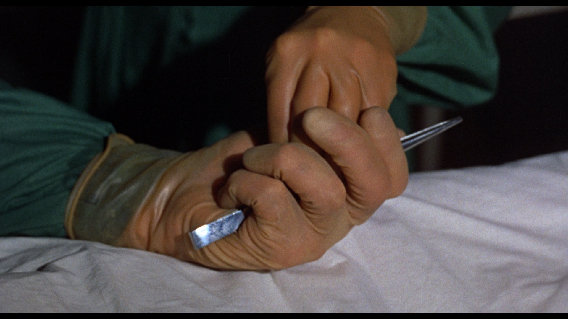 It's worth pointing out that these are completely different edits of the film, with the more graphic one actually running shorter despite the rougher hooker murder and a handful of other brief violent extensions. The DTS-HD mono audio sounds terrific as well, and an isolated music and effects track is included along with an enjoyable audio commentary featuring English Gothic author Jonathan Rigby and Cushing biographer David Miller. They tackle everything from the real state of surgical lasers at the time to the credits of everyone involved, with an understandable focus on Cushing's life and career weaving throughout (including his research methods and insistence on holding scalpels correctly). They also chat about the rare novelization of the film, including its amusing misspelling of said laser and dramatic expansion of several characters.