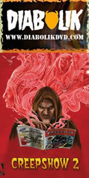 on Blu-ray in the UK with an expanded special edition featuring an improved transfer that cleans up the many speckles and contrast issues of the Image release; extras consist of "Screenplay For A Sequel" (10m46s) with Romero chatting about expanding King's original and preexisting stories into a script (which dropped two additional stories) as well as the other King projects he drifted in and out of over the years, " Tales From The Creep" (7m54s) with Savini chatting about moving from behind the camera to the front of it after the prior film (and ending up in an odd three-picture "pay or play" deal with New World), Savini-as-Creep behind-the-scenes footage (5m51s), the trailer, a TV spot, a still gallery, and bonus 88 Films trailers.