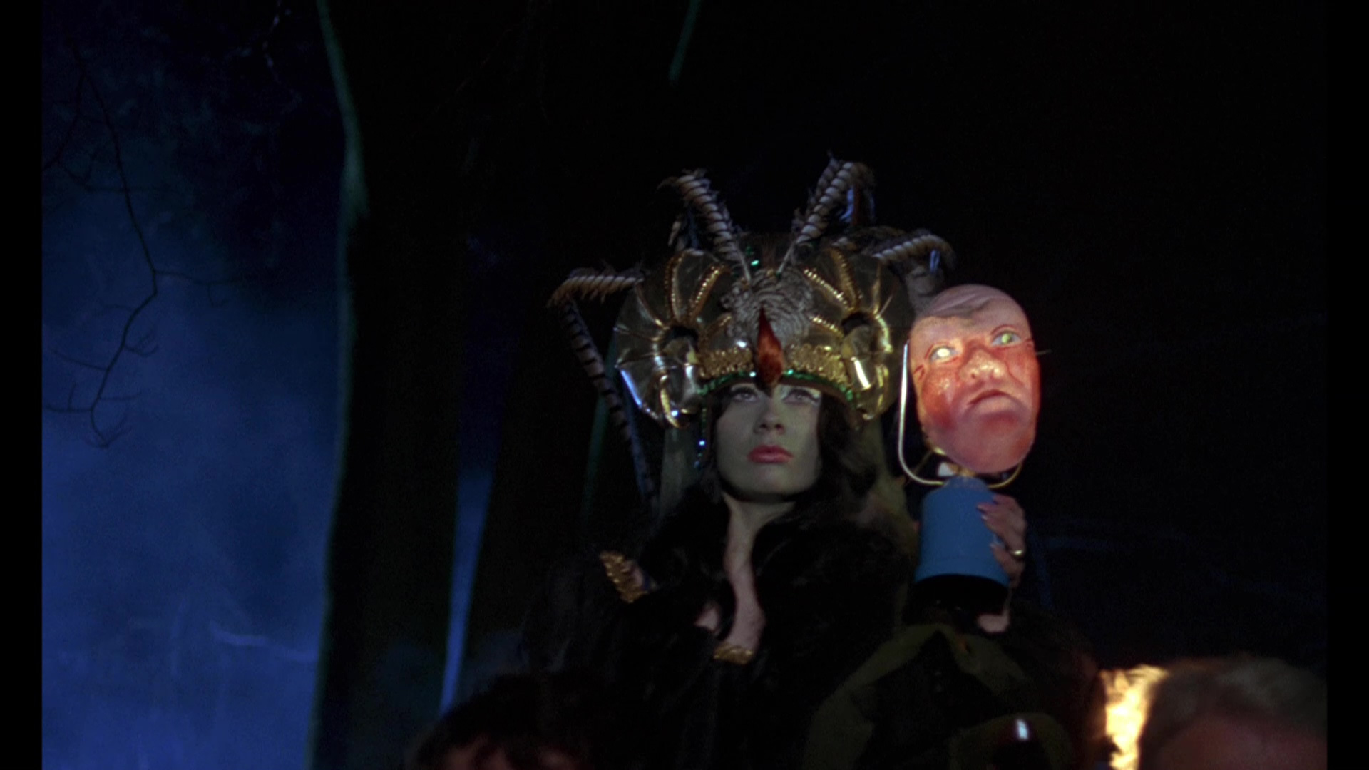 oft-censored footage (the pasty-covered breasts in the opening dream sequence, Wetherell's topless and rear shots, etc.). The psychedelic colors look great with the stylized green, red, and blue lighting in particular popping right off the screen, and the 1.66:1 framing looks accurate. That disc contains an audio commentary with Steele and David Del Valle, which focuses more on her career at the time and the working habits and achievements of Karloff and Lee than the feature itself (which is understandable since she's barely in it), plus a gallery, British trailer, "In Conversation with Christopher Lee" discussion for 47 minutes about his horror days and other life experiences including his military tenure, and a 25-minute "Creating the Curse of the Crimson Altar" featurette with Eden, Wetherell, continuity supervisor Mary Spain, and editor