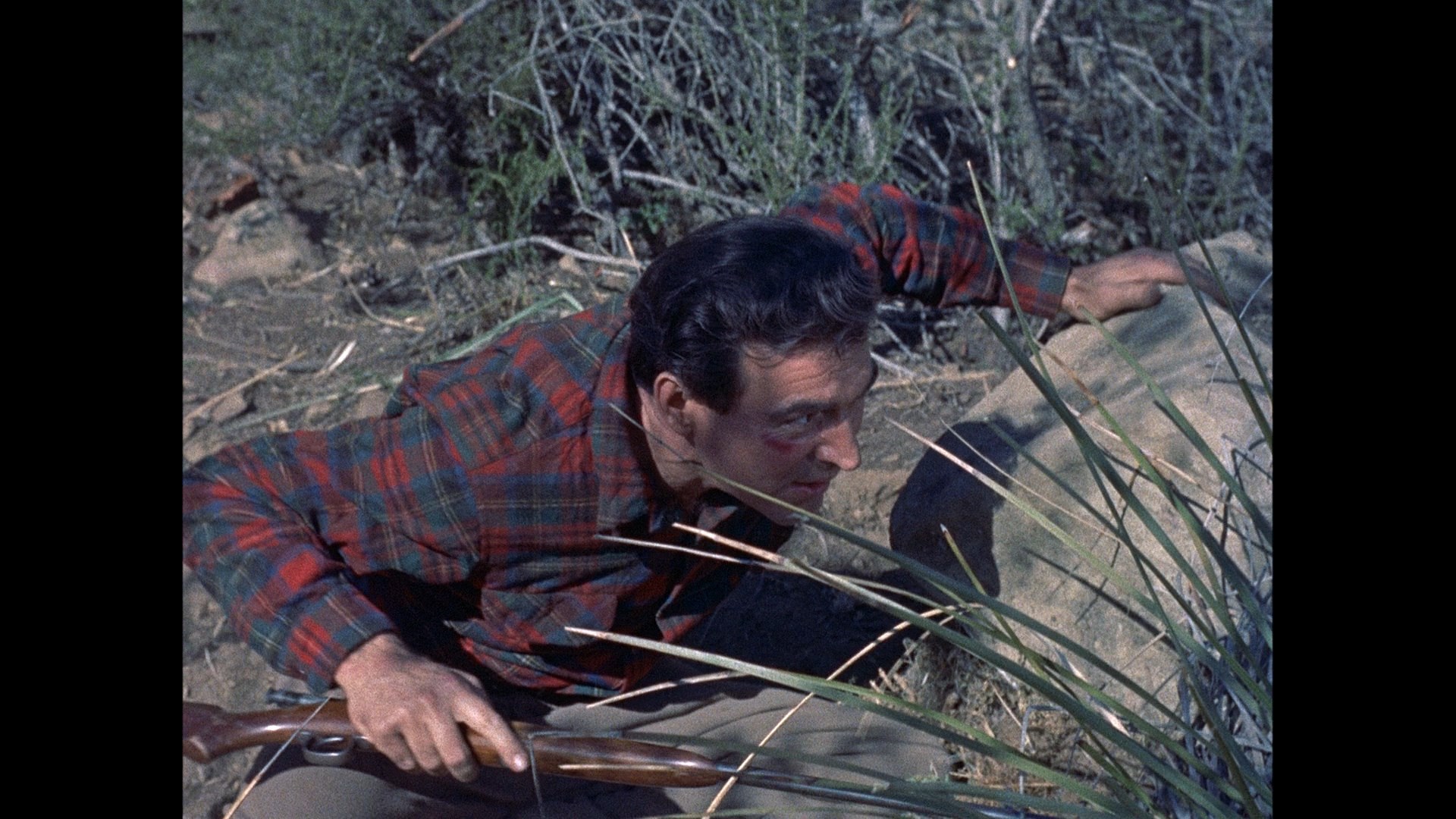very unusual crime-western-melodrama hybrid (a la Inferno) from director John Farrow (Night Has a Thousand Eyes, The Big Clock). The action starts off right away as we see the aftermath of a plane crash in the desert with footprints being left by the two survivors, convict Ed (Motel Hell's Calhoun) and Frank (McNally), seen tussling together and handcuffed at the wrist. Ed manages to knock out Frank and free himself, stumbling through the dust and finally arriving at a ranch owned by David (Aherne) and his daughter, Cally (Simmons). Cally and Ed start to fall for each other, while Frank explains that he's a lawman who's been on the criminal's trail for two years. Unsure whom she can trust, Cally has to make a difficult decision to determine who's actually telling the truth. Featuring a cast of only four speaking roles (plus a resourceful Collie), this is a lean and effective chamber piece with strong performances and effective use of Technicolor including some blazingly blue skies throughout. The plot is also fun as the audience is left guessing for a good chunk of