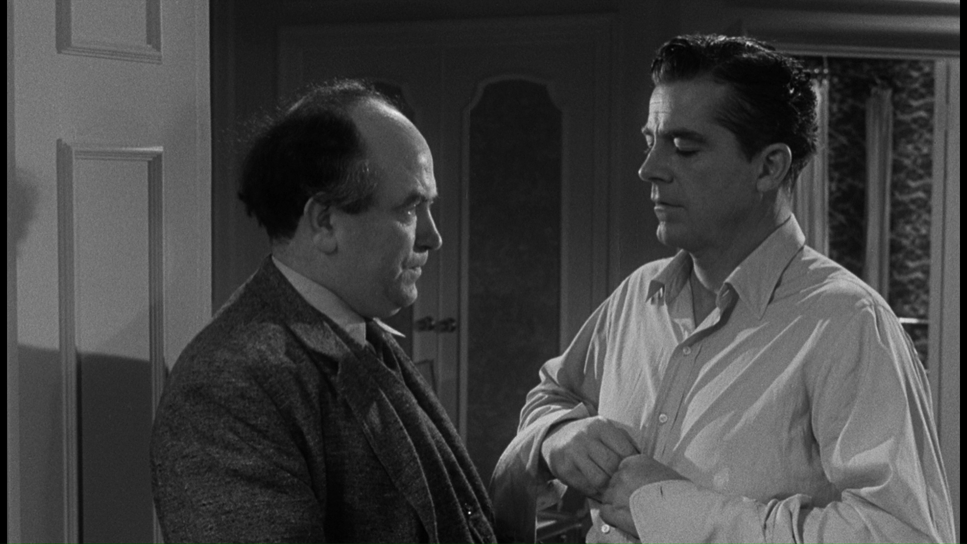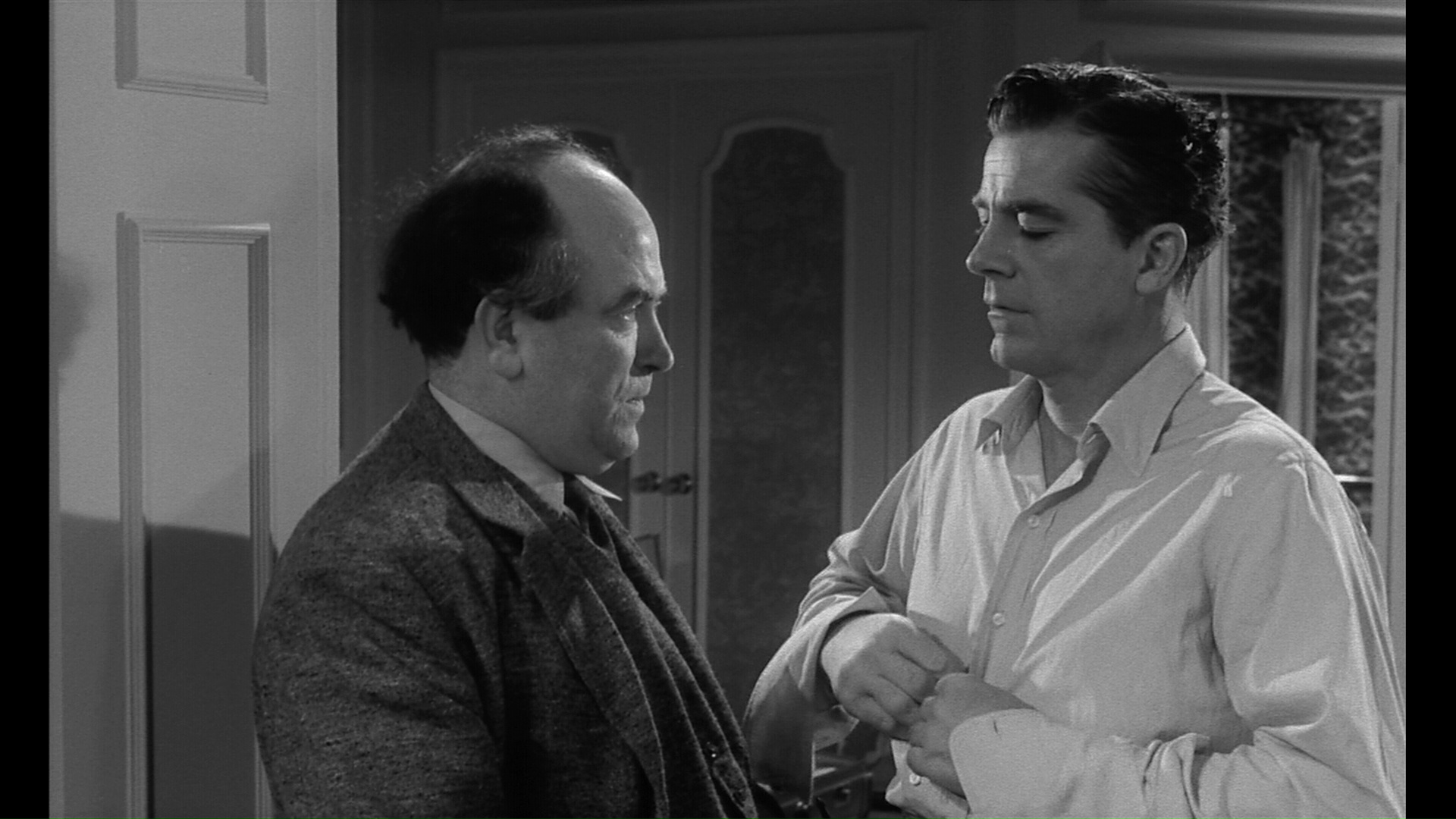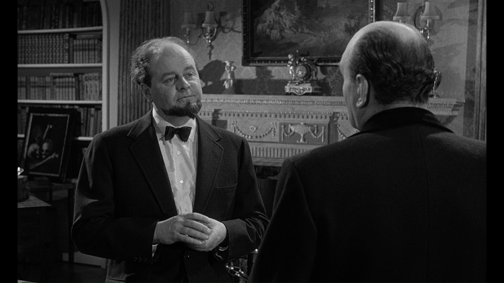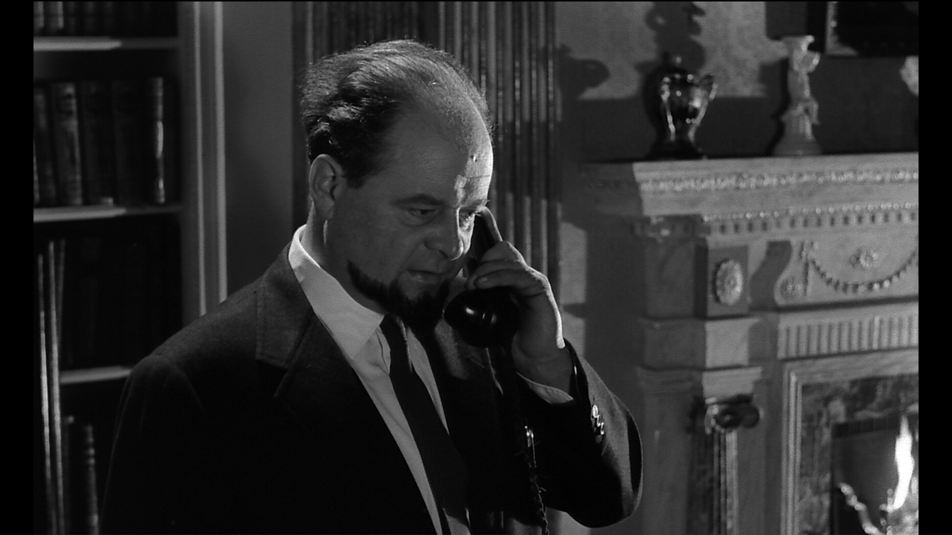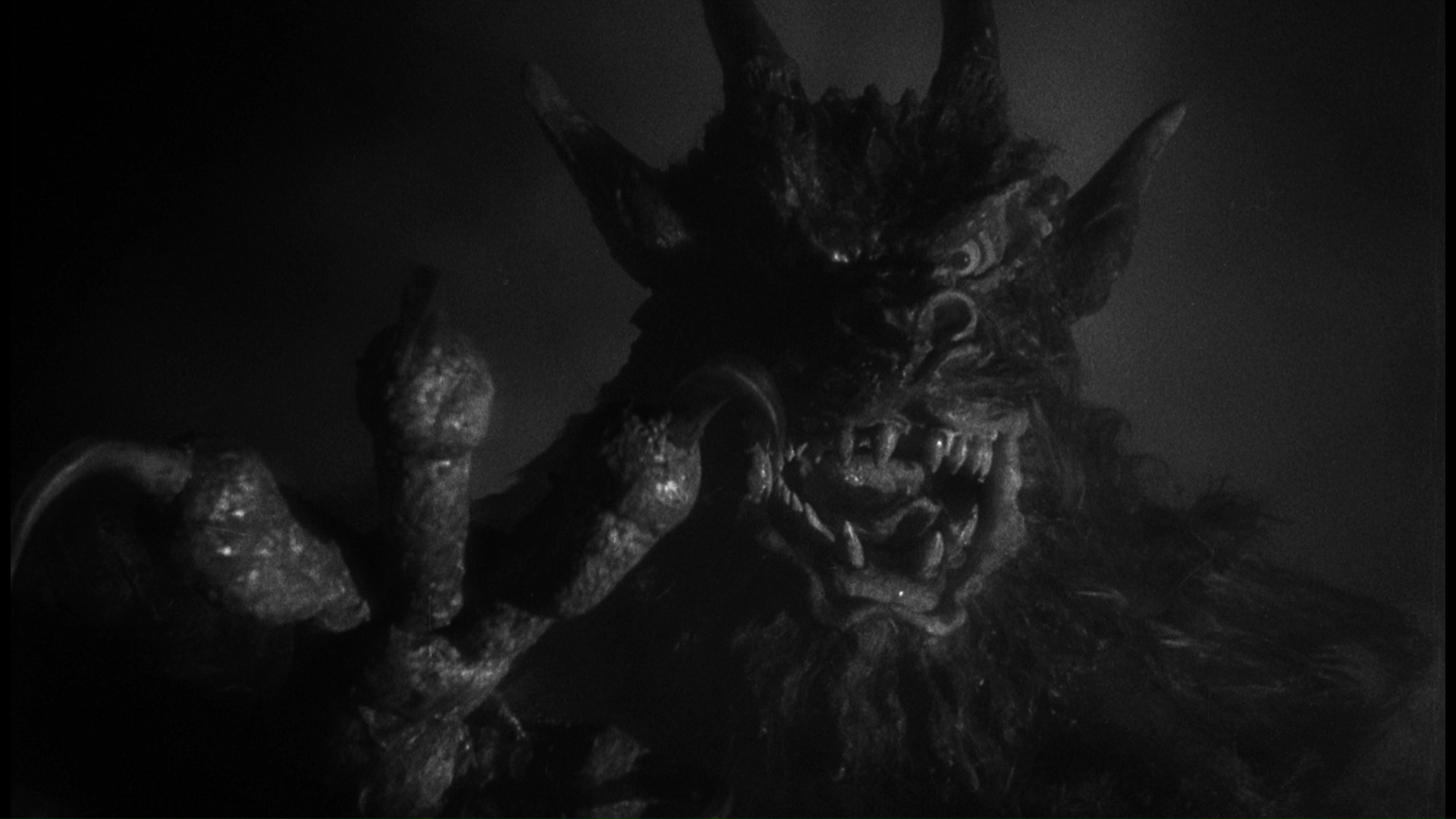 which has appeared on numerous public domain compilations. The first Blu-ray release appeared in France from Wild Side in 2013 (under the evocative title Rendez-vous avec la peur), featuring a 1.66:1 transfer of the uncut and U.S. versions with zero extras but packaged with a very hefty scholarly book in French only. It's unlikely that anyone will ever top the 2018 two-disc Blu-ray edition from Indicator, one of the most lavish treatments of a single genre film you're likely to see. Along with being loaded with extras, it contains multiple versions of the film reflecting its various running times and aspect ratios. Disc one features the uncut Night of the Demon version in both 1.66:1 and the more commonly projected 1.75:1 aspect ratios, along with the full U.S. Curse of the Demon reissue version that played theaters in the early '00s, here with the same 1.75:1/1.66:1 choices. (Due to the lack of a BFI restoration card and variations in the main titles, it runs slightly shorter at 95m22s). Seamless branching is used so each 1.75 and 1.66:1 version looks the same; the former is darker and moodier looking (and, as mentioned, is sourced from a BFI 2013 restoration); the 1.75:1 has a bit of extra vertical info while the 1.66:1 swaps out that amount for more on the top and bottom, so try both and see which one you prefer. The English DTS-HD MA mono audio for all of the variations sounds excellent, with optional English SDH subtitles. The sole extra on disc one is a new audio commentary by Tony Earnshaw, author of Beating the Devil: The Making of Night of the Demon. (Good luck finding a copy.) It's a superb, beautifully informative track from start to finish as he covers the strong conflict over the depiction of the actual monster (including some claims that get debunked here), the involvement of blacklisted writer Cy Endfield, the evolution of Joanna's character in various script drafts, the humorous elements that were gradually whittled away during production, and the casting of all the principal roles.