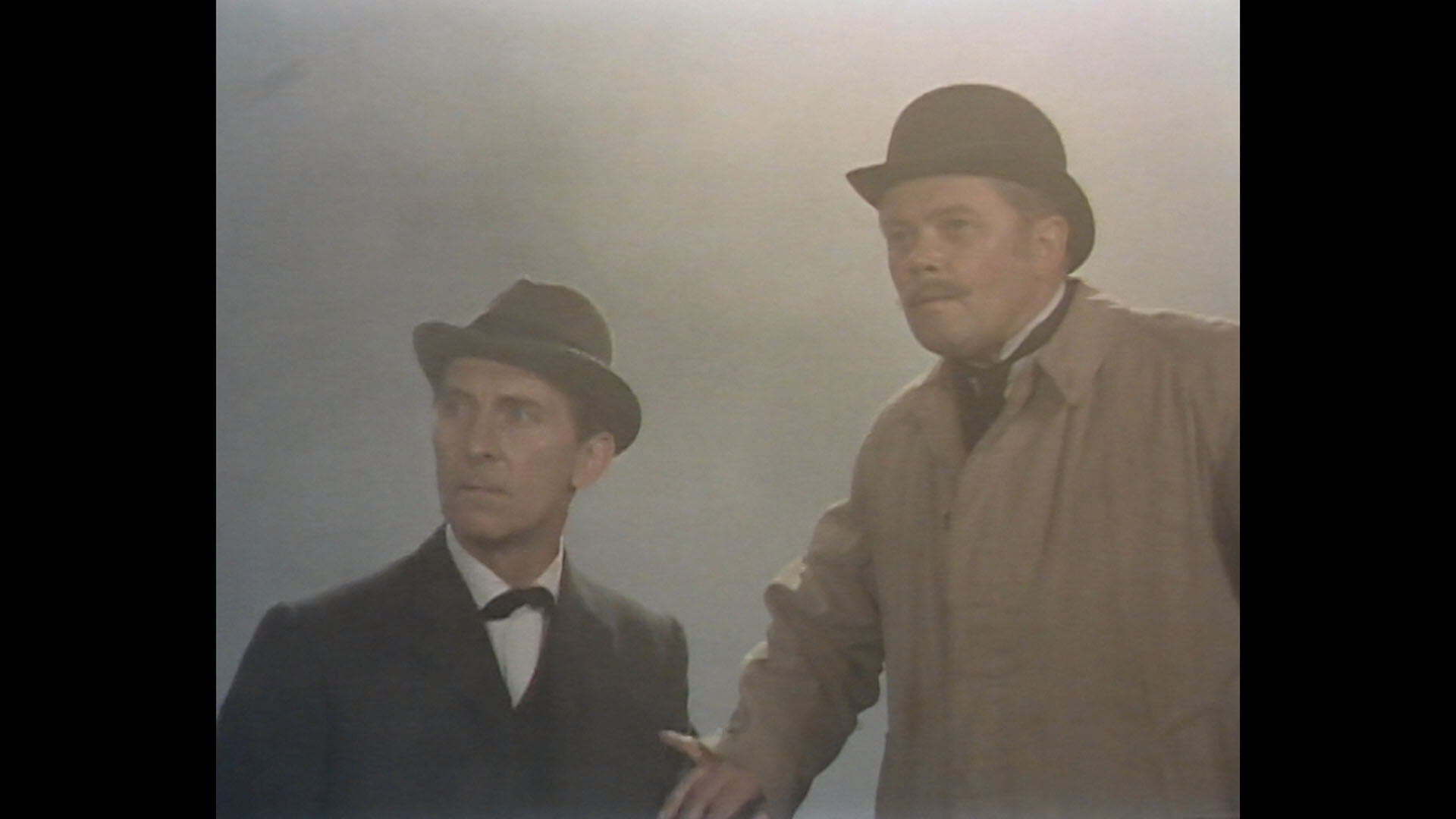 shows looking as good as they could given the fact that they were shot on tape and come from the only surviving masters, while extracts of otherwise lost tales are also included. We start off with "episode 1," the earliest surviving of the '68 run and the third one to be aired: A Study in Scarlet (50m26s), in which Holmes and Watson are summoned to an abandoned house where a dead American has been discovered with the word "RACHE" written in blood on the wall. The death by poisoning and a woman's ring lead our heroes on a trail of conspiracy involving an international crime ring. The first written Holmes story, this one has been adapted many times (most definitely in the later TV series with Jeremy Brett) and is still plenty of fun to watch here with Cushing (frequently sporting a top hat and gloves) still in fine form as Holmes almost a decade after his first classic interpretation for Hammer in 1959's The House of the Baskervilles. (Incidentally, a much older Cushing played Holmes again as a one-off production in 1984, The Masks of Death, which was everywhere on VHS back in the day). This episode (which looks nice apart from some occasional rolling tape damage) can be played with an optional 30-second countdown clock and sports a new commentary by Kim Newman and David Stuart Davies, which goes a fine job of untangling the history of this series including its official title and season ranking, the process of licensing Doyle's short stories and novels back then (with anything featuring Moriarty off limits for a while), and the ins and outs of all the participants seen here as well as the narrative traits running throughout this show.