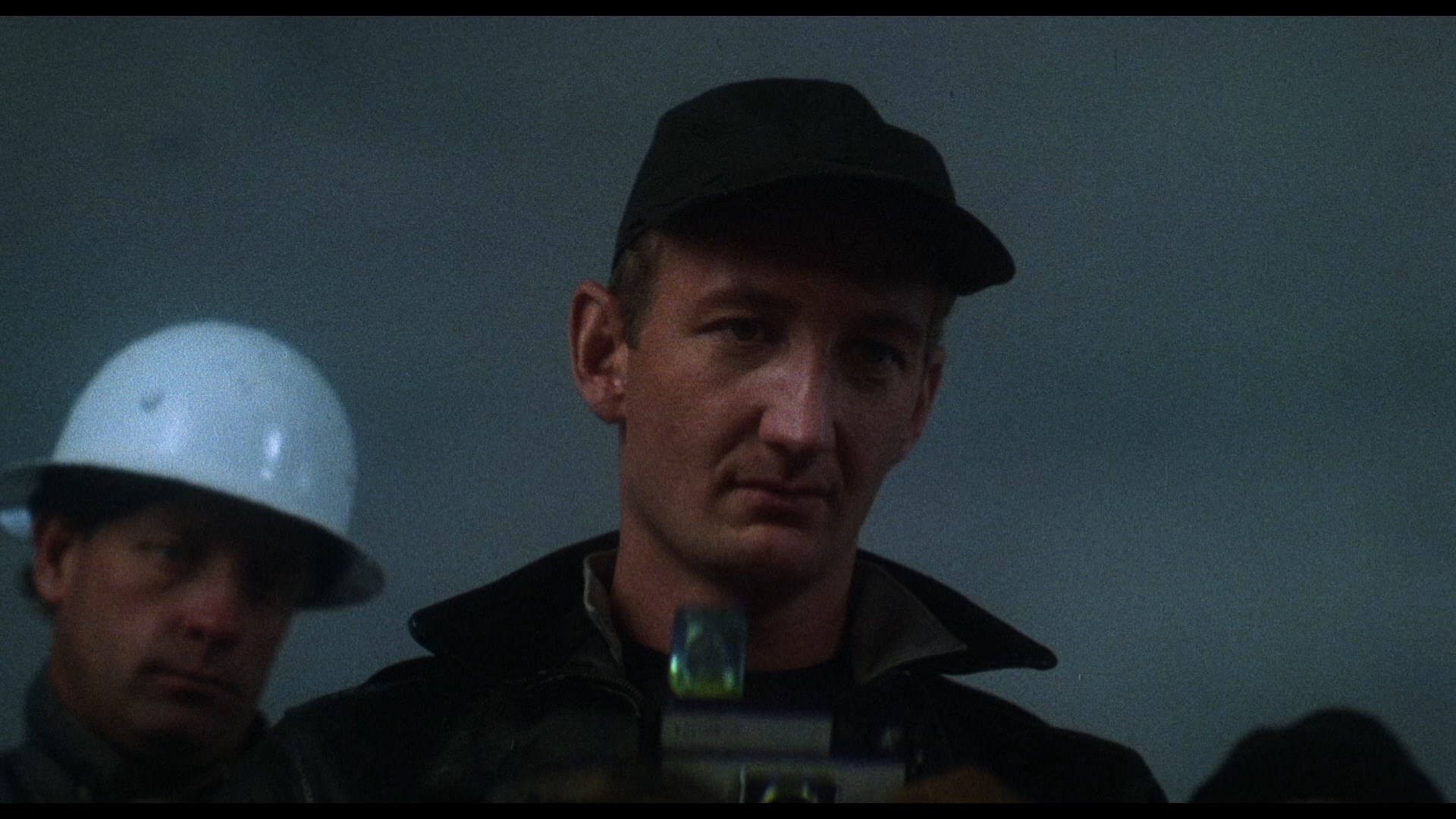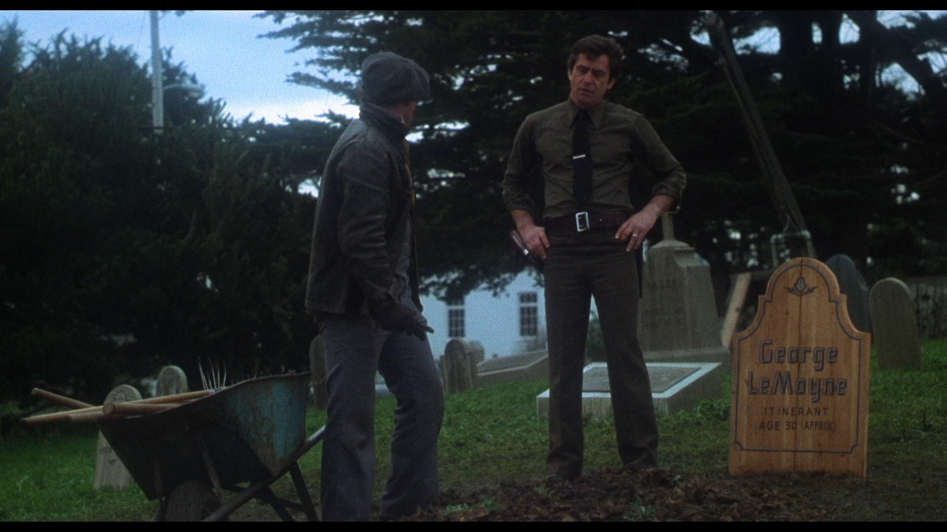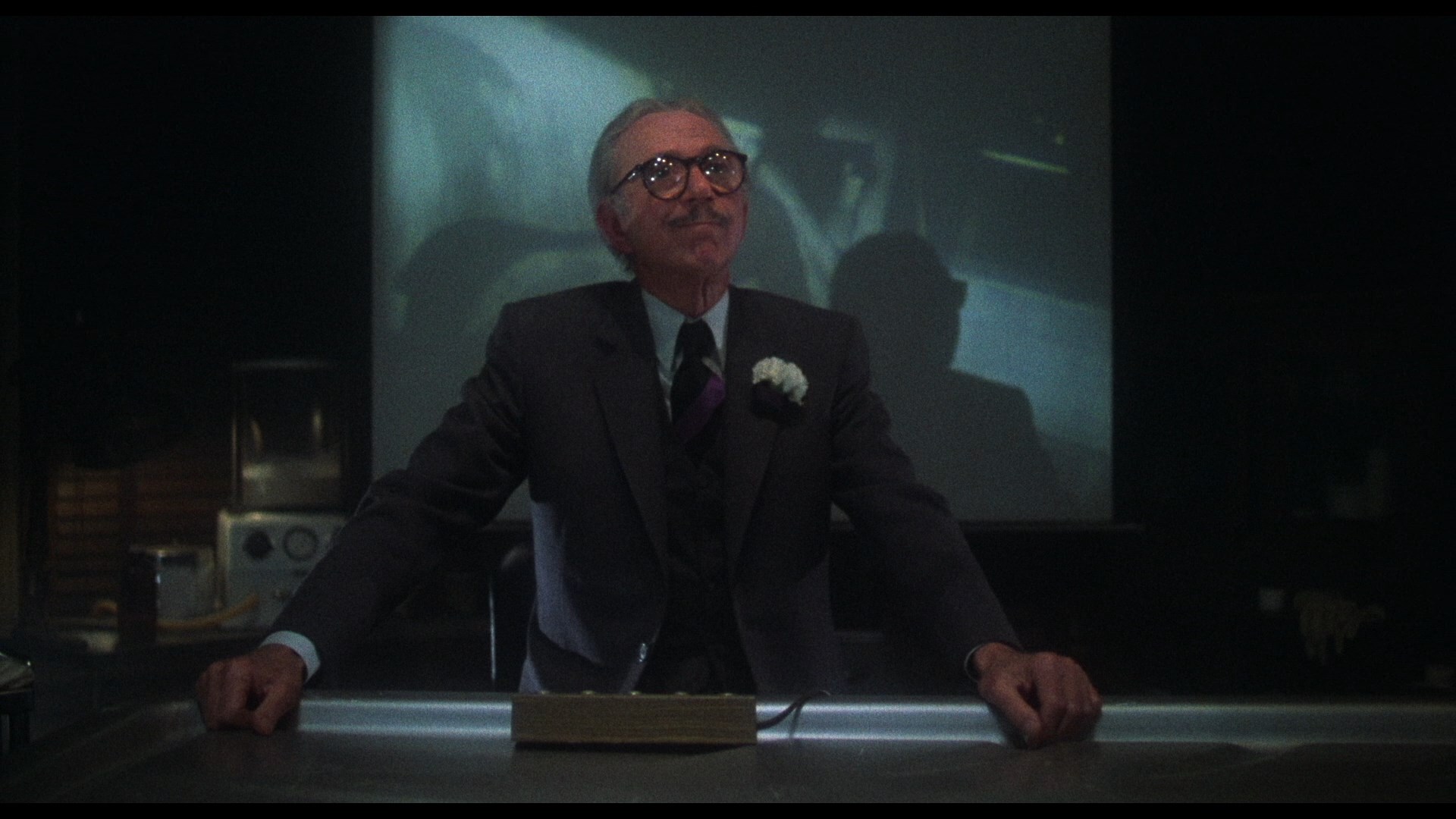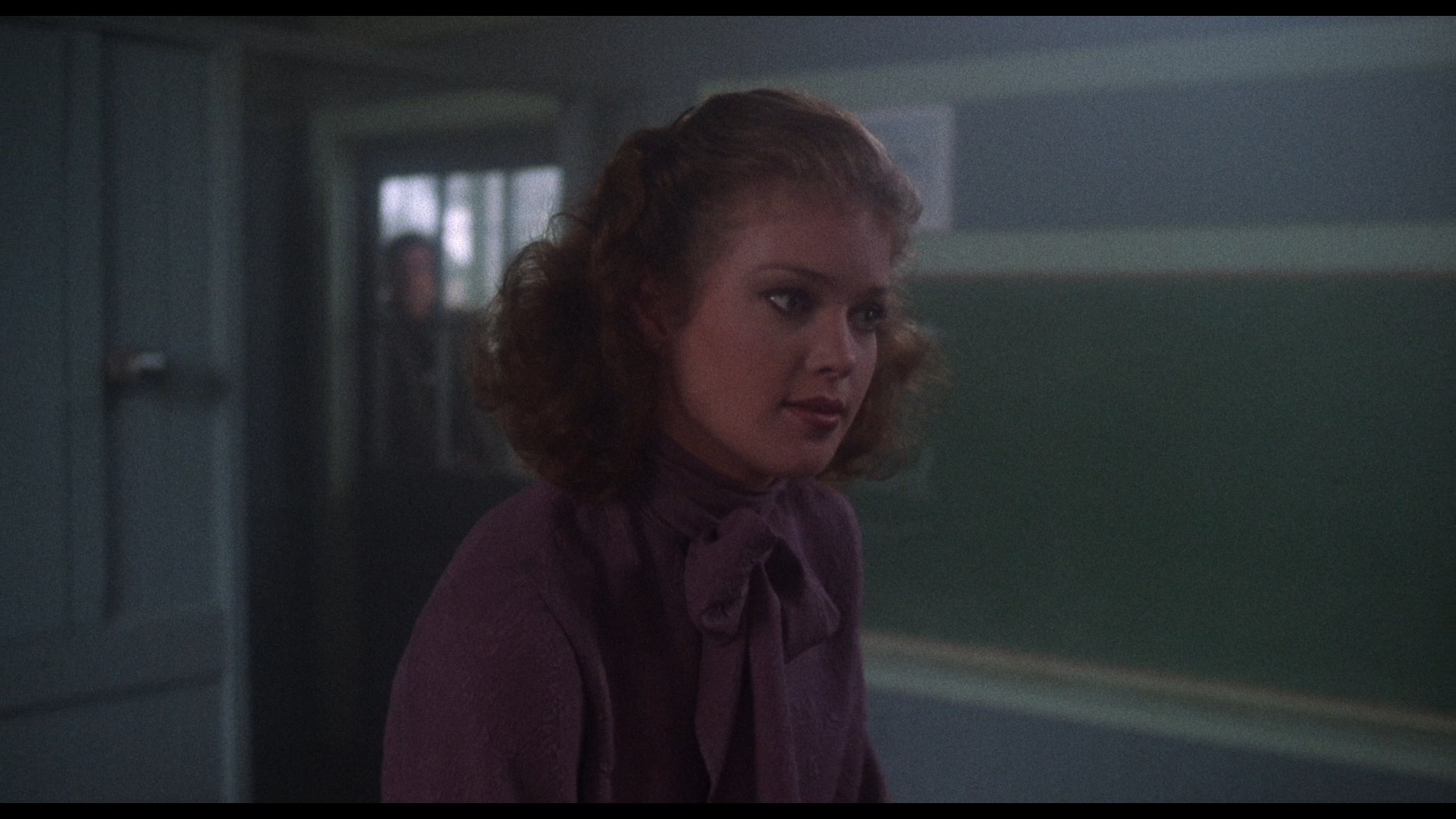 In 2021, Blue Underground finally brought the film to UHD as a three-disc edition (available with three different slipcover designs including a great lenticular version of the needle scene) also containing a remastered Blu-ray and, finally available for the first time ever in any format, Renzetti's magnificent score on CD in its entirety. The new scan is listed as a new 4K 16-bit scan from the 35mm IP, so of course the big question is, how does it look? In a word, spectacular, especially if you're familiar with the challenges posed by this film. The most obvious differences here are more image info visible in the frame and a more balanced color scheme that's less green than before; in motion the grain is also handled wonderfully here with a fine, natural texture that shows just how far technology has come in just over a decade. The UHD sweetens the deal not only with higher resolution over the Blu-ray but with the benefit of Dolby Vision HDR, which brings out even more nuances in the colors and really helps those darker night scenes in particular sing like never before. Just bear in mind that this is a film that makes frequent use of diffusion effects and even filters over the camera in some scenes, and the results here are very satisfying indeed. (Frame grabs in the body of this review are from the 2021 Blu-ray; comparison grabs between the two Blu-rays can be seen at the bottom.) Audio is