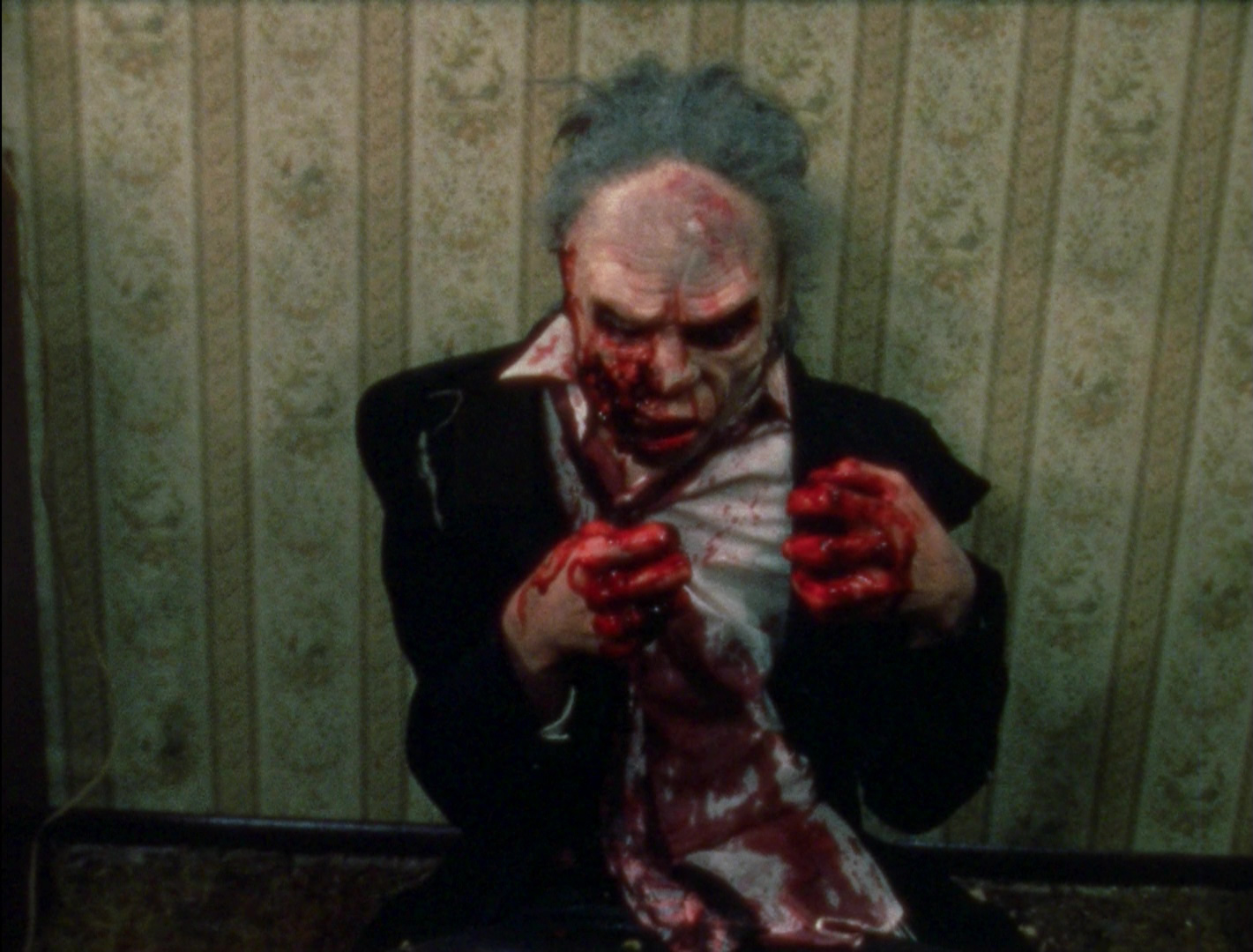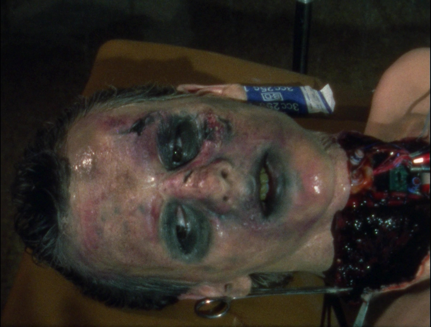 As anyone who viewed the original VHS of The Dead Next Door noticed immediately, the film was shot on film but clearly edited on video with low-grade credits easily marking it as a straight-to-video project of the time. (The opening title card is a particularly obvious offender.) Since no edited version existed on film, the original unprocessed footage had to be exhumed for its DVD premiere in 2005 from Anchor Bay, complete with new credits generated for the opening and closing titles as well as location identifiers. The running time also changed from 82 minutes to 78 due to these changes, so nothing really substantial was altered apart from an aesthetic update. The film elements were still visibly damaged throughout, but at least the DVD marked a big step up in terms of visual quality. Some of the original film elements were lost somewhere along the line, so some shots (mostly cutaways to people running or reacting) had to be sourced from the VHS master, graded as well as possible to match the new transfer. That release includes a