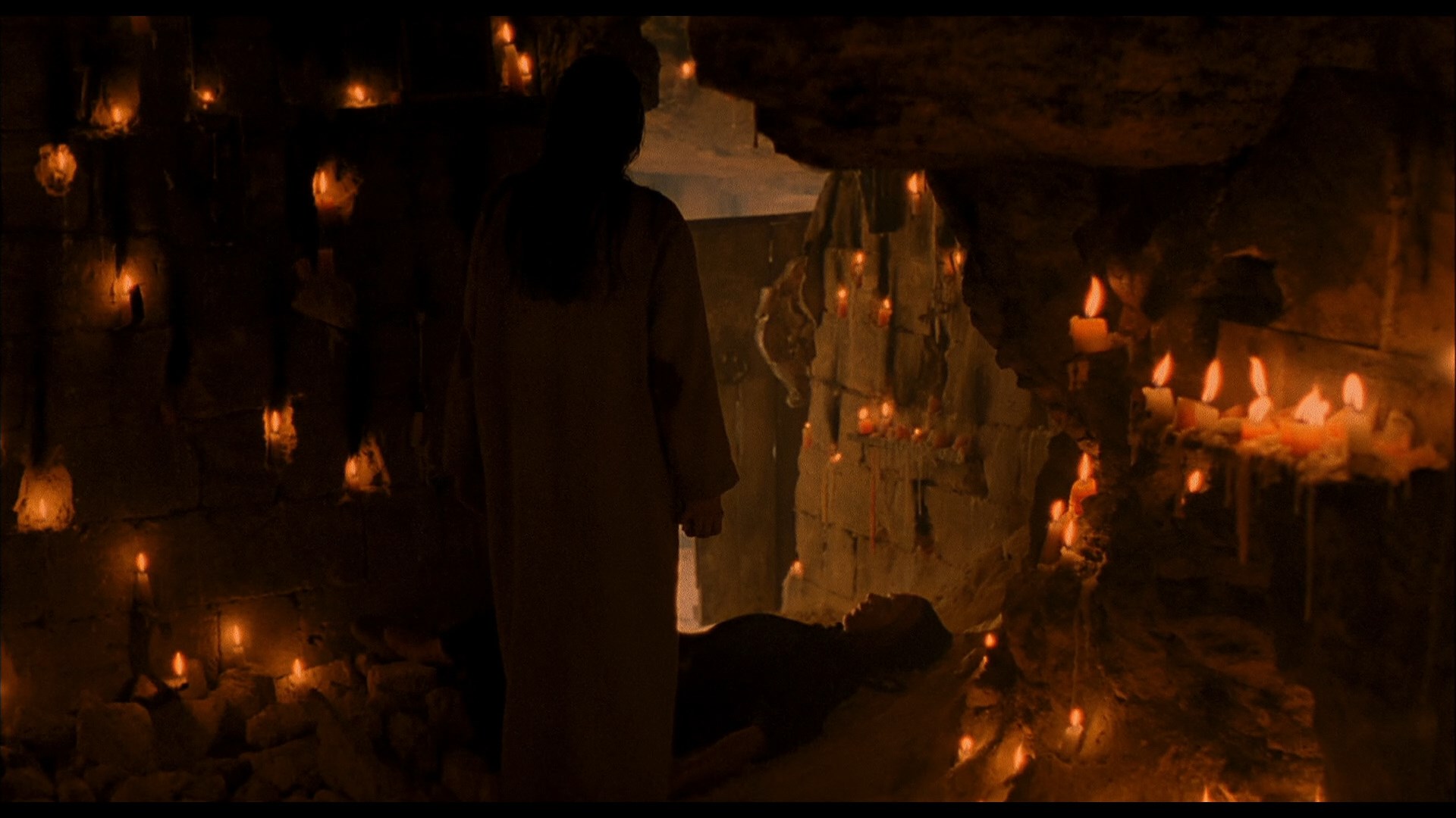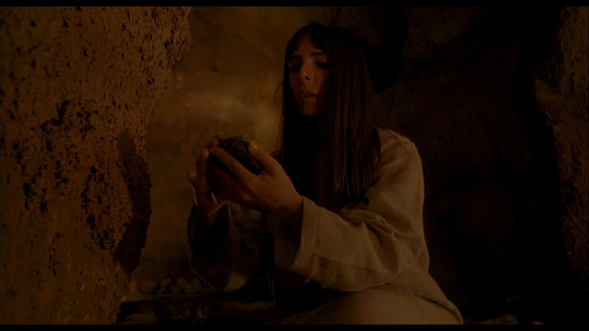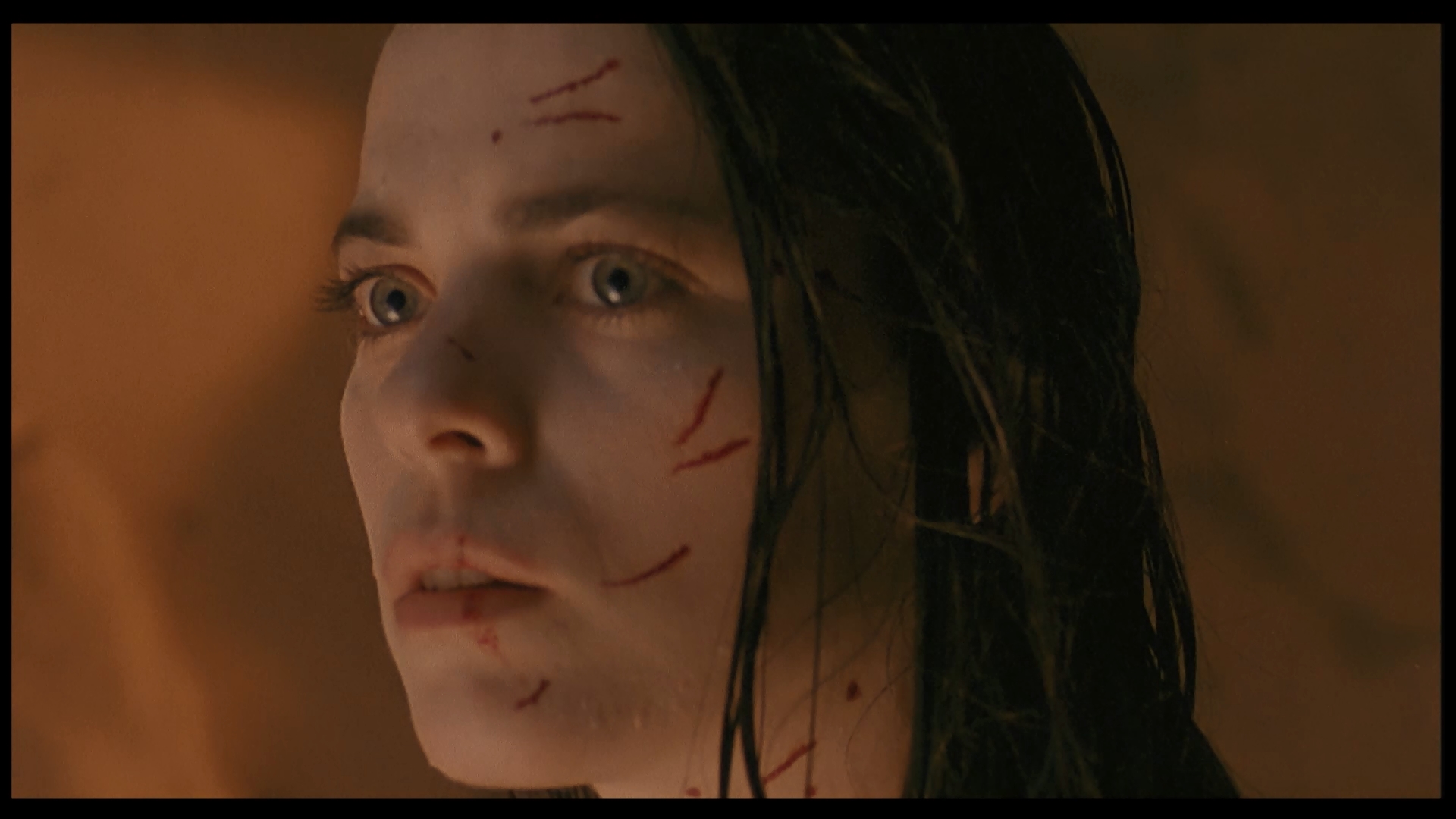 After that release the film fell into obscurity for a while until Severin Films revived it in 2017 for separate Blu-ray and DVD releases that offer the best-looking incarnation of the film, which is still speaking relatively given its video history and the challenges presented by its stylized look that often turned to mud in standard definition. Deep blacks, eye-popping reds and browns, and improved detail all make for a stronger viewing experience transferred from the original negative, though the frequently dark lighting and funky film stock also look even more inconsistent with the heightened resolution. (You can see comparison frame grabs from the DVD by clicking here or here.) The bit rate is consistently beefy but the film often has a coarse, chunky texture to it that's less evident in motion than in frame grabs but definitely odd looking; given the film's threadbare technical capacity with the Ukraine film shoot, this may be about as good as it gets. Like the DVD, the image is slightly windowboxed. Oddly the English stereo audio is only presented in lossly Dolby Digital 2.0 while the commentary is ported over in LPCM, which seems a bit backwards; optional English subtitles are included.